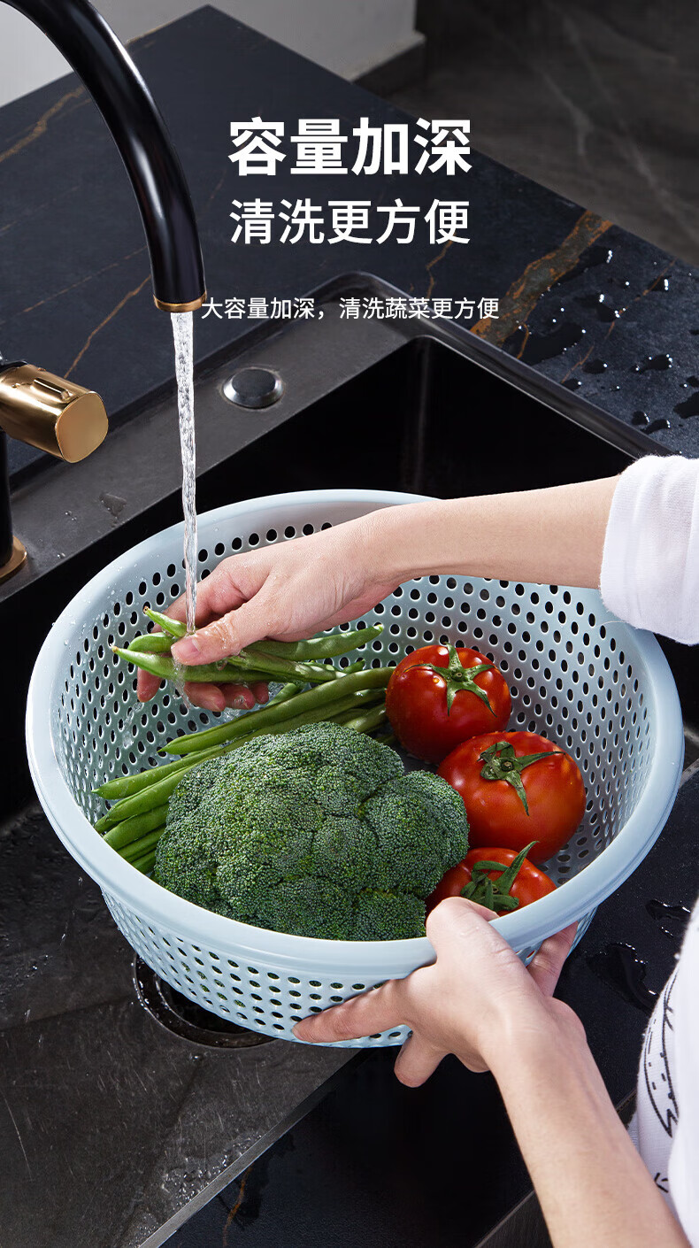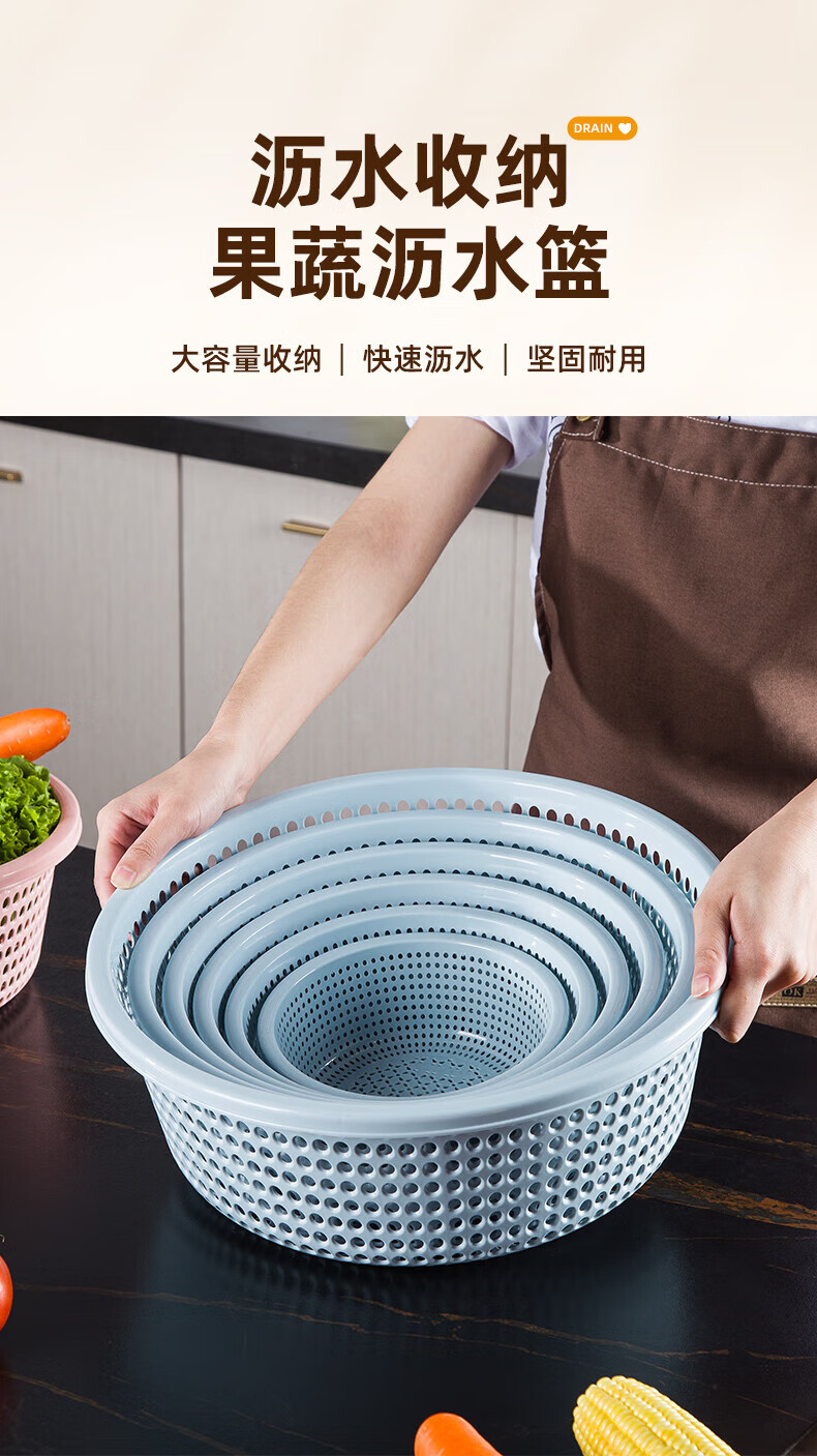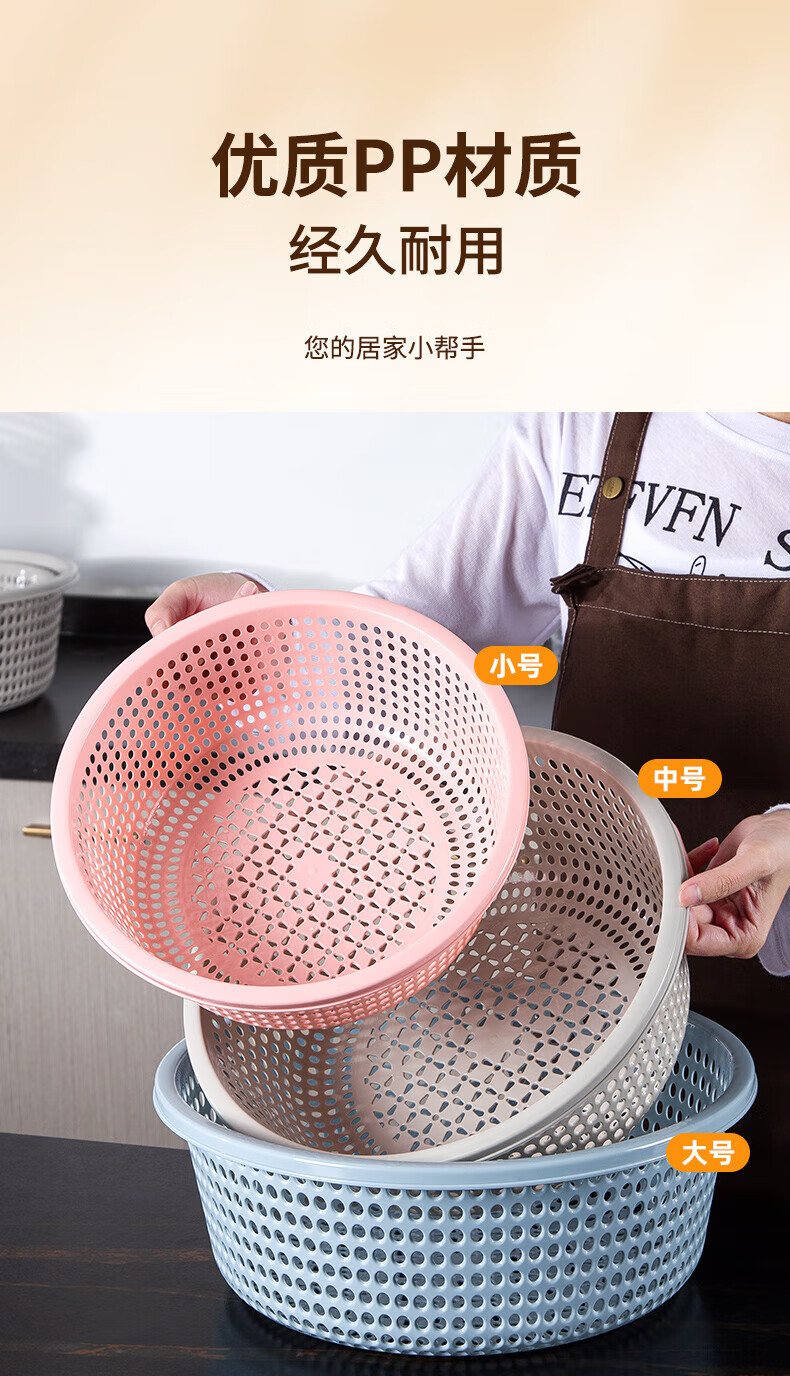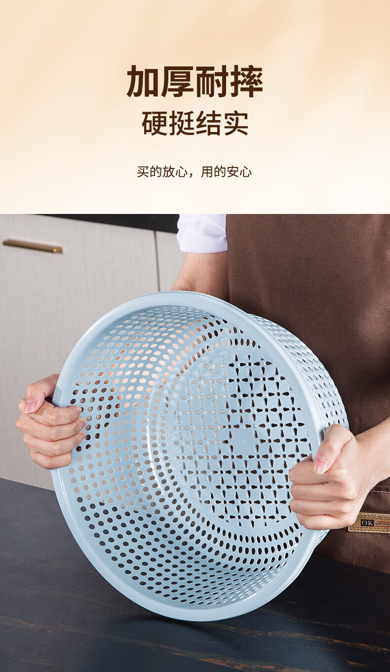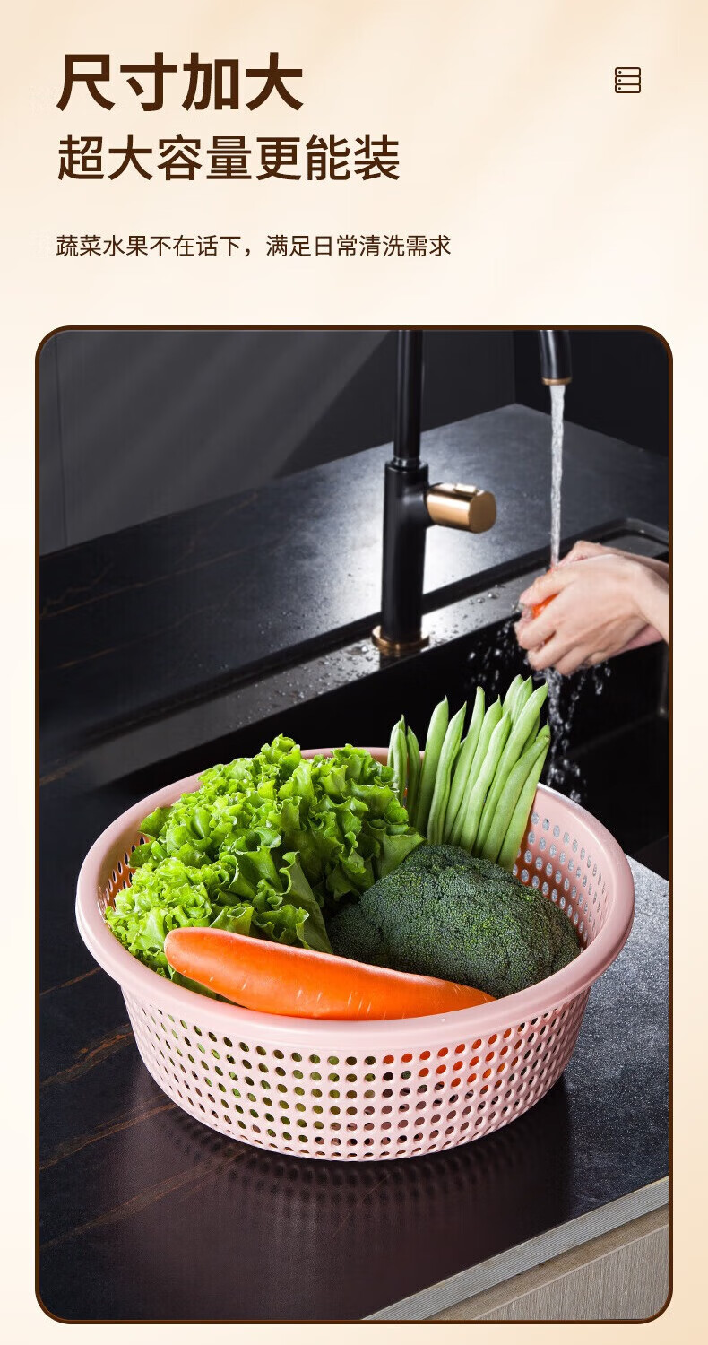 Tanqi kitchen drain basket plastic fruit washing sieve vegetable sieve household vegetable basin extra thick round hollow vegetable basket three-piece set pastoral powder large single (41cm)