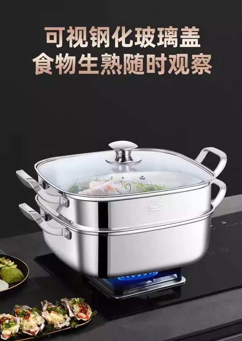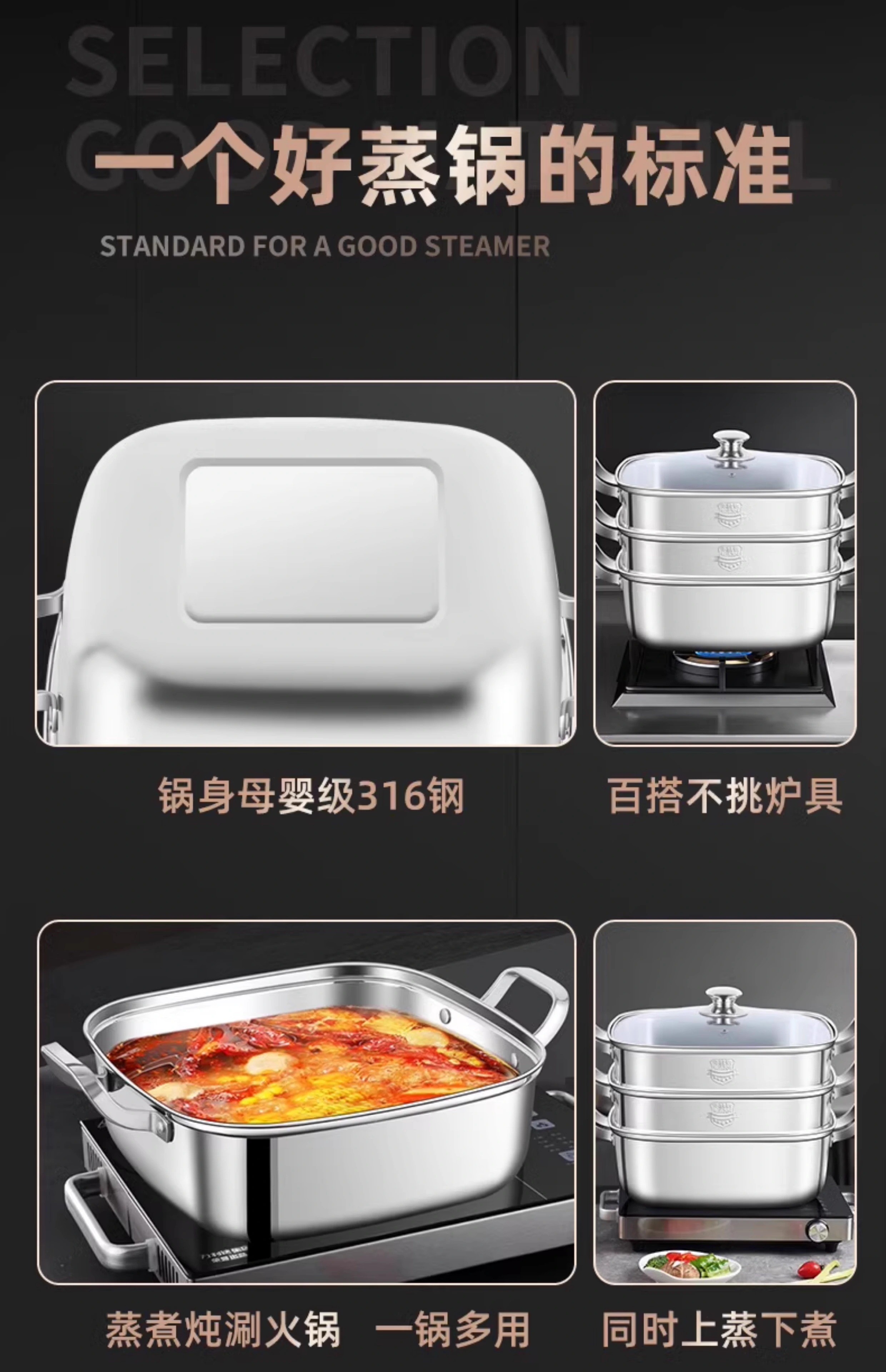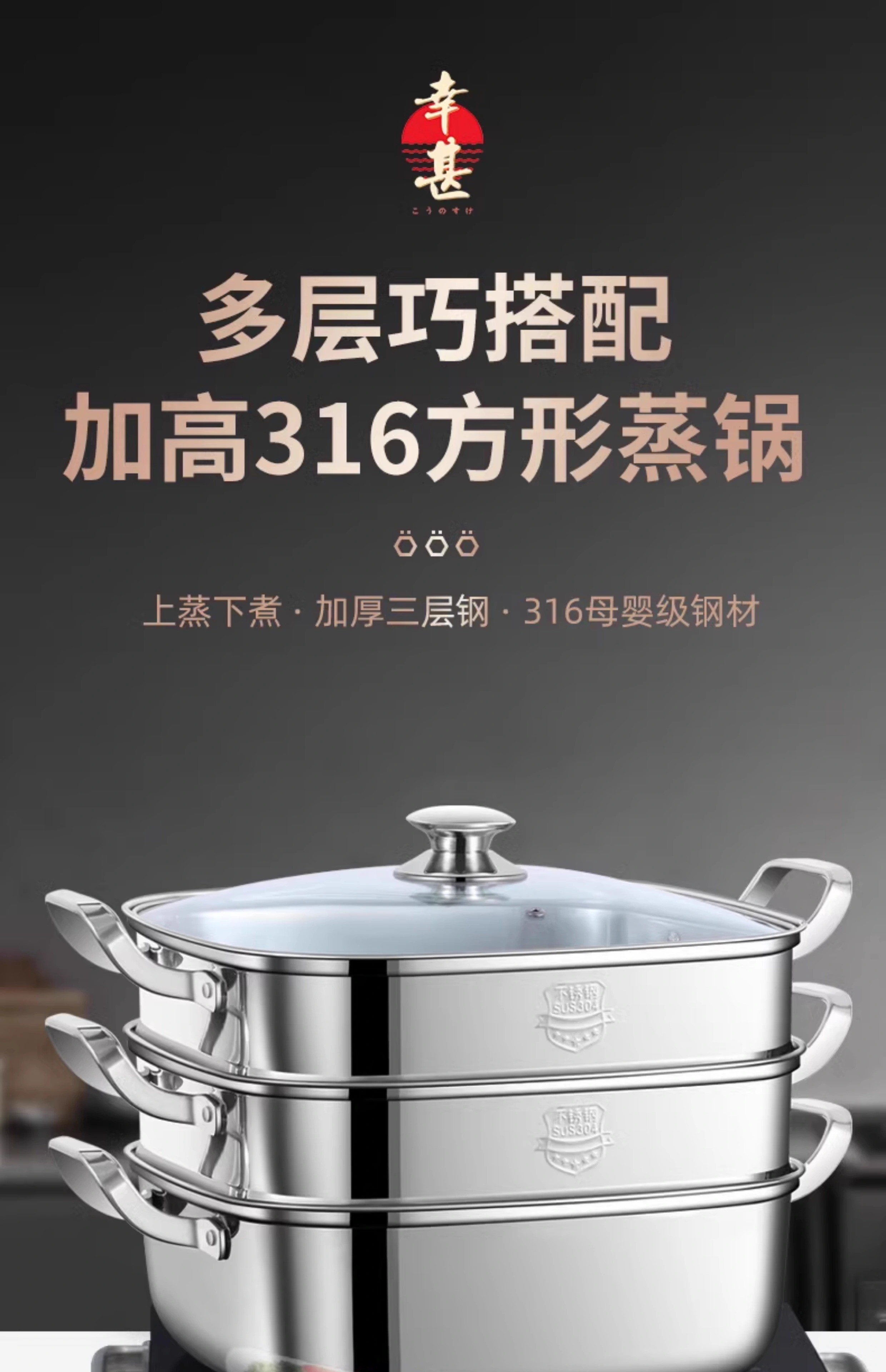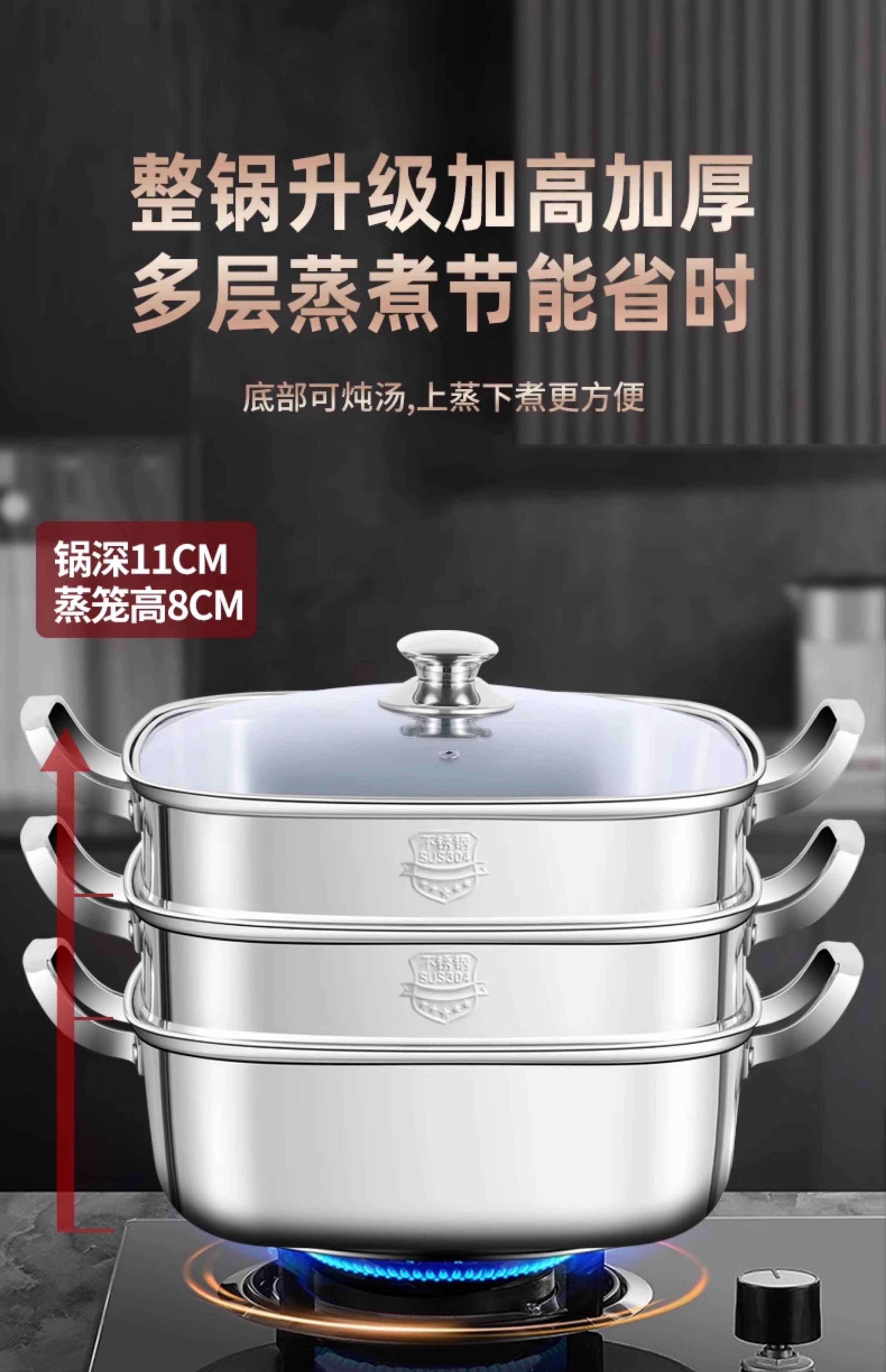 Fortunately, Japanese brand stainless steel steamer household square steamer three-layer large-capacity steamer gas stove induction cooker universal 4-6 people 316L square steamer 3 layers 30cm