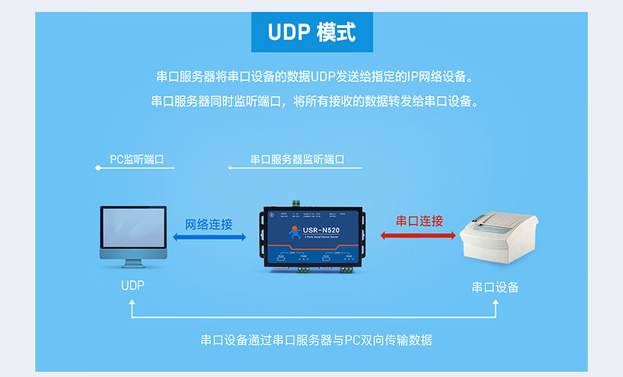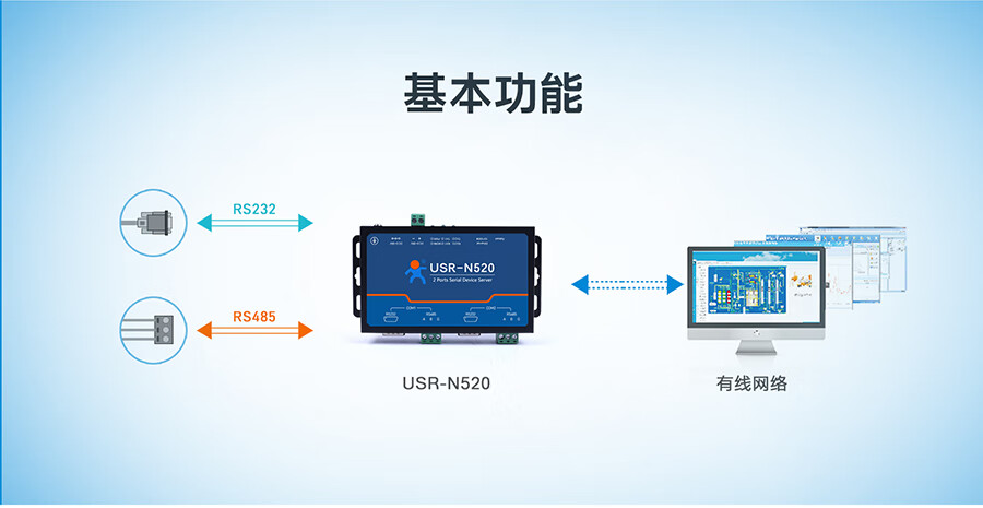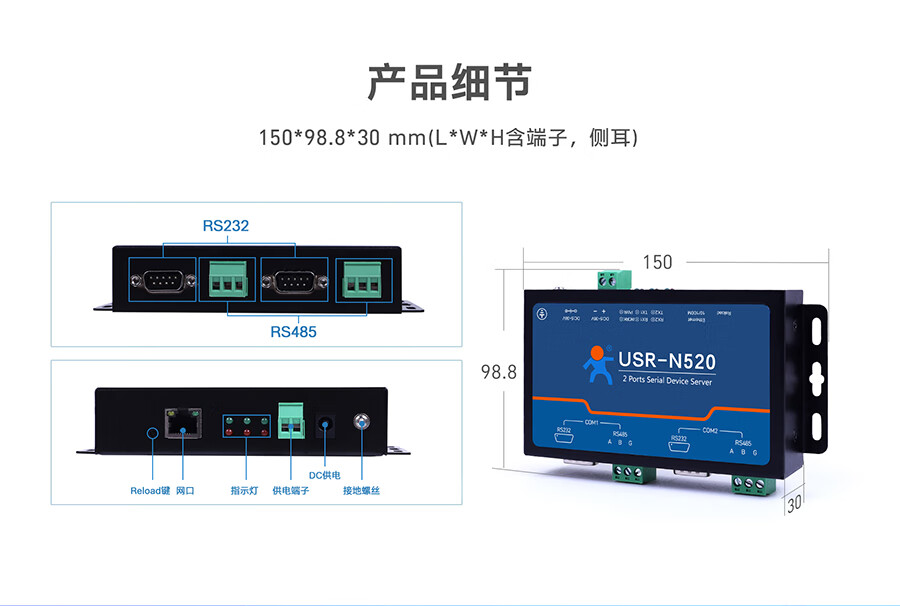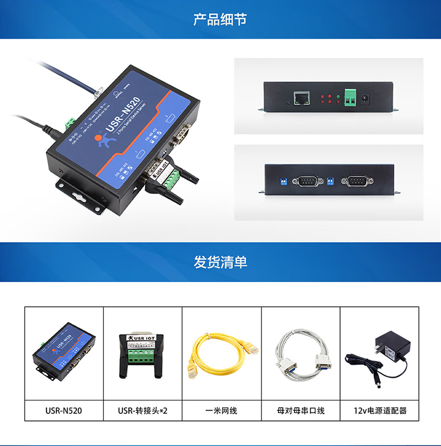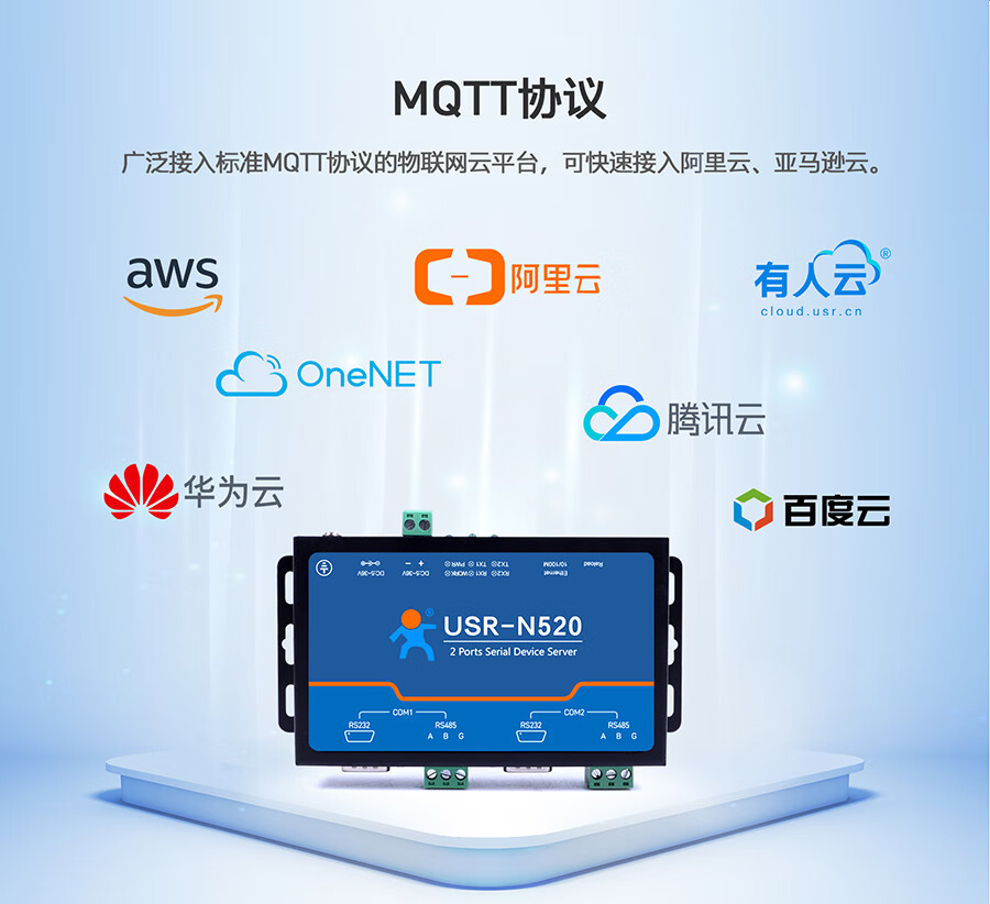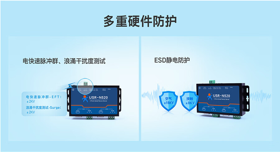 IoT MQTT protocol RS232/485/422 optional dual serial port server multiple protection USR-N520 USR-N520-H7-6