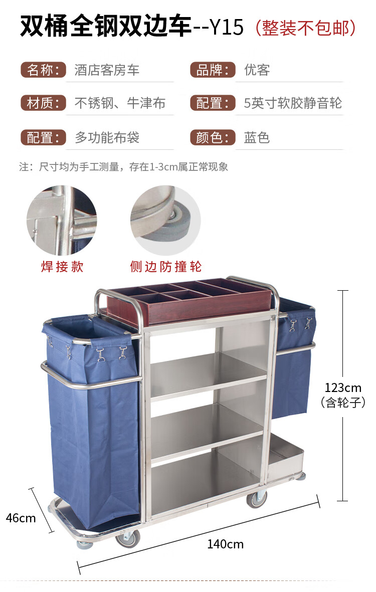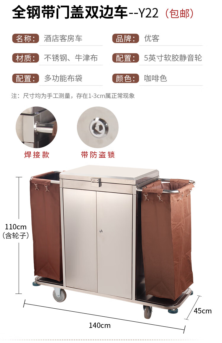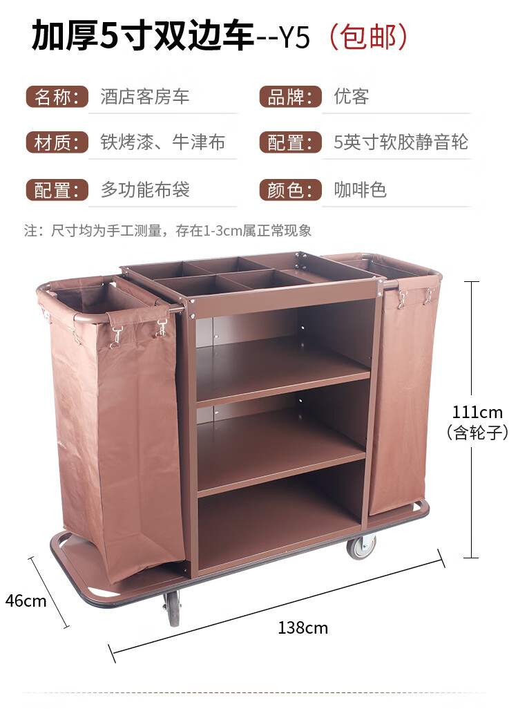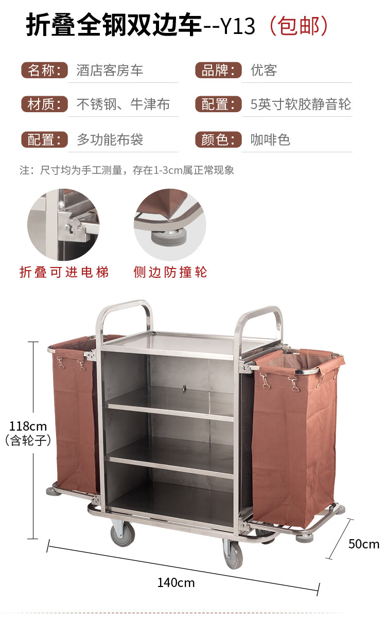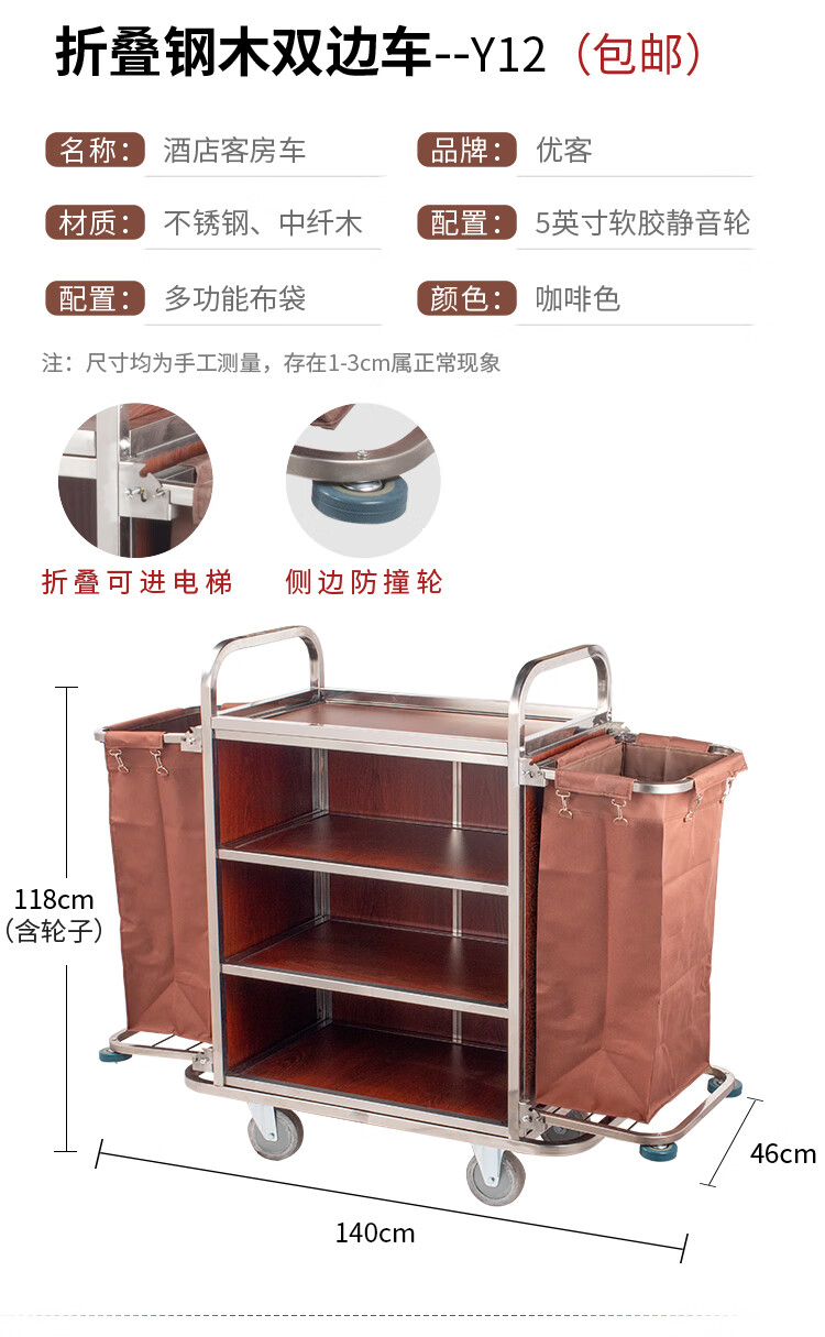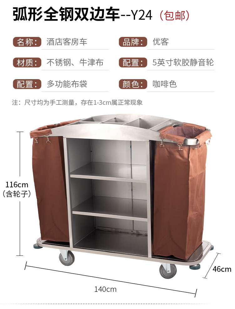 Hotel linen cart, guest room special work cart, hotel stainless steel service cart, cleaning cart, cleaning cart, black, exchange for multi-pocket bags, contact customer service