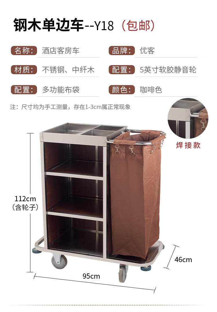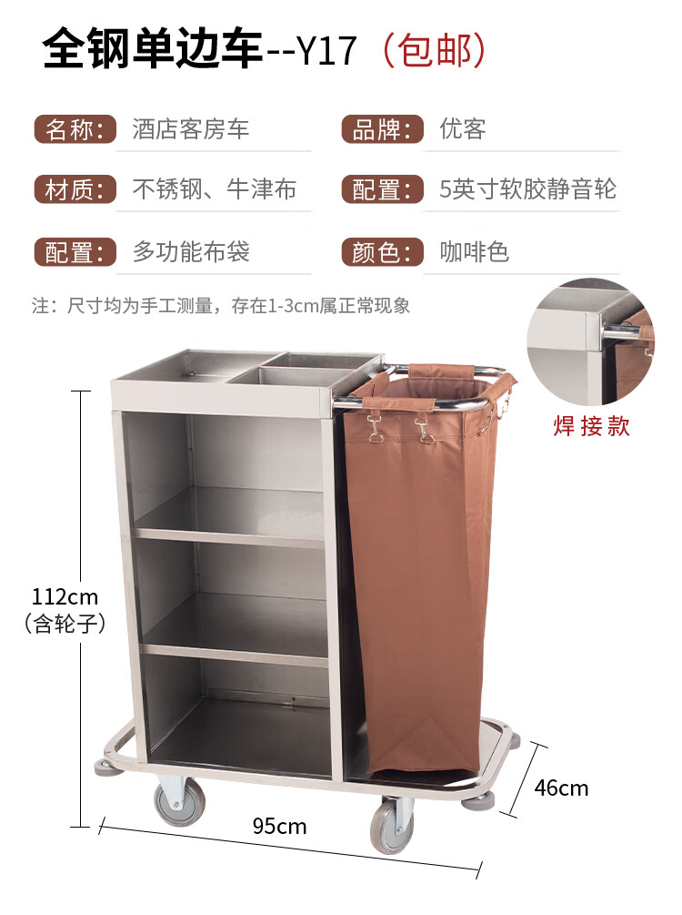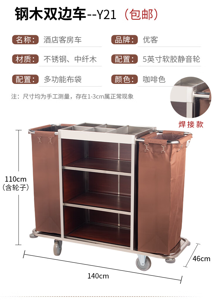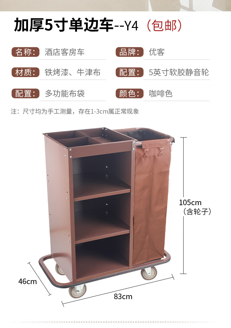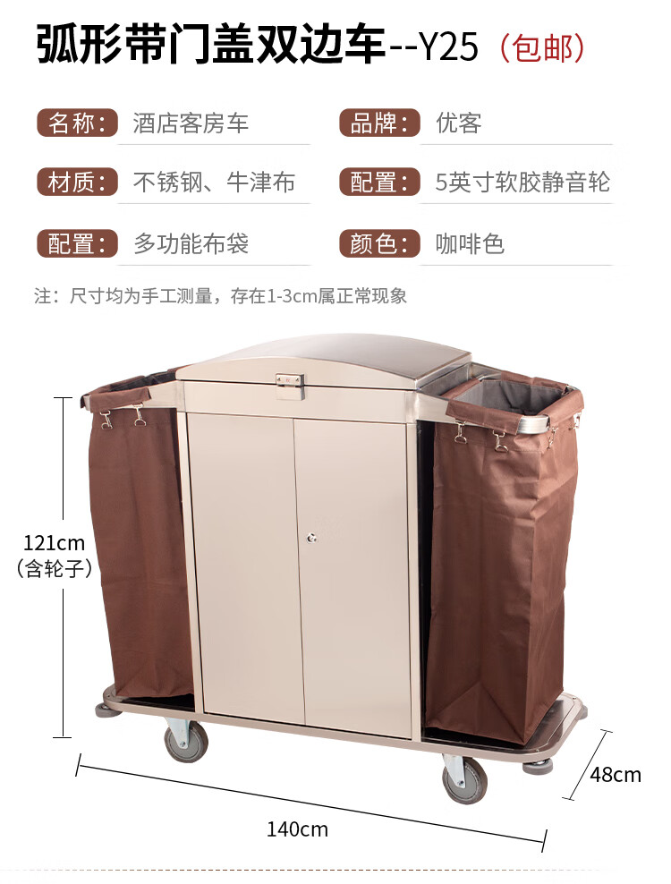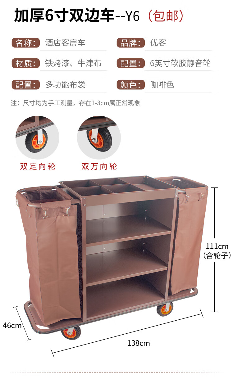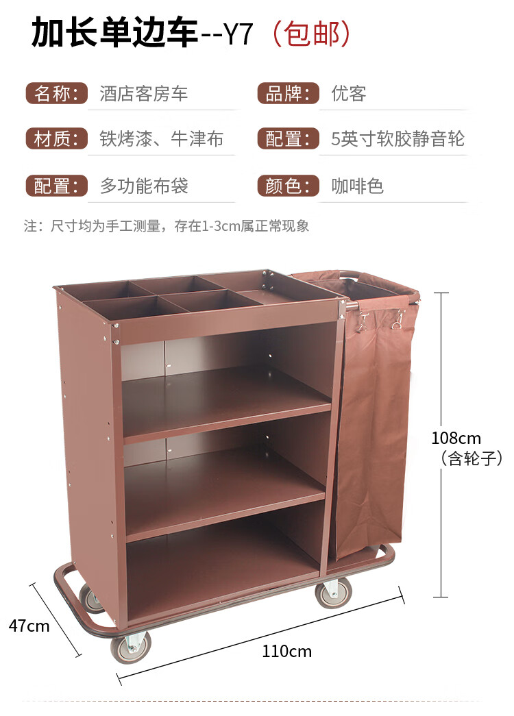 Hotel linen cart, guest room special work cart, hotel stainless steel service cart, cleaning cart, cleaning cart, black, exchange for multi-pocket bags, contact customer service