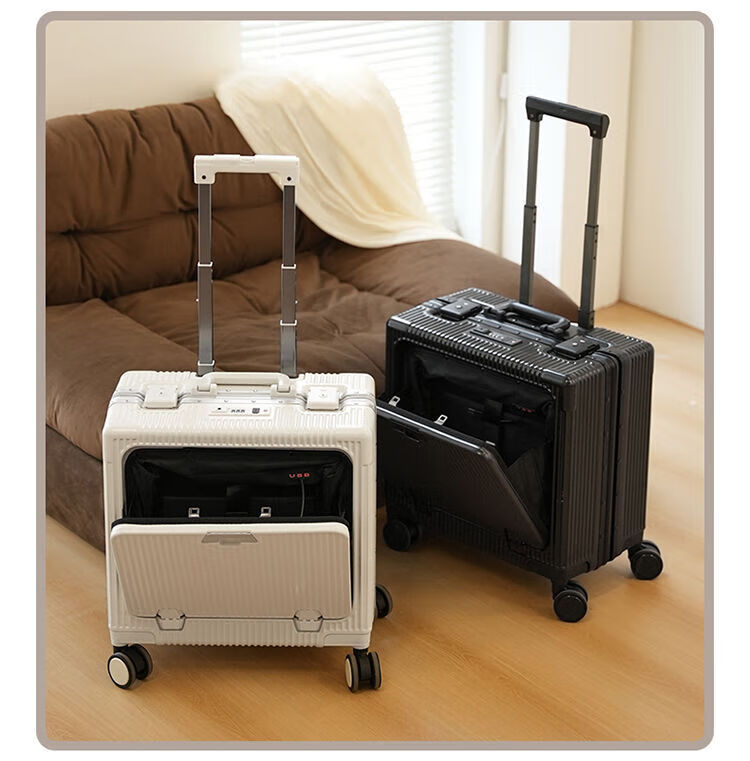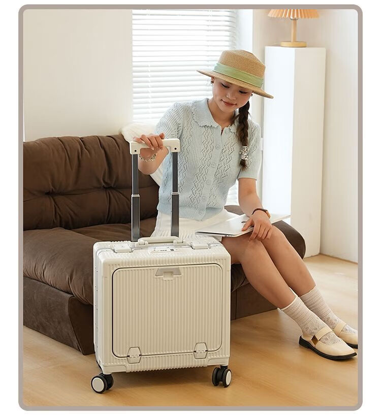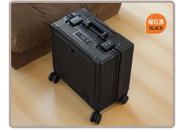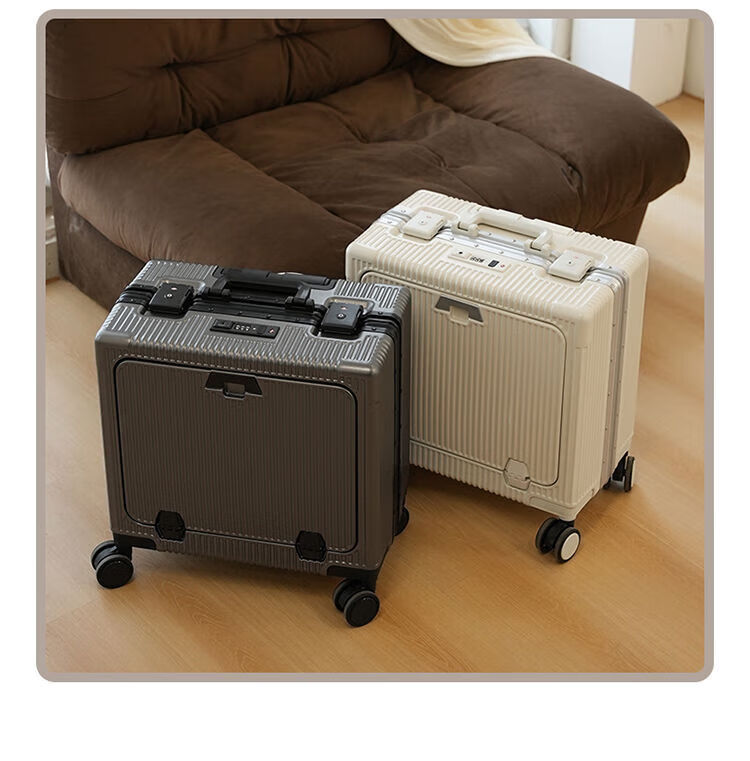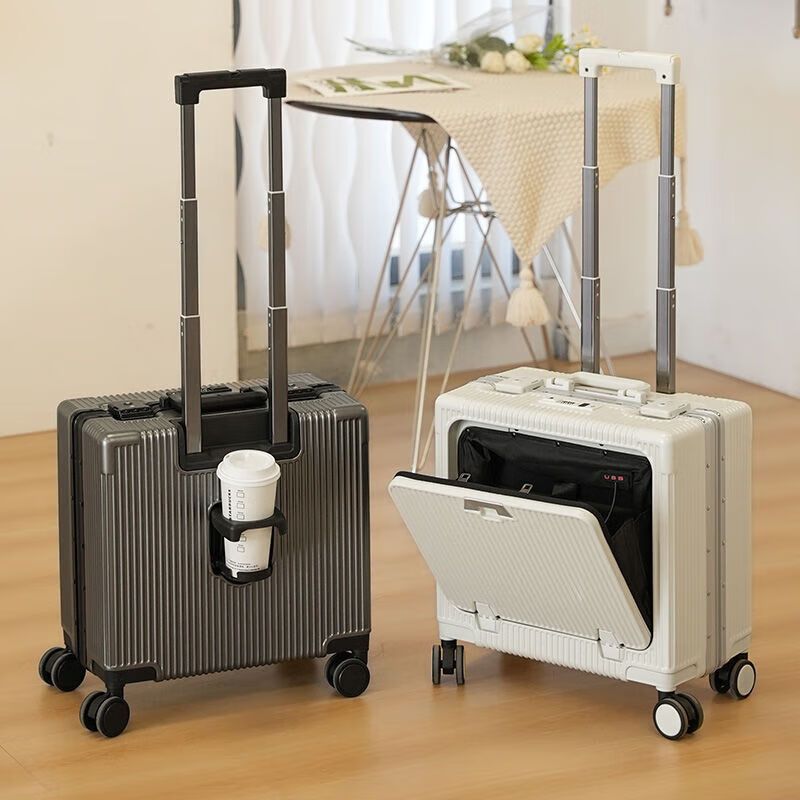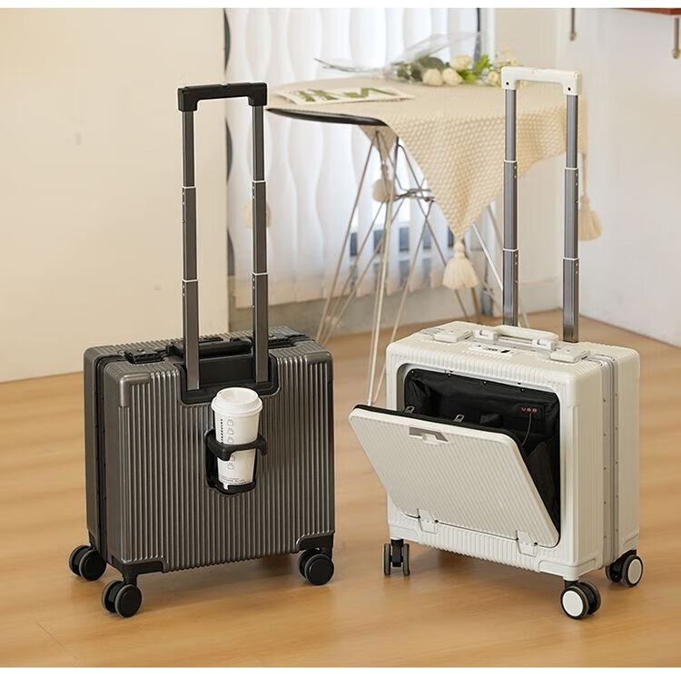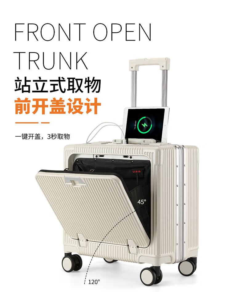 Ouyao front-opening suitcase, multifunctional small light business trolley case, can be put on the plane with side opening for computer suitcase, high-grade gray, USB charging port + rear water cup holder, 18-inch horizontal style/free checked boarding case