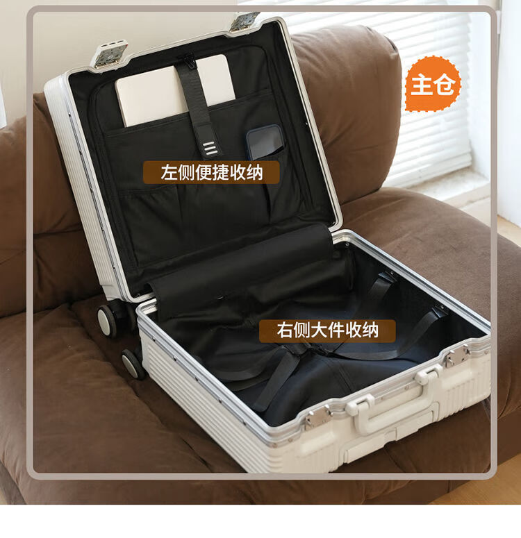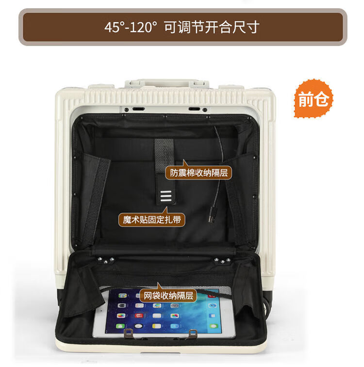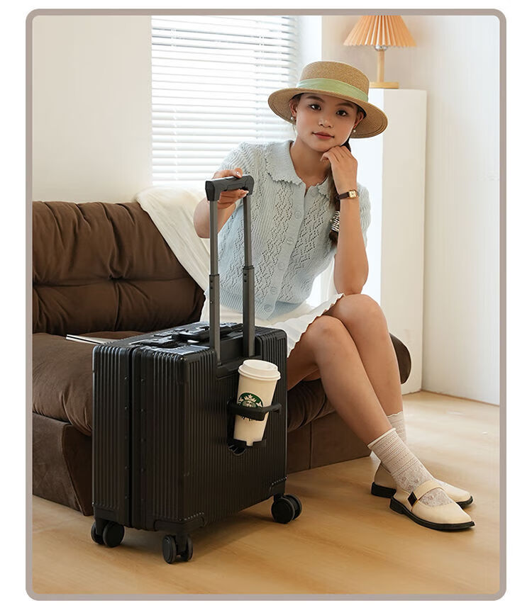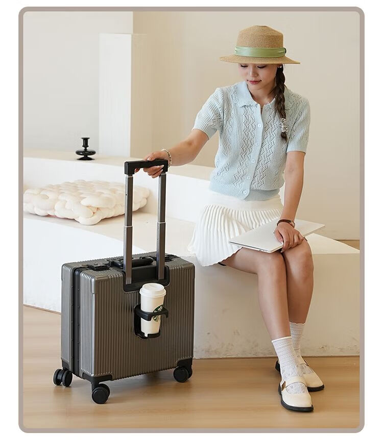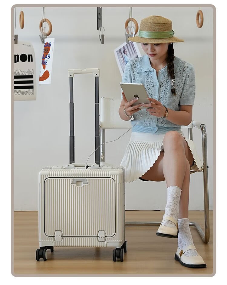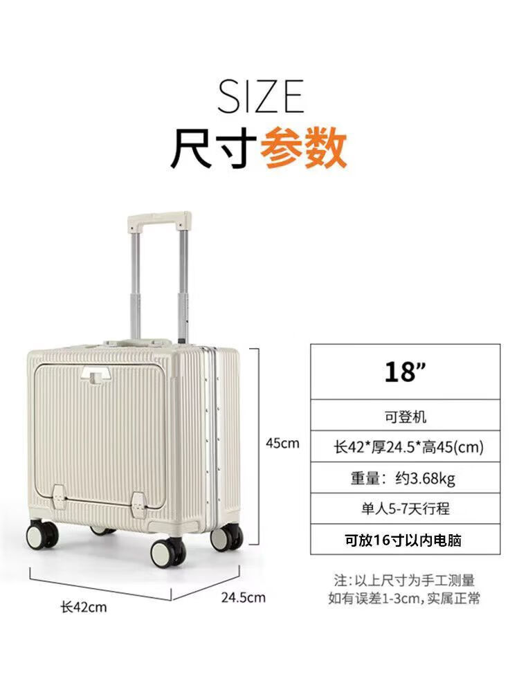 Ouyao front-opening suitcase, multifunctional small light business trolley case, can be put on the plane with side opening for computer suitcase, high-grade gray, USB charging port + rear water cup holder, 18-inch horizontal style/free checked boarding case
