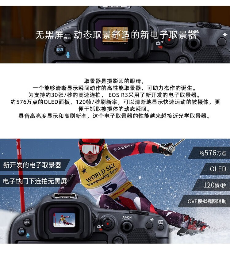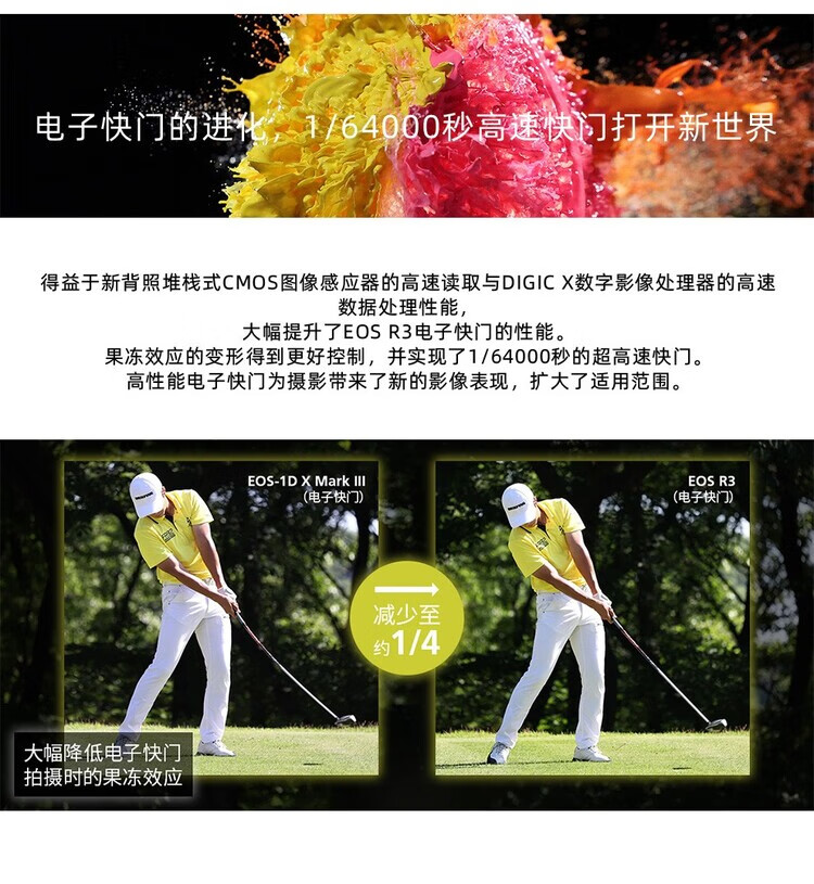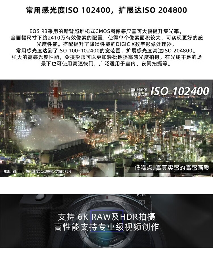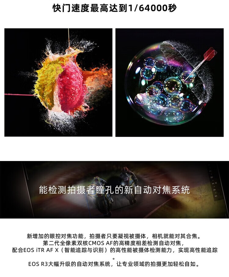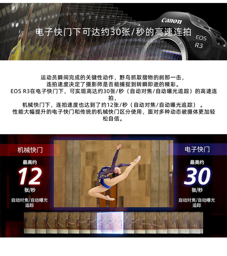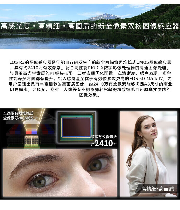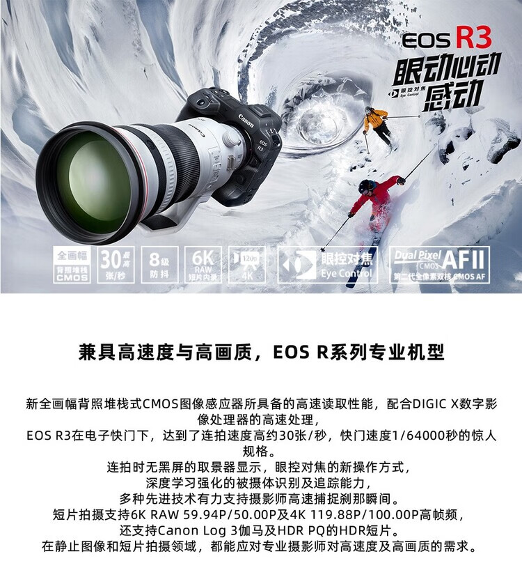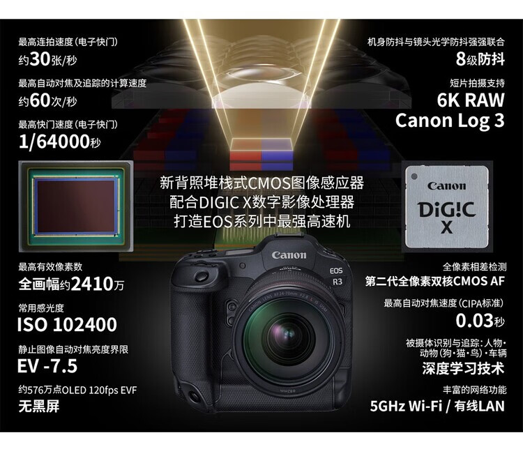 Canon EOS R3 mirrorless camera, full-frame mirrorless camera, 6K video shooting, 30 fps high-speed continuous shooting, 8-level anti-shake, eye-controlled focus, EOS R3 single body (new and unopened in original packaging, lens not included), official standard configuration, no memory, only factory configuration, please see the package introduction for details.