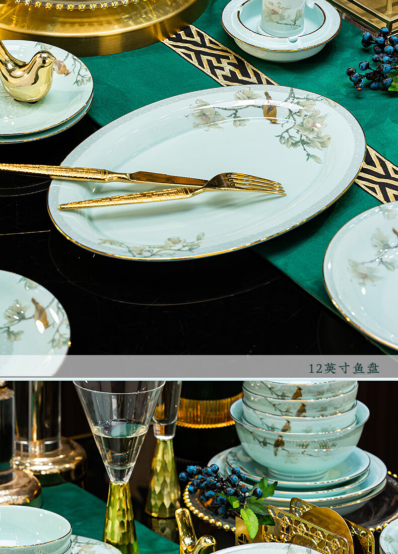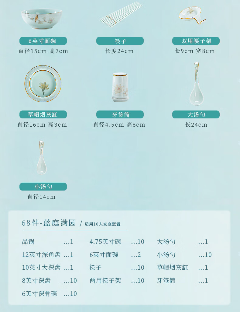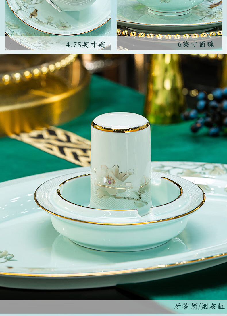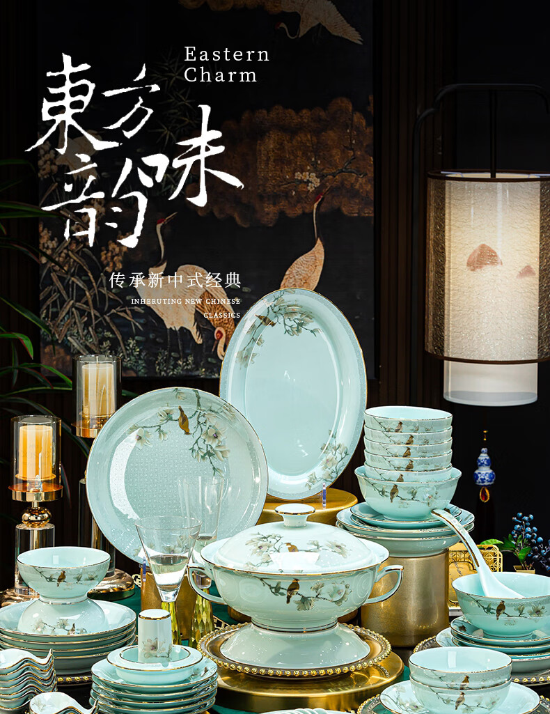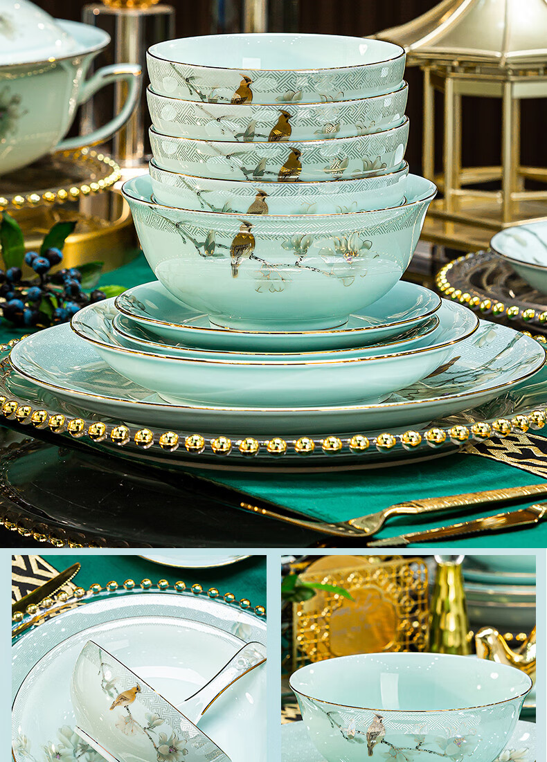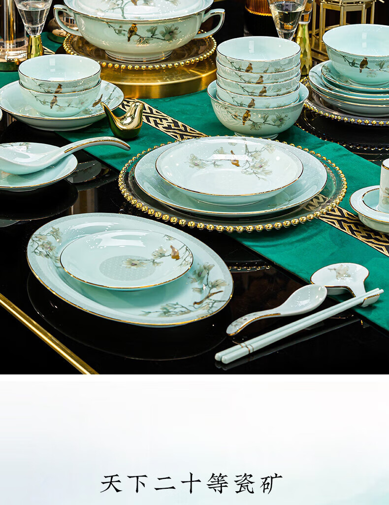 Jingci Jingdezhen Chinese celadon tableware set chopsticks dishes bowls high-end hotel housewarming wedding gift Celadon blue garden full of food for 10 people丨 68 heads