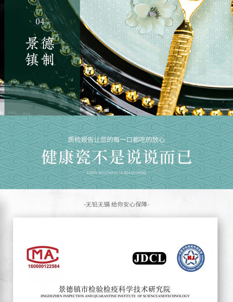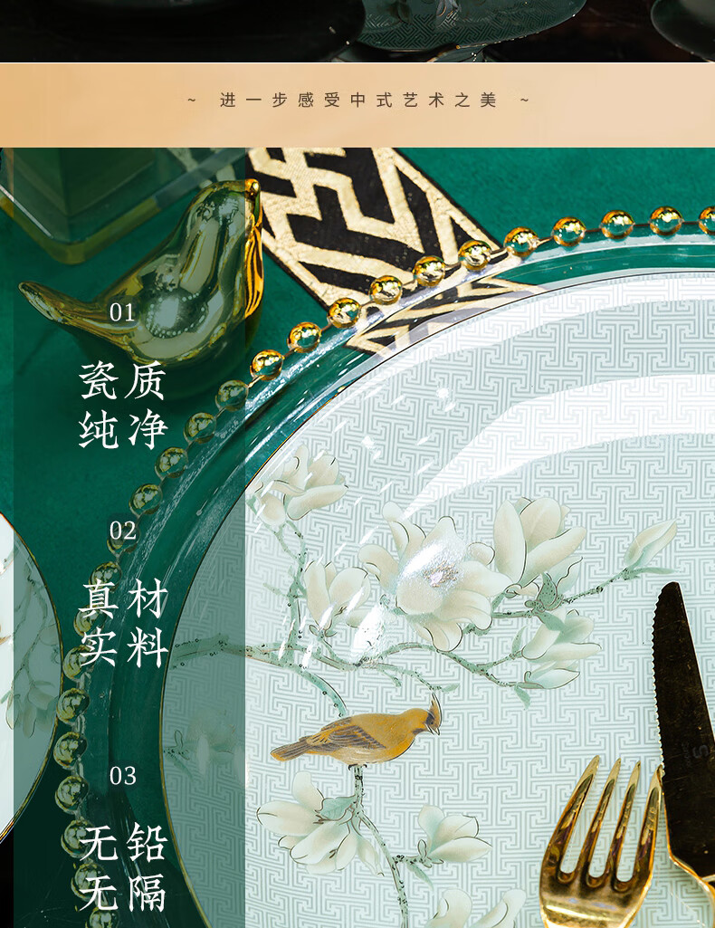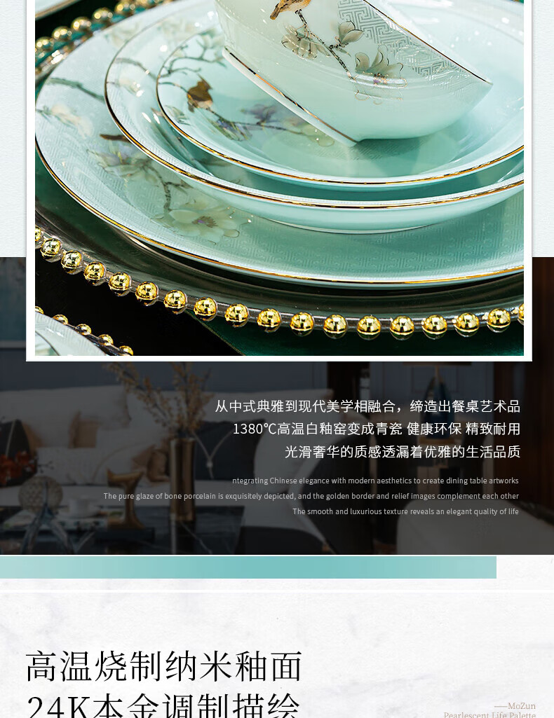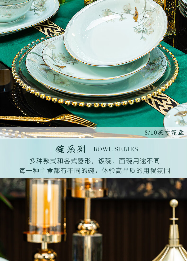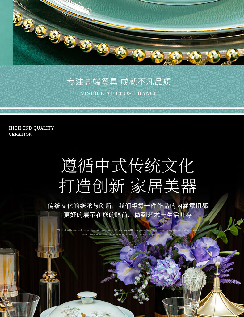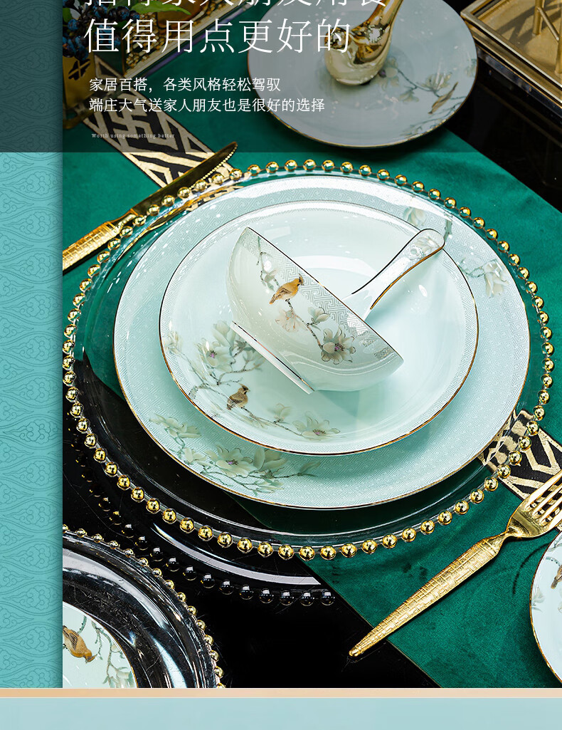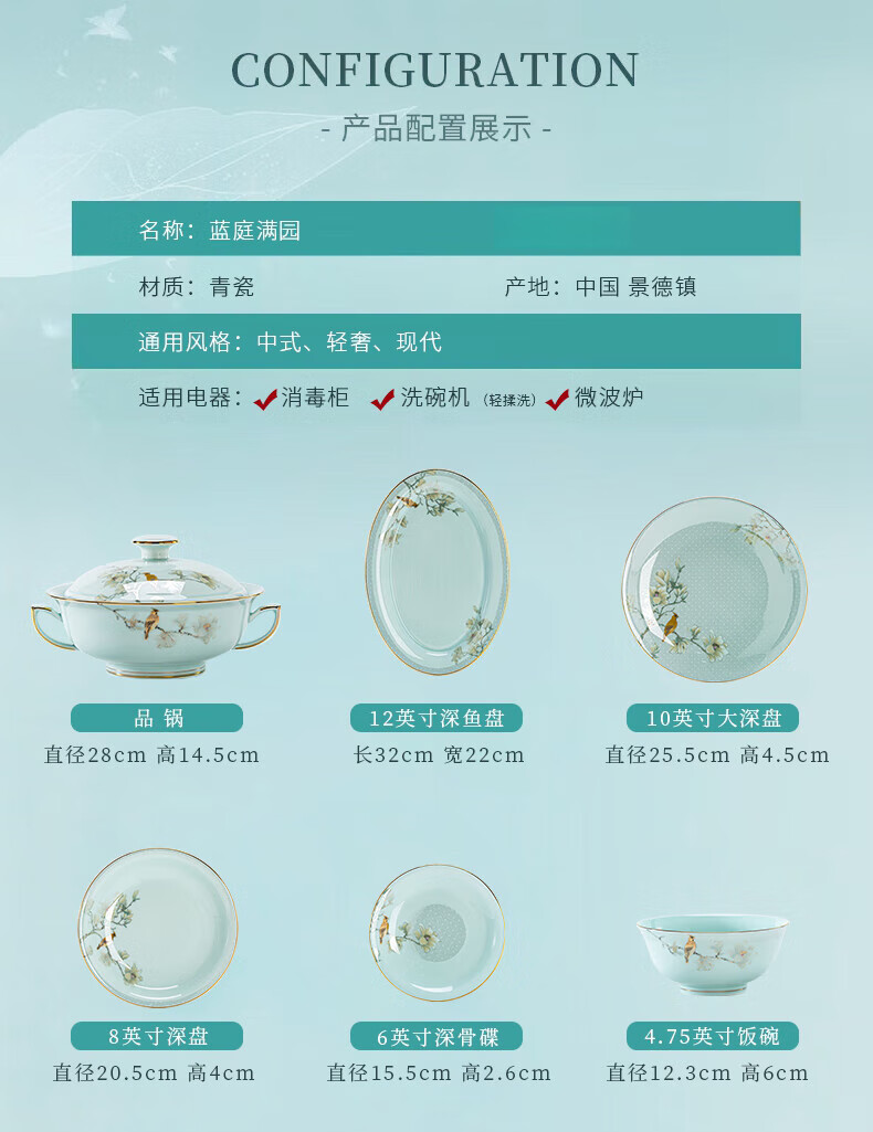 Jingci Jingdezhen Chinese celadon tableware set chopsticks dishes bowls high-end hotel housewarming wedding gift Celadon blue garden full of food for 10 people丨 68 heads