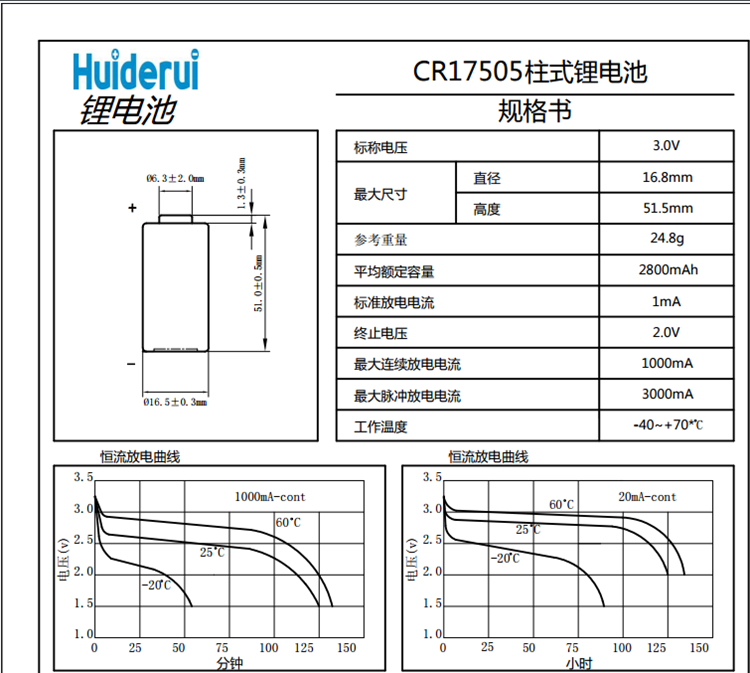 Huiderui disposable lithium manganese battery CR17505 3V smart water meter instrument smoke detector gas meter battery flat head (bare battery)