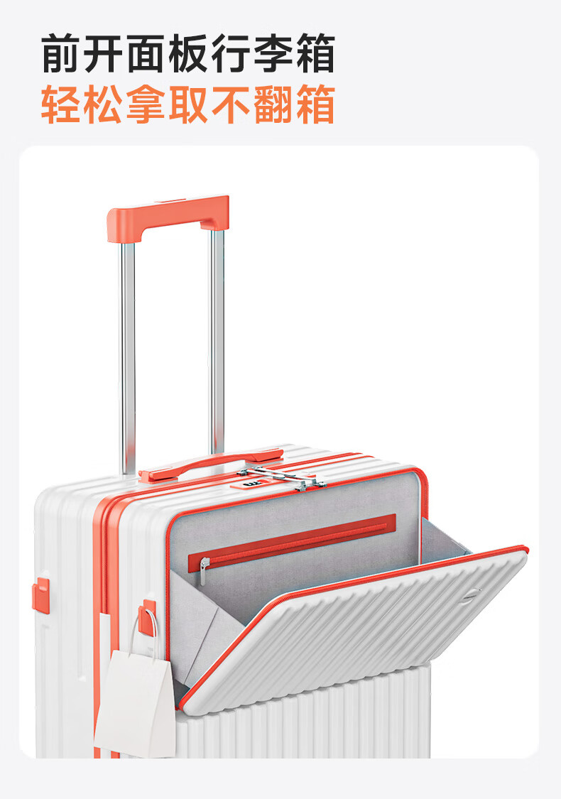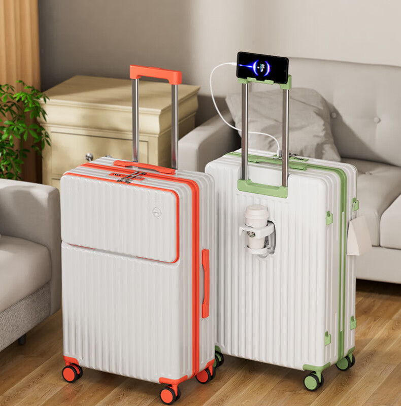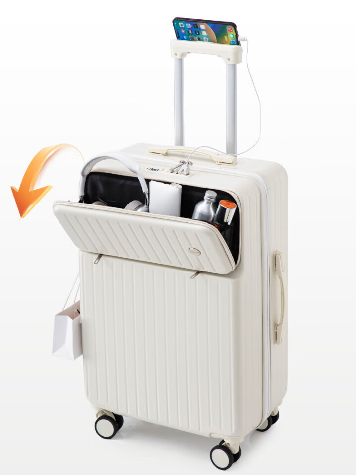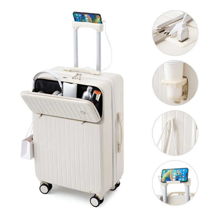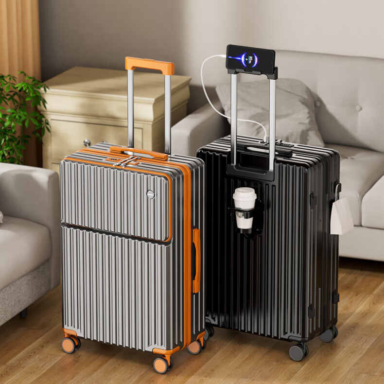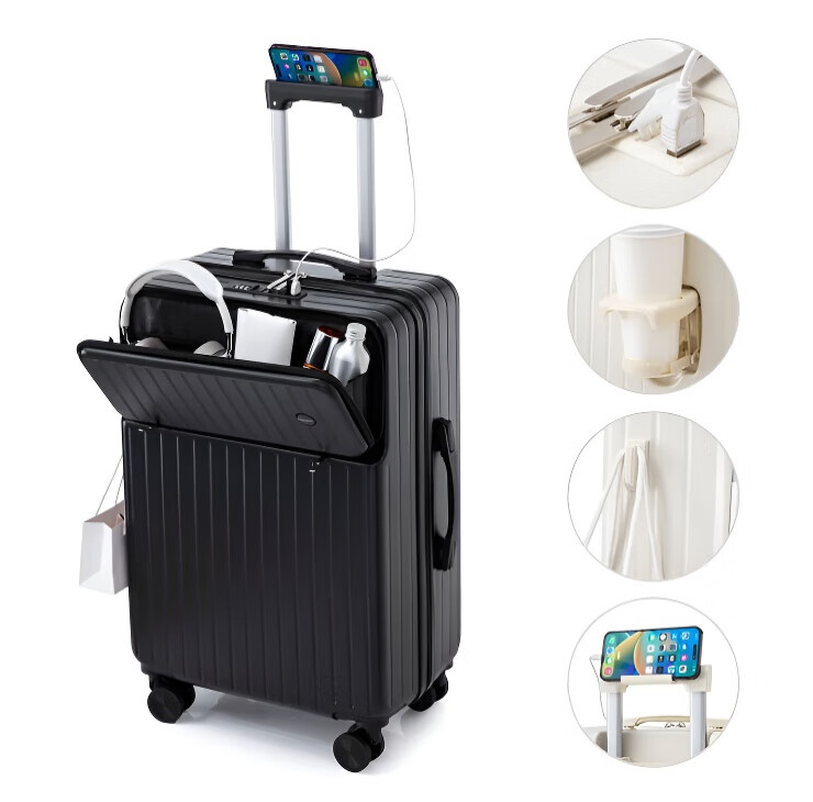 Kangaroo multifunctional front opening suitcase next day delivery small expandable trolley suitcase thickened leather suitcase front opening zipper style / obsidian black + rear cup holder 20 inches carry-on case + charging port + expandable