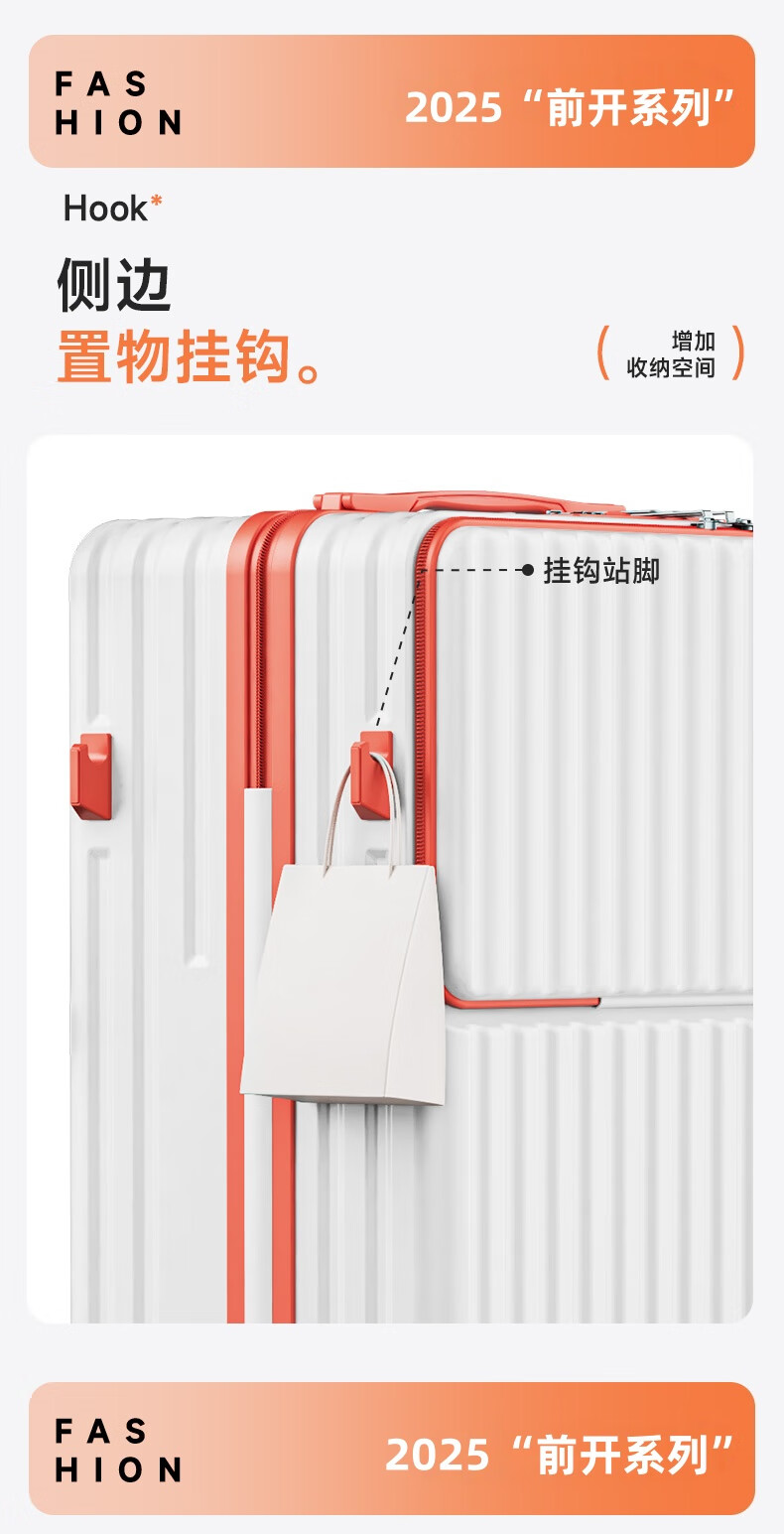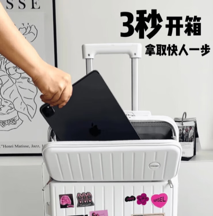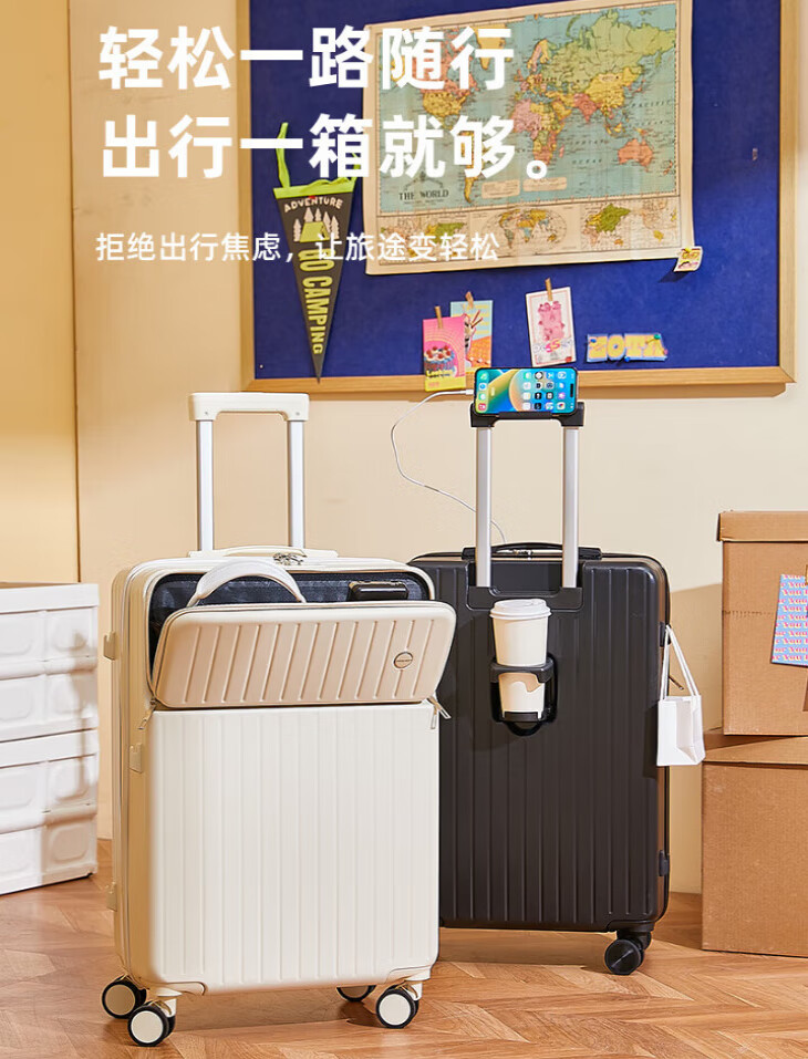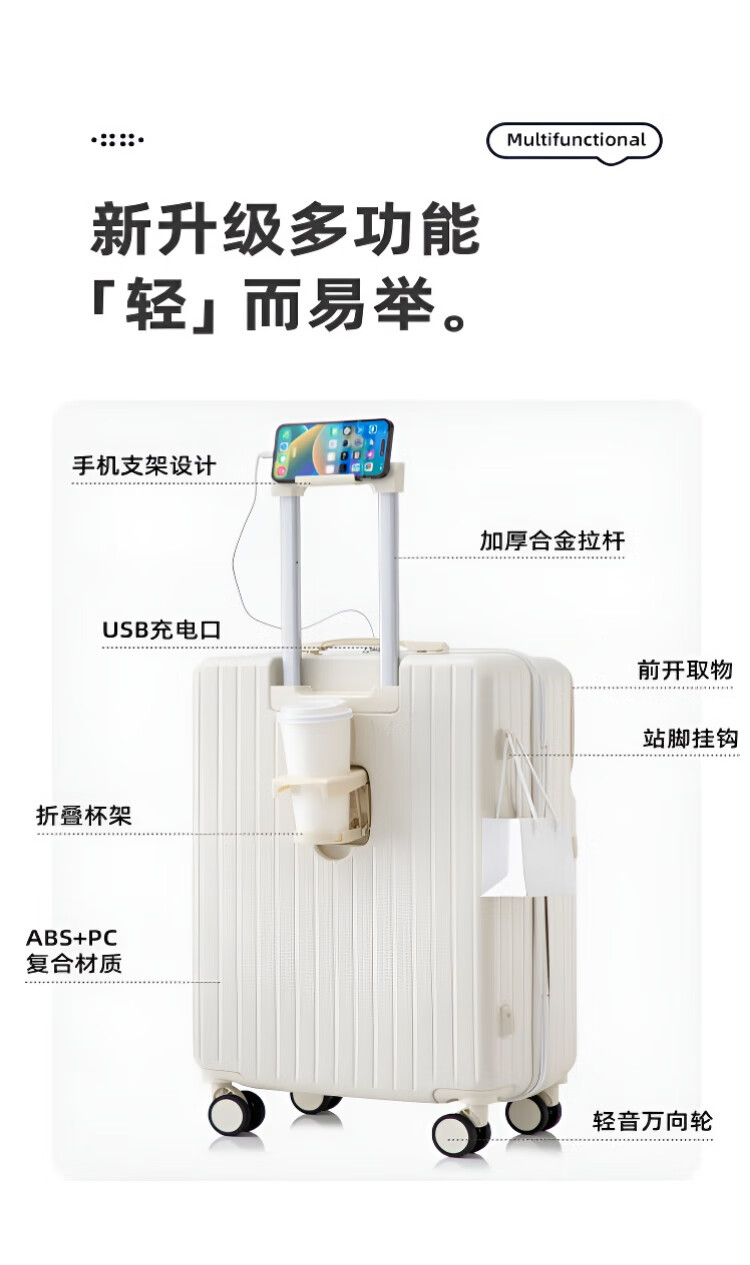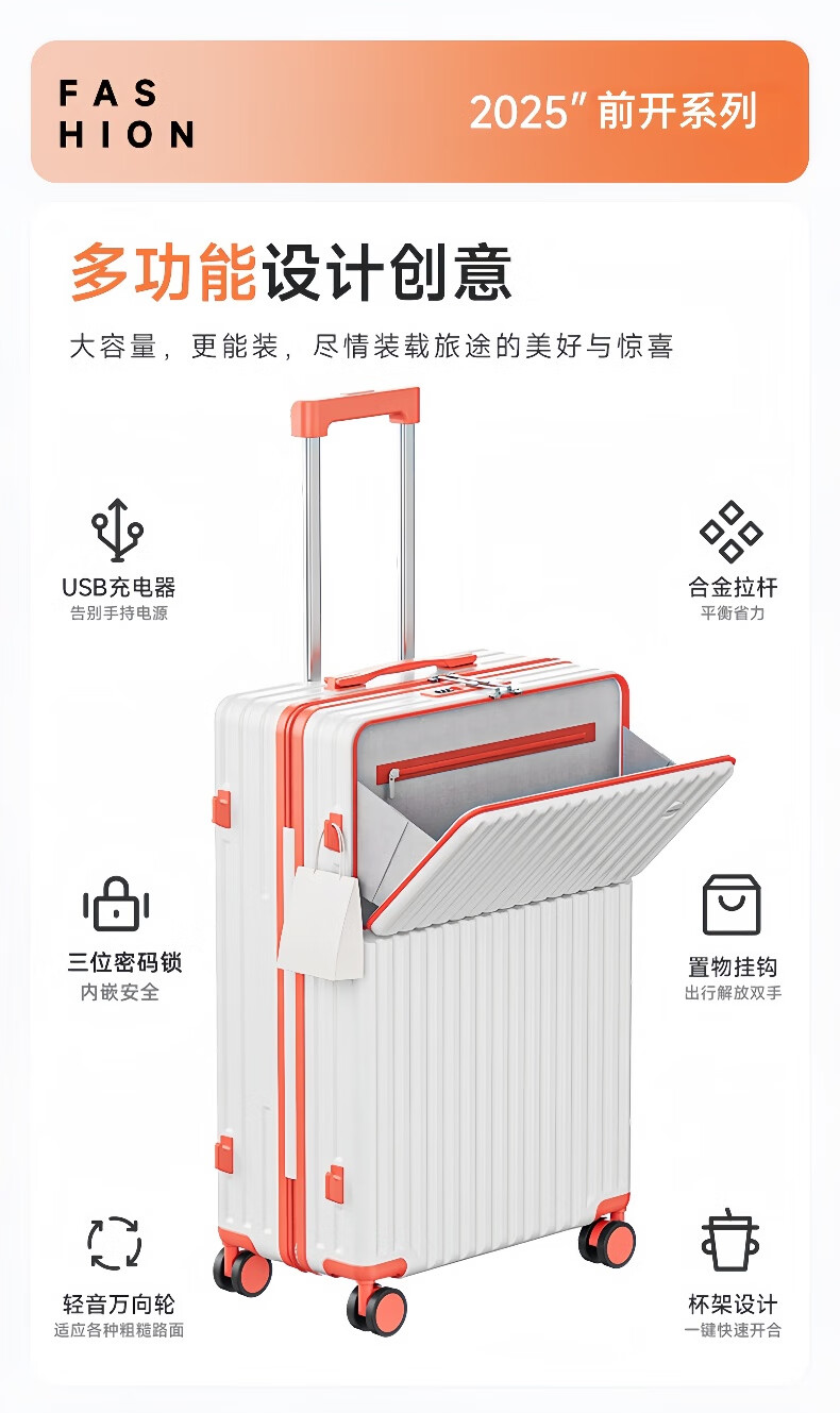 Kangaroo multifunctional front opening suitcase next day delivery small expandable trolley suitcase thickened leather suitcase front opening zipper style / obsidian black + rear cup holder 20 inches carry-on case + charging port + expandable