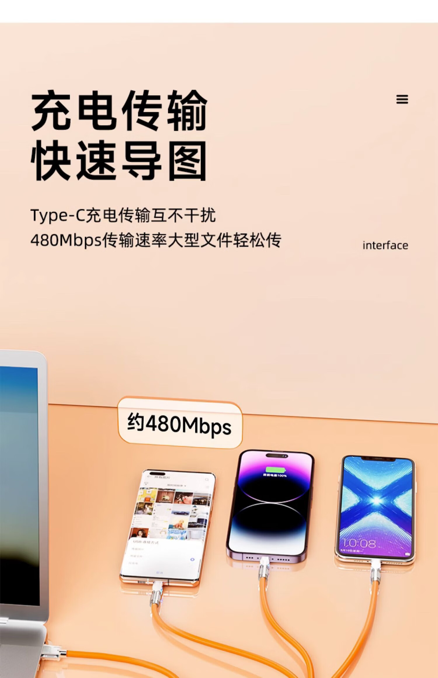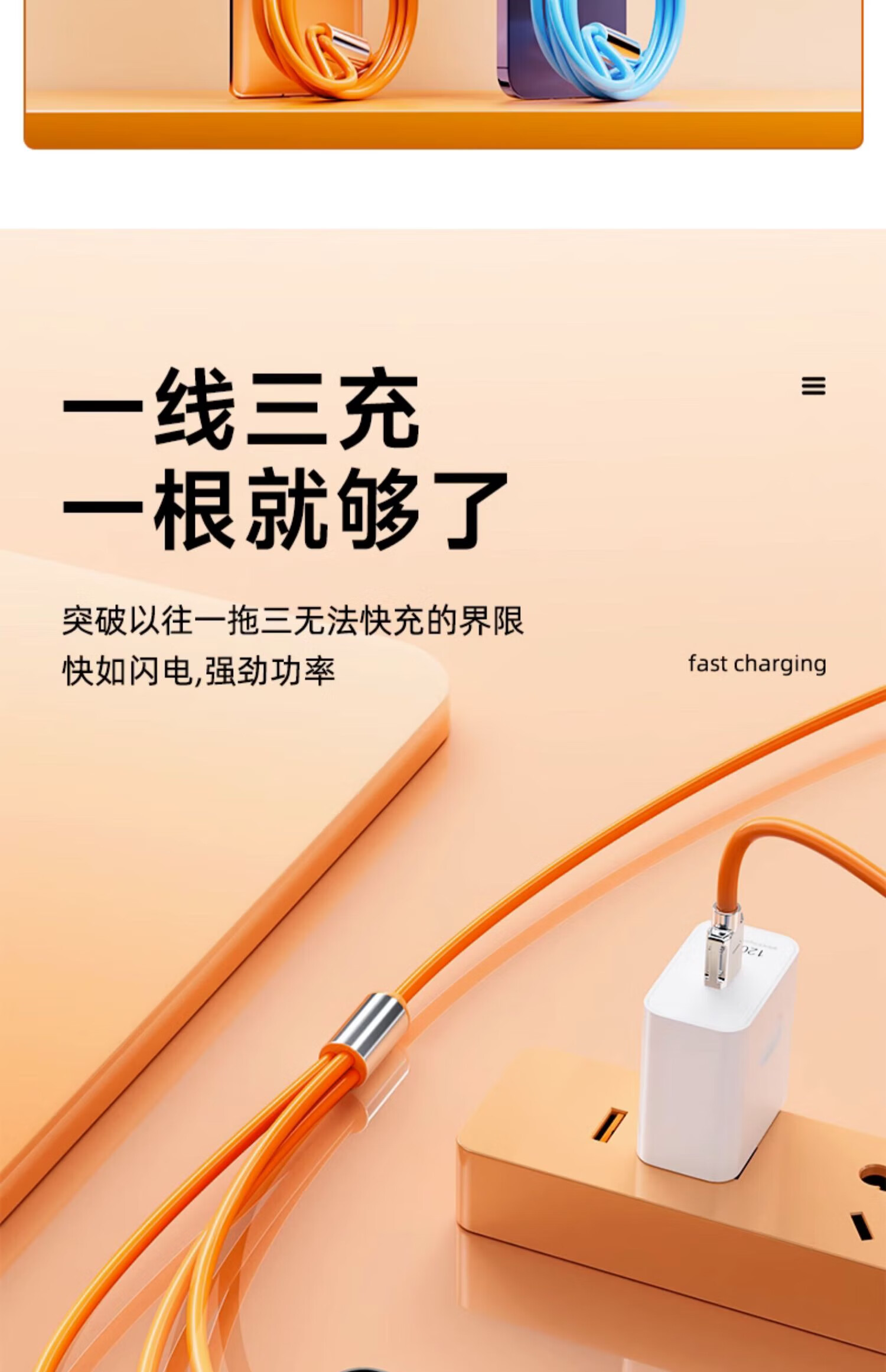 Compatible with 120W passenger line, one-to-three super fast charging data cable, suitable for Apple, Huawei, Xiaomi type-c plug car multi-function charging cable, three-in-one fast charging cable, compatible with 120w three-in-one fast charging cable, 2 meters, 2 pieces