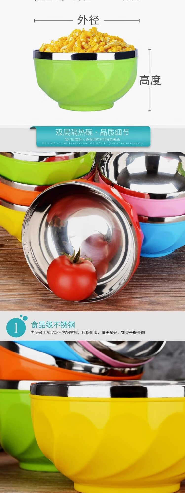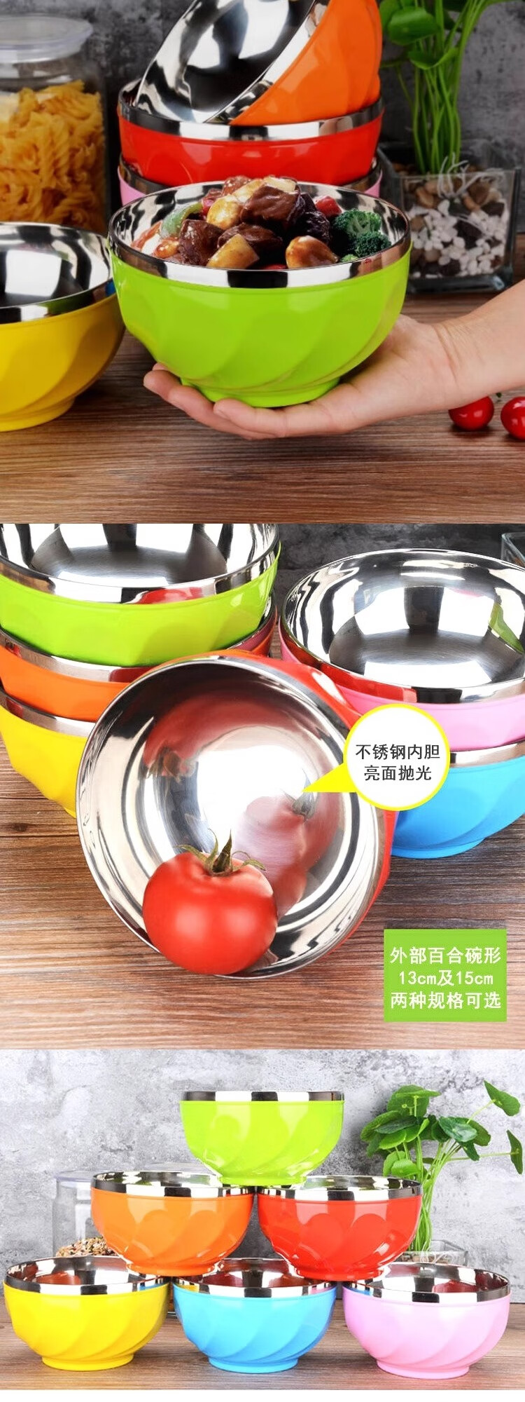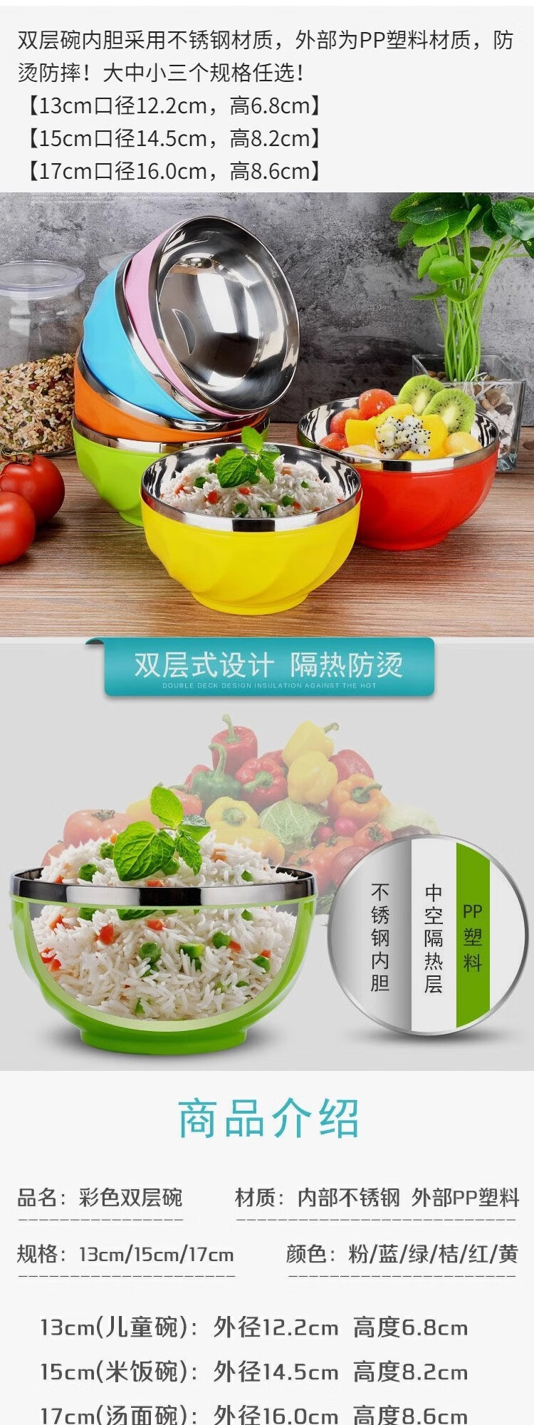 Colorful stainless steel bowl, anti-scalding, high-looking, insulated, double-layer adult instant noodle bowl, special for household use with lid, anti-fall for children, colorful bowl 13CM 1 piece