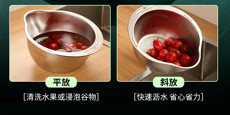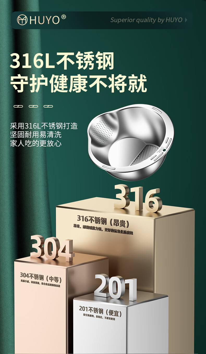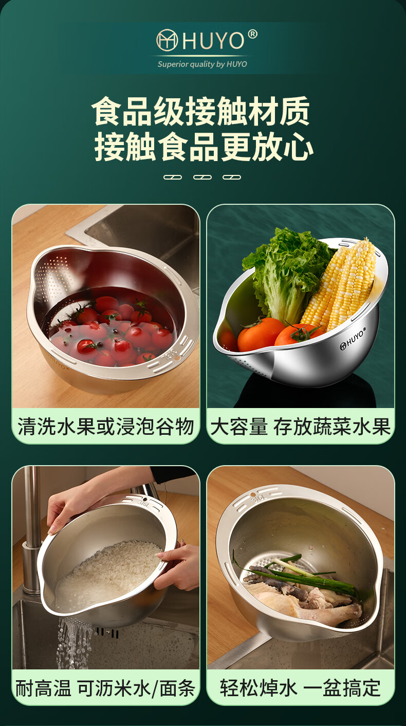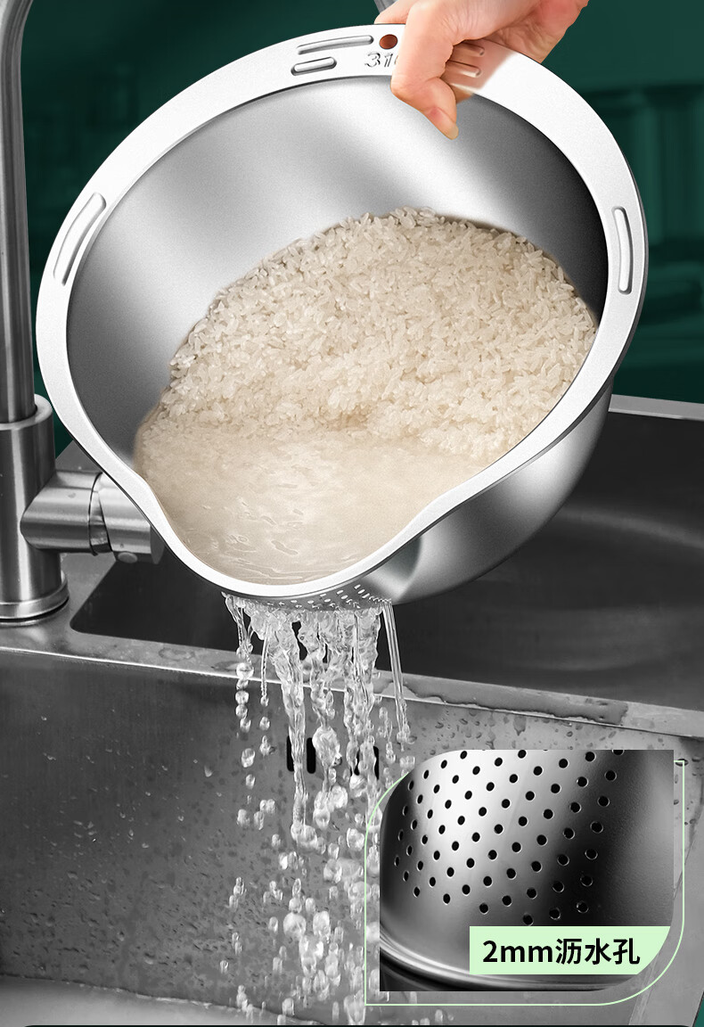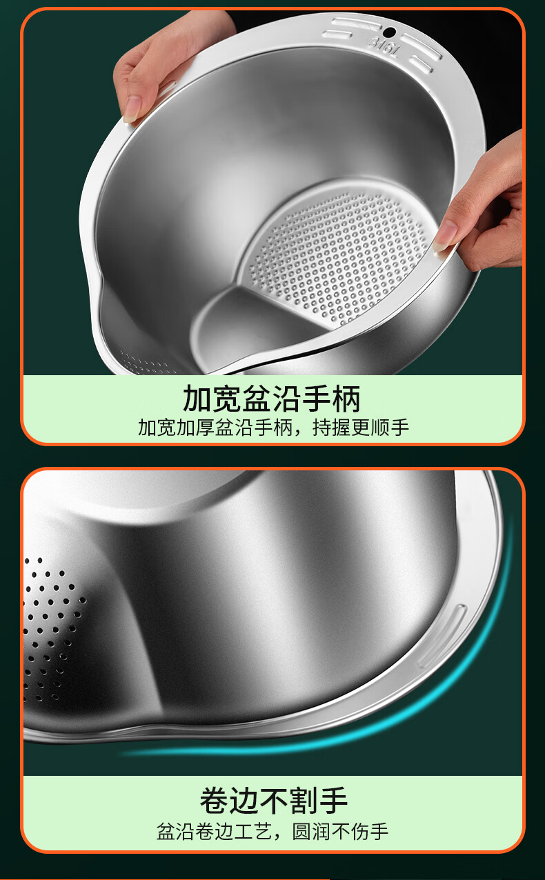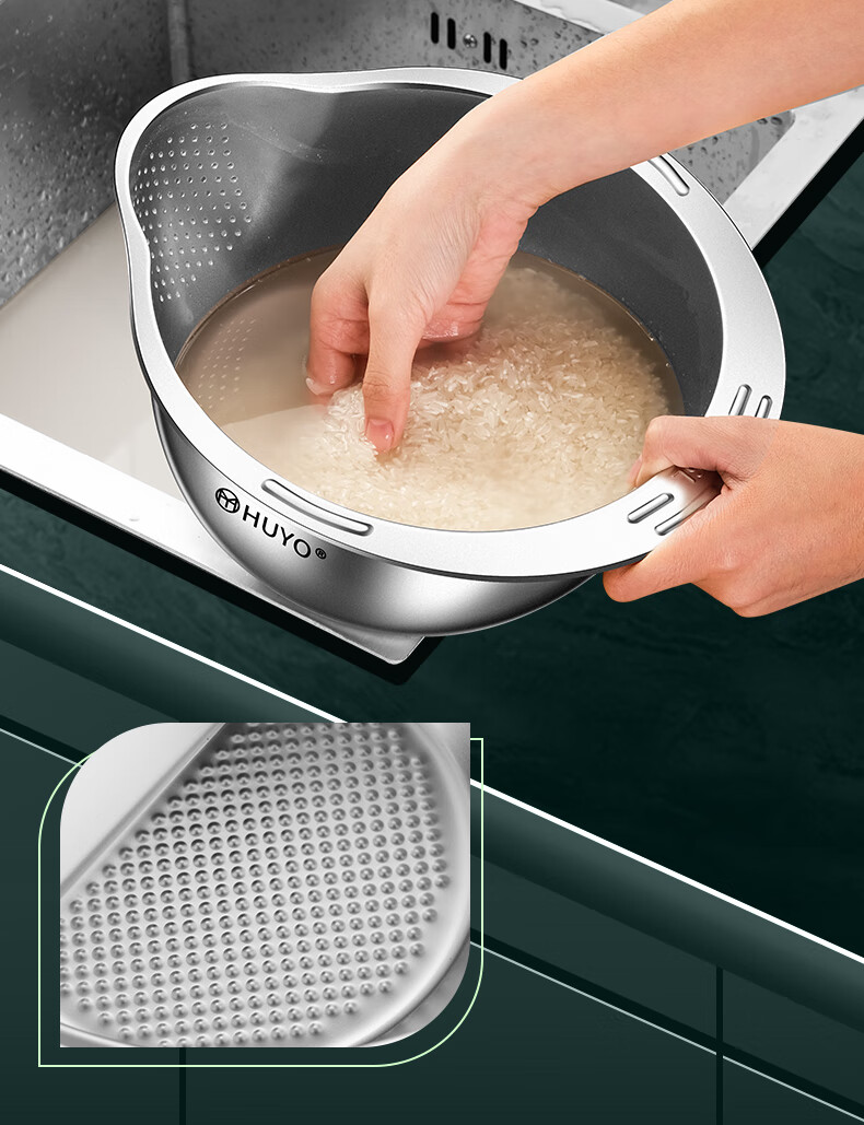 HUYO316L stainless steel drain basket, household multifunctional rice washing artifact, food grade large drain basin, rice washing sieve, antibacterial 316L steel, thickened drain basin