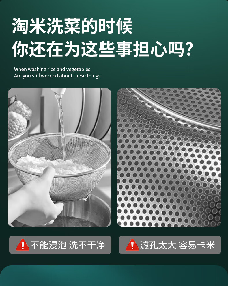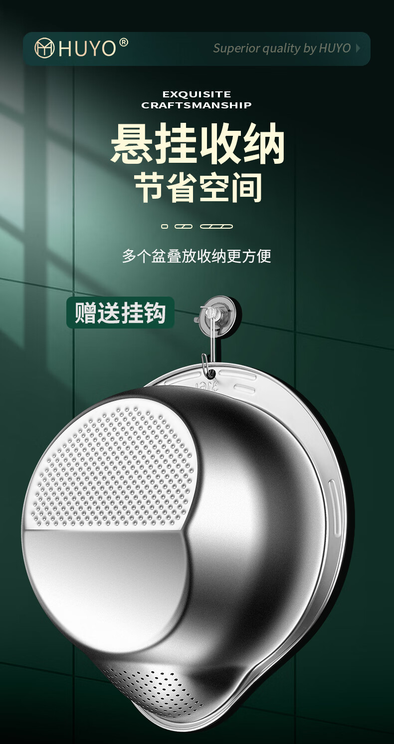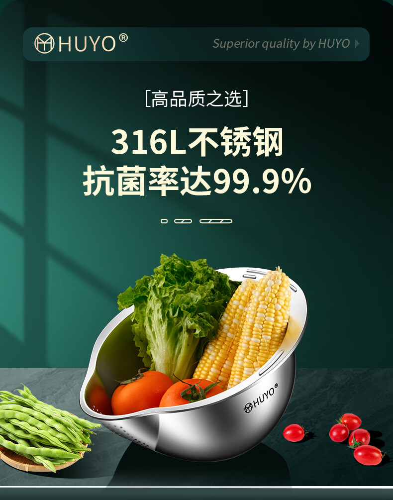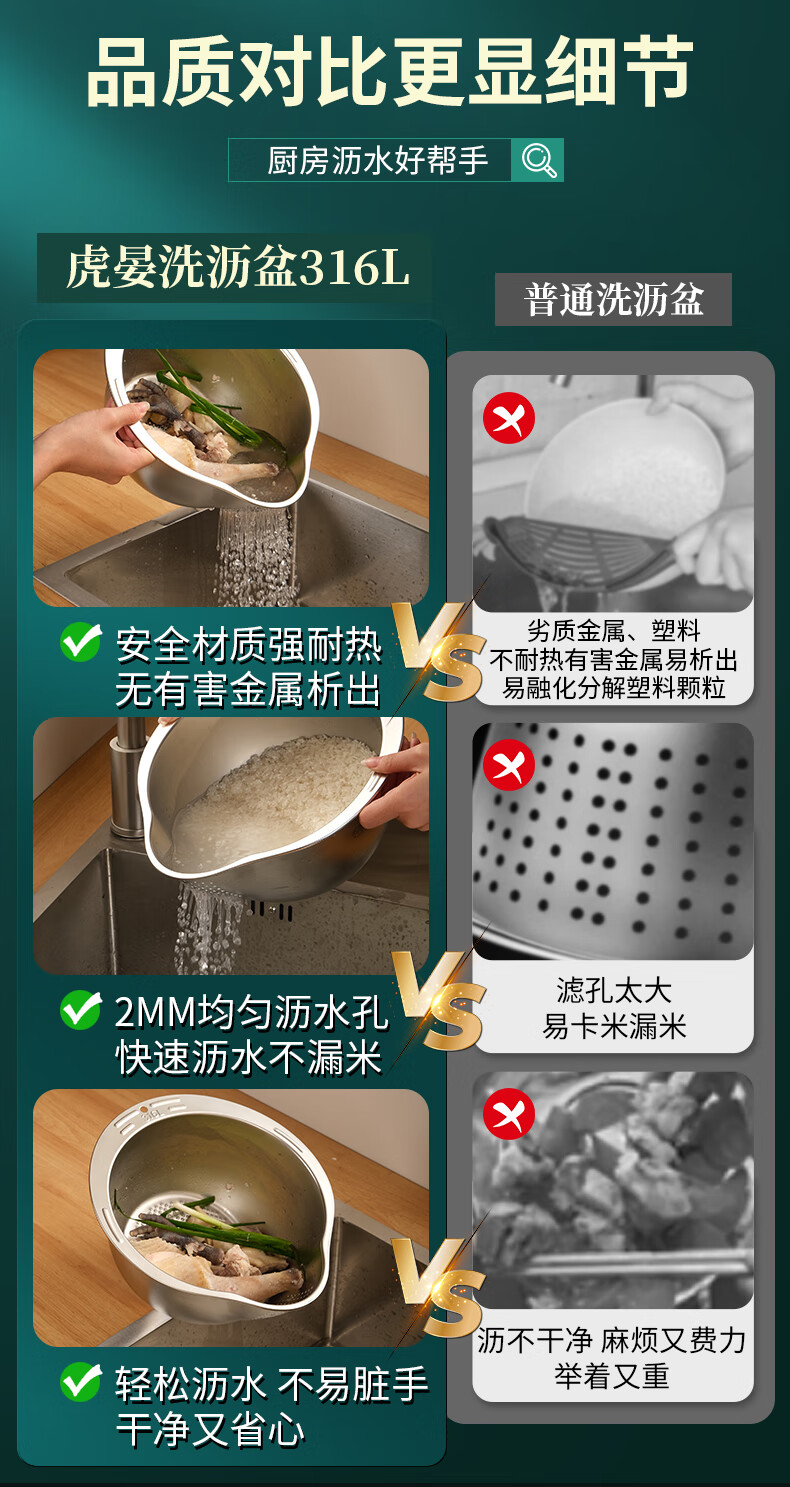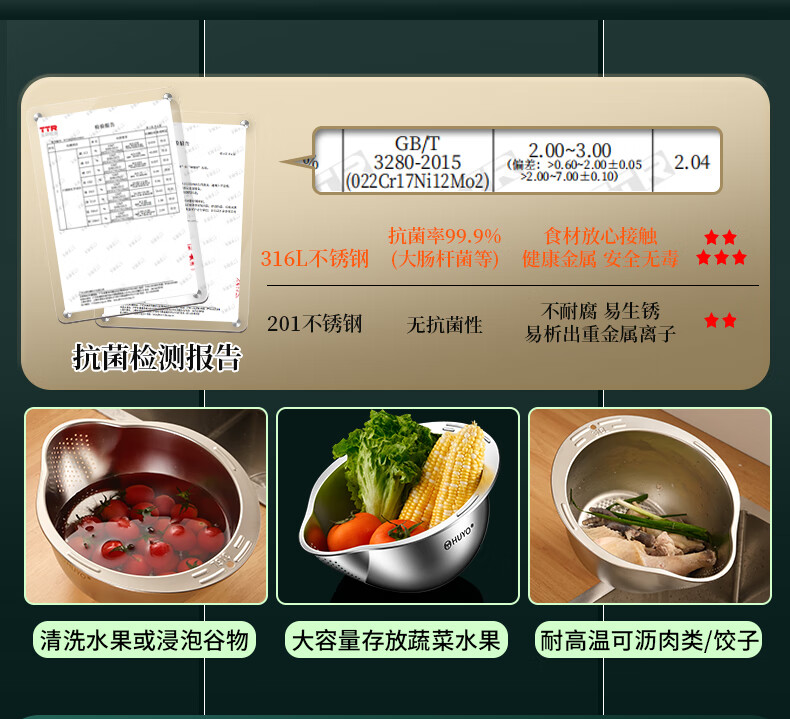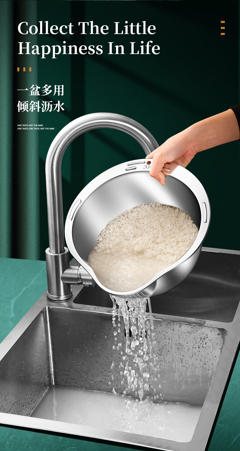 HUYO316L stainless steel drain basket, household multifunctional rice washing artifact, food grade large drain basin, rice washing sieve, antibacterial 316L steel, thickened drain basin