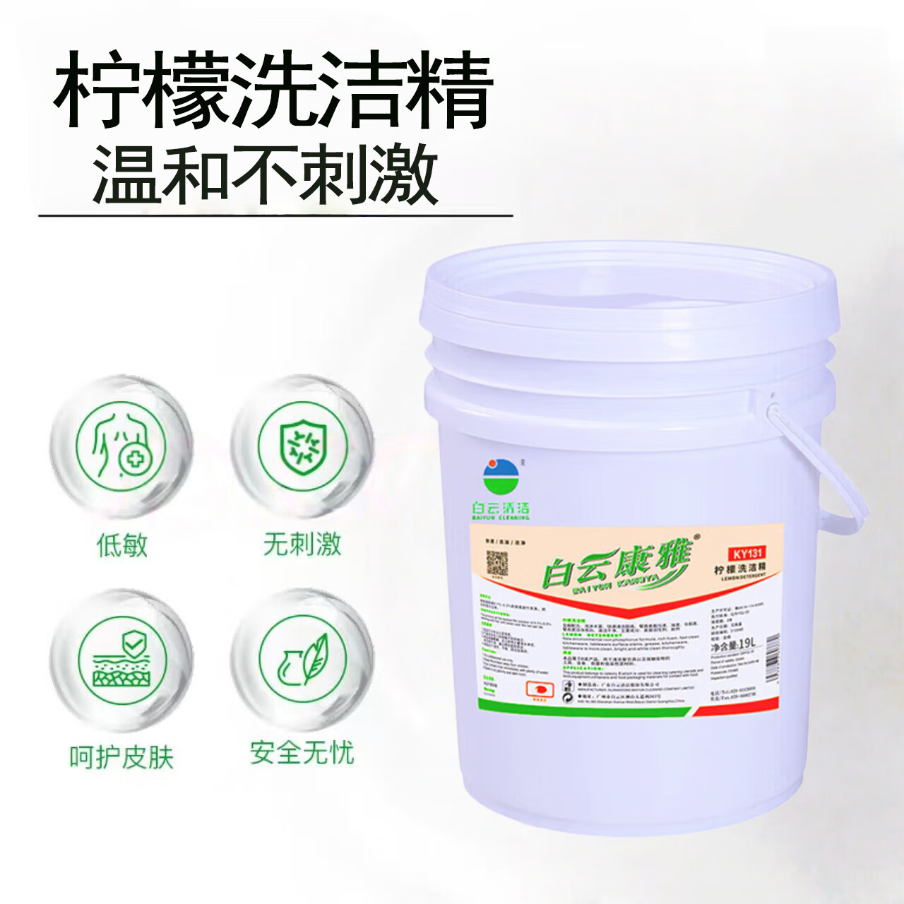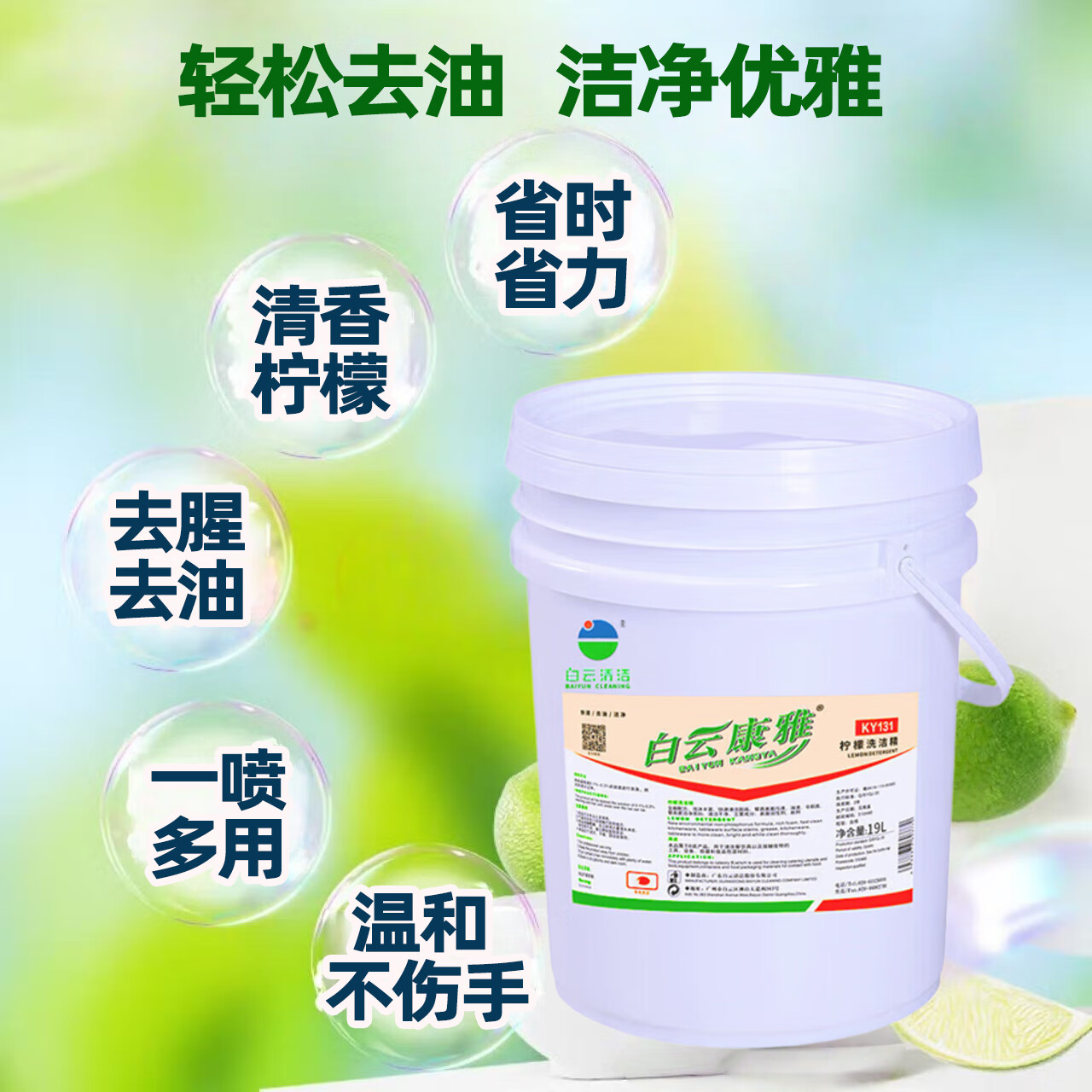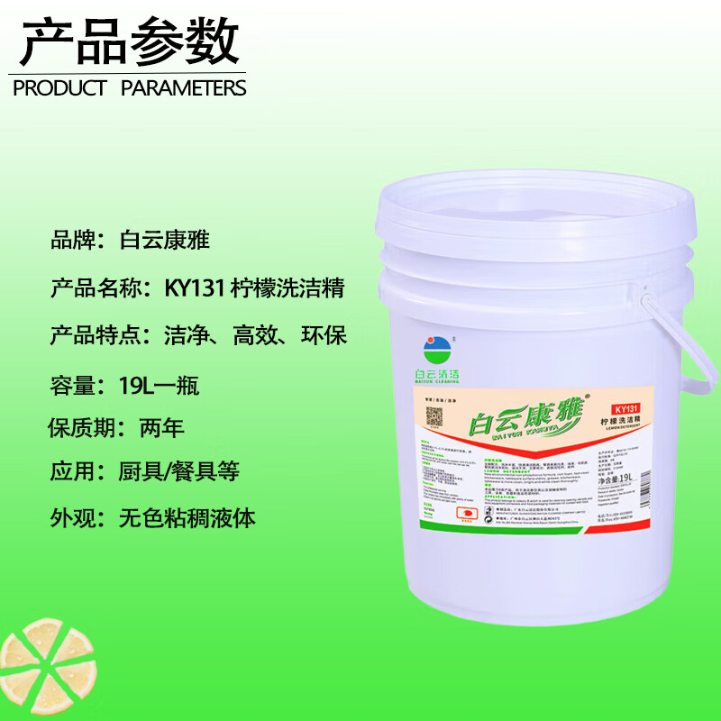 Baiyun Kangya Lemon Dish Soap can quickly clean tableware, tools, equipment, containers and food packaging materials that come into contact with food. One barrel of 19L.