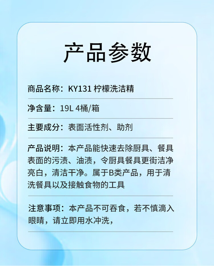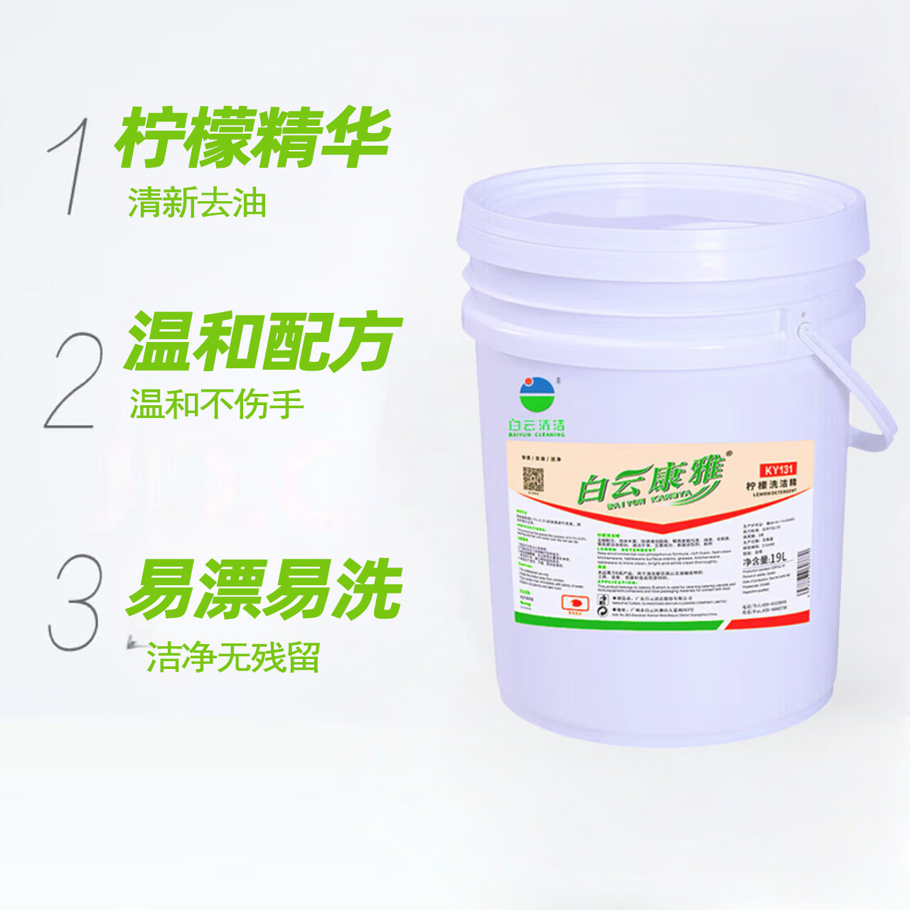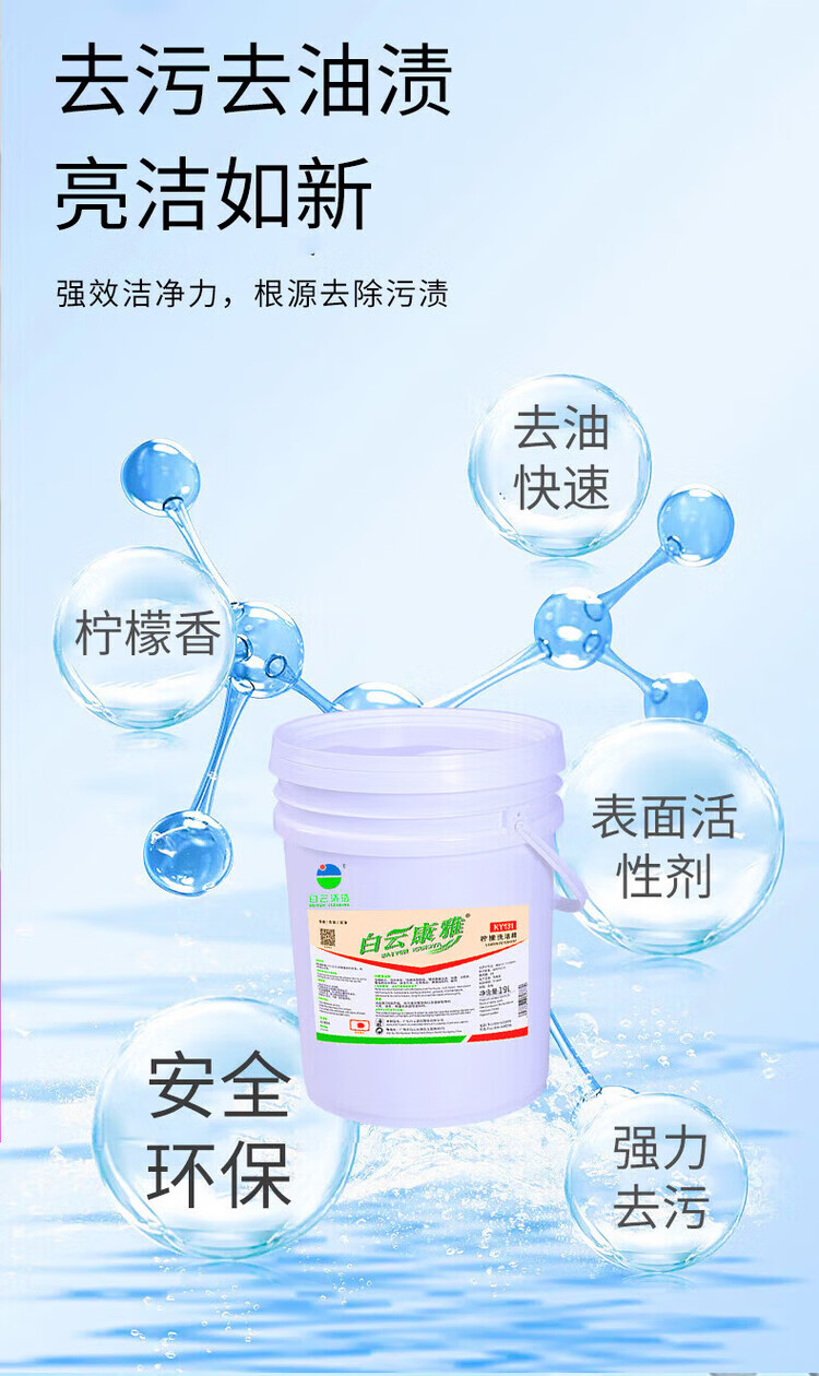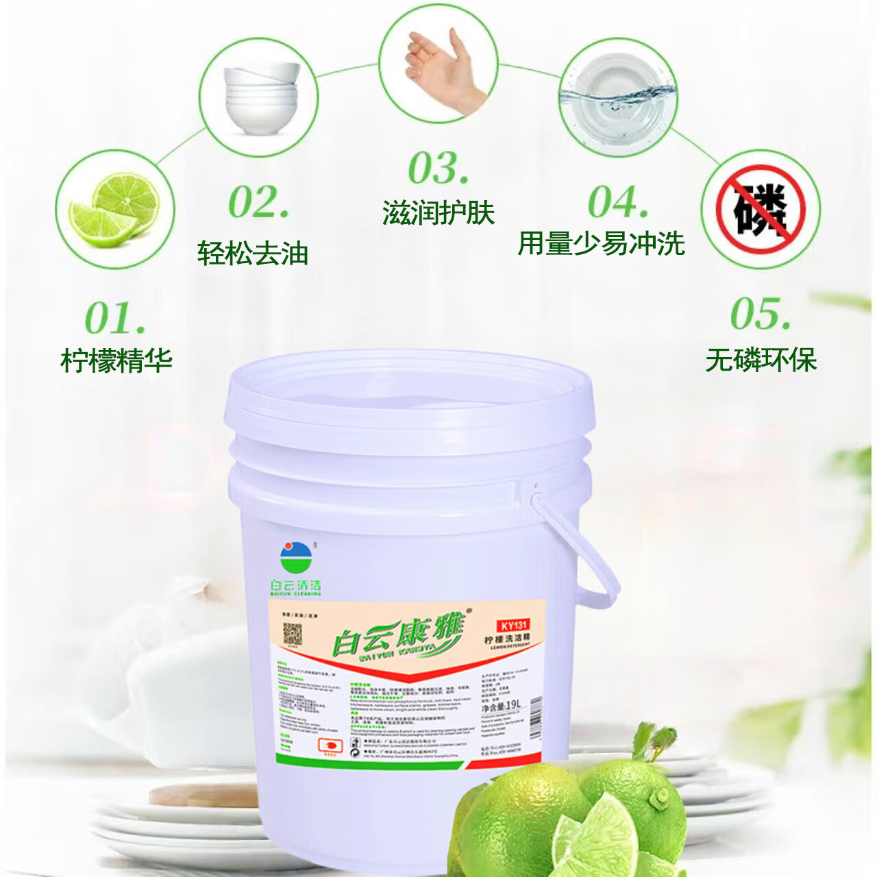 Baiyun Kangya Lemon Dish Soap can quickly clean tableware, tools, equipment, containers and food packaging materials that come into contact with food. One barrel of 19L.