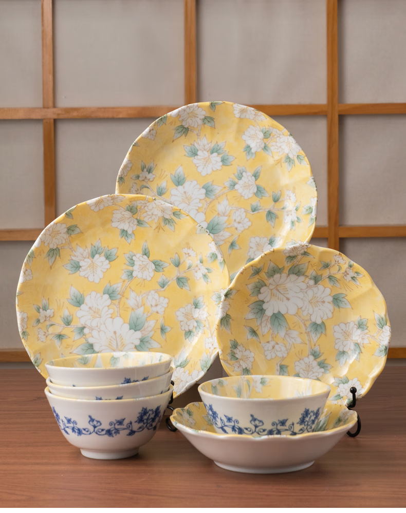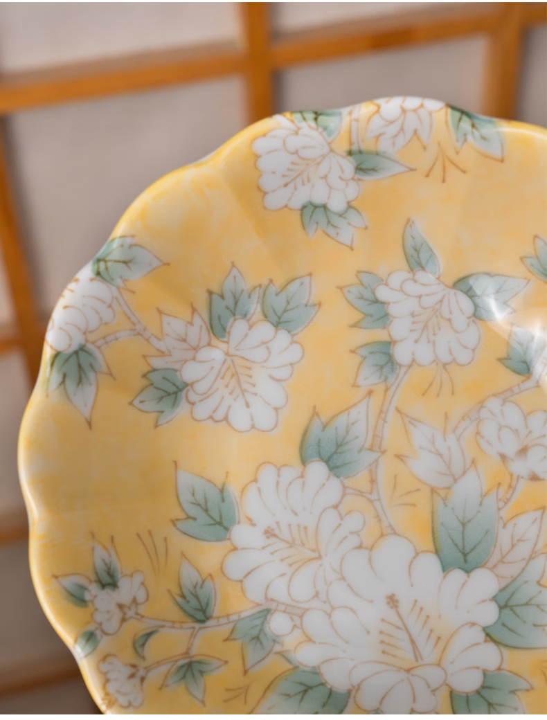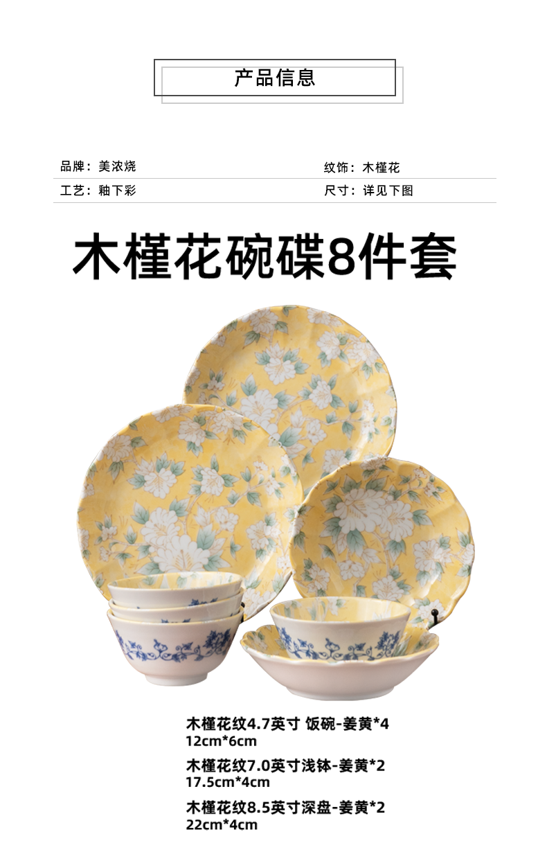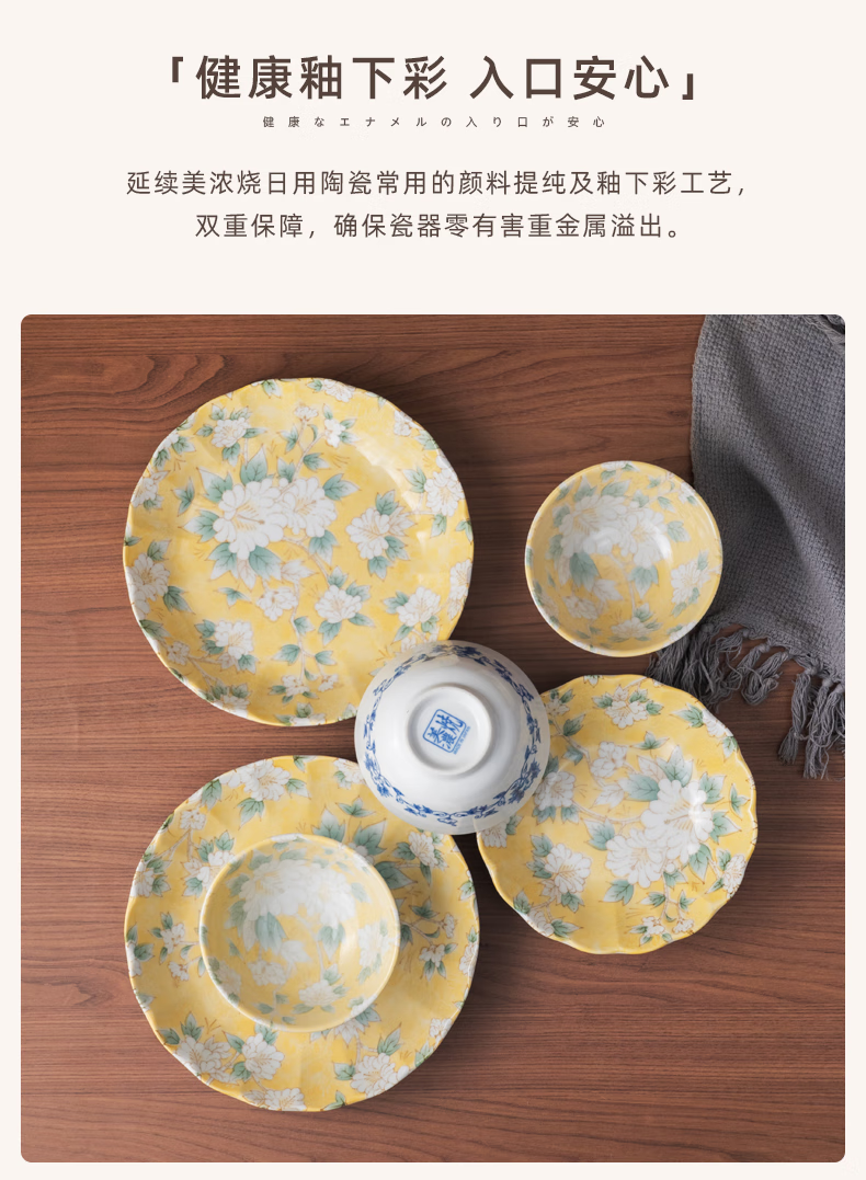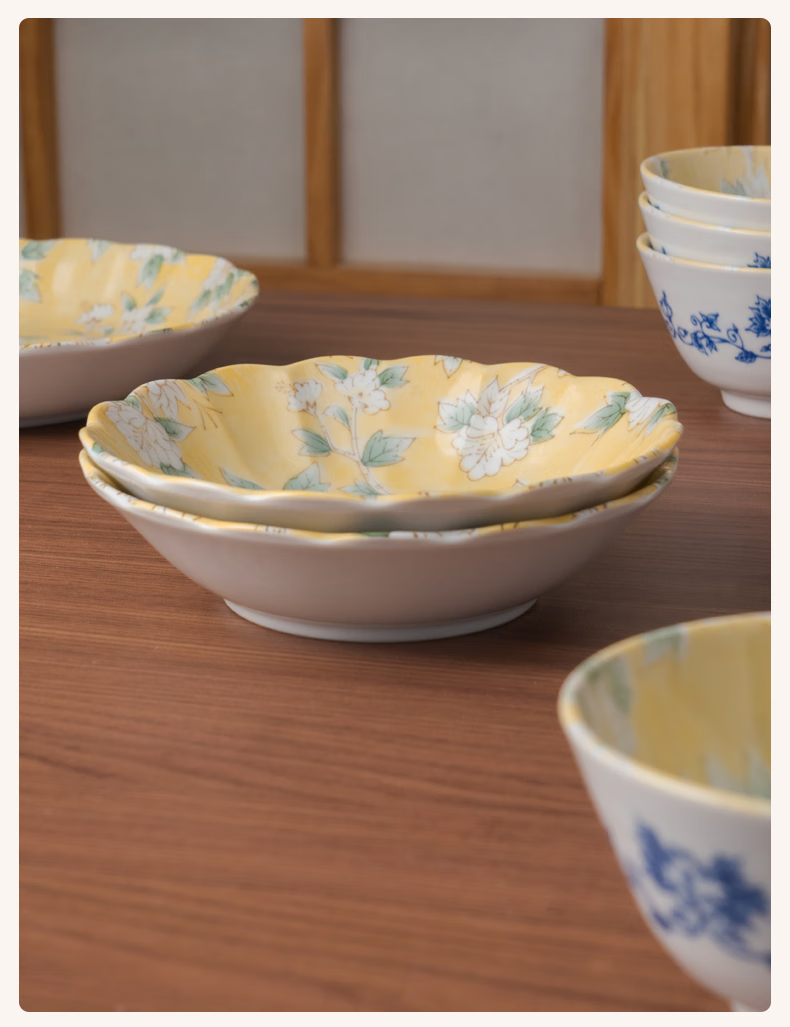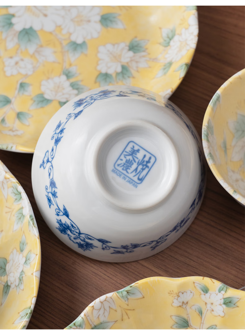 Mino Yaki Japan imported hibiscus bright yellow 8-piece ceramic tableware set household bowl and plate combination underglaze color high appearance Hibiscus bright yellow 8-piece set