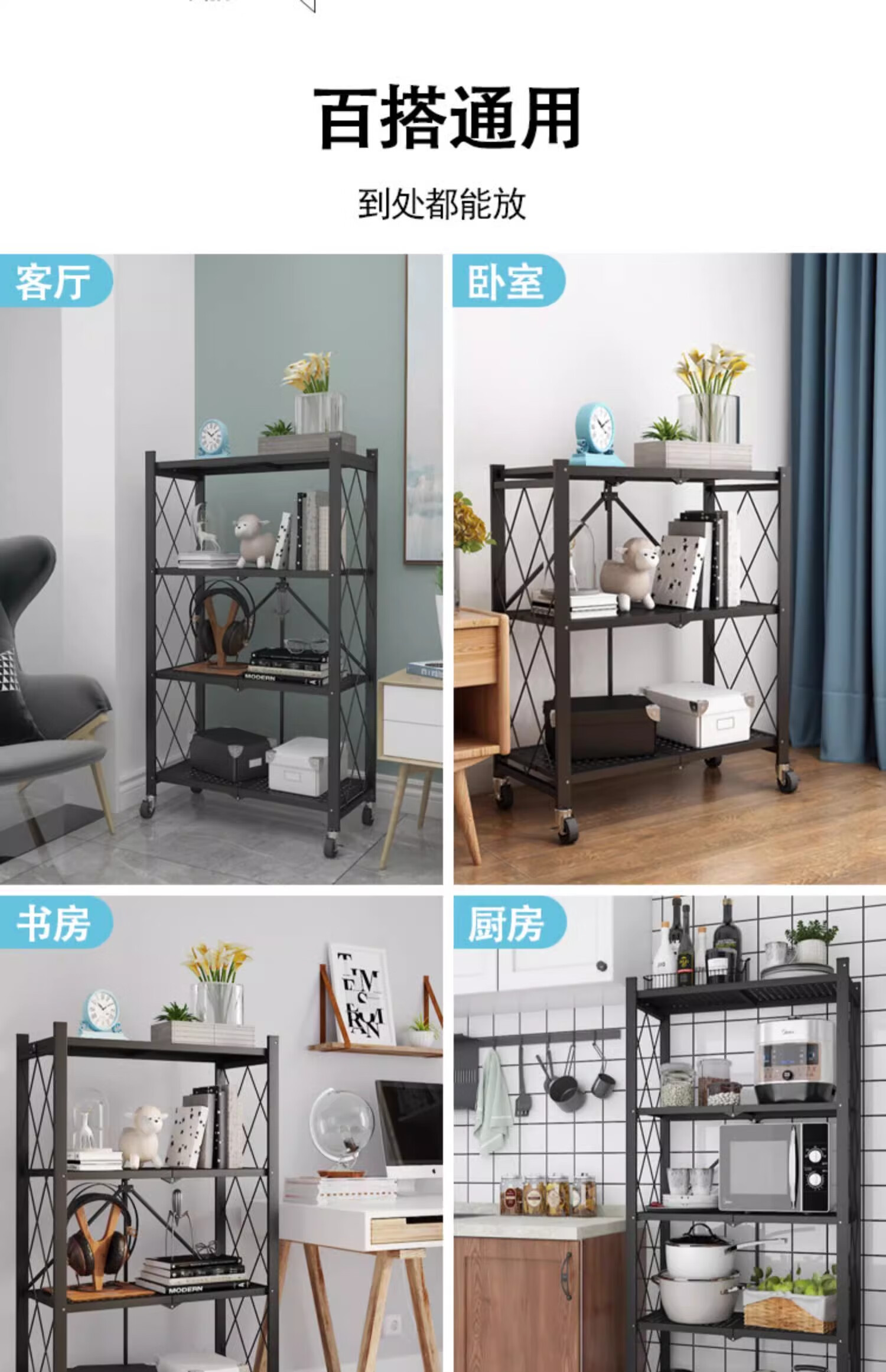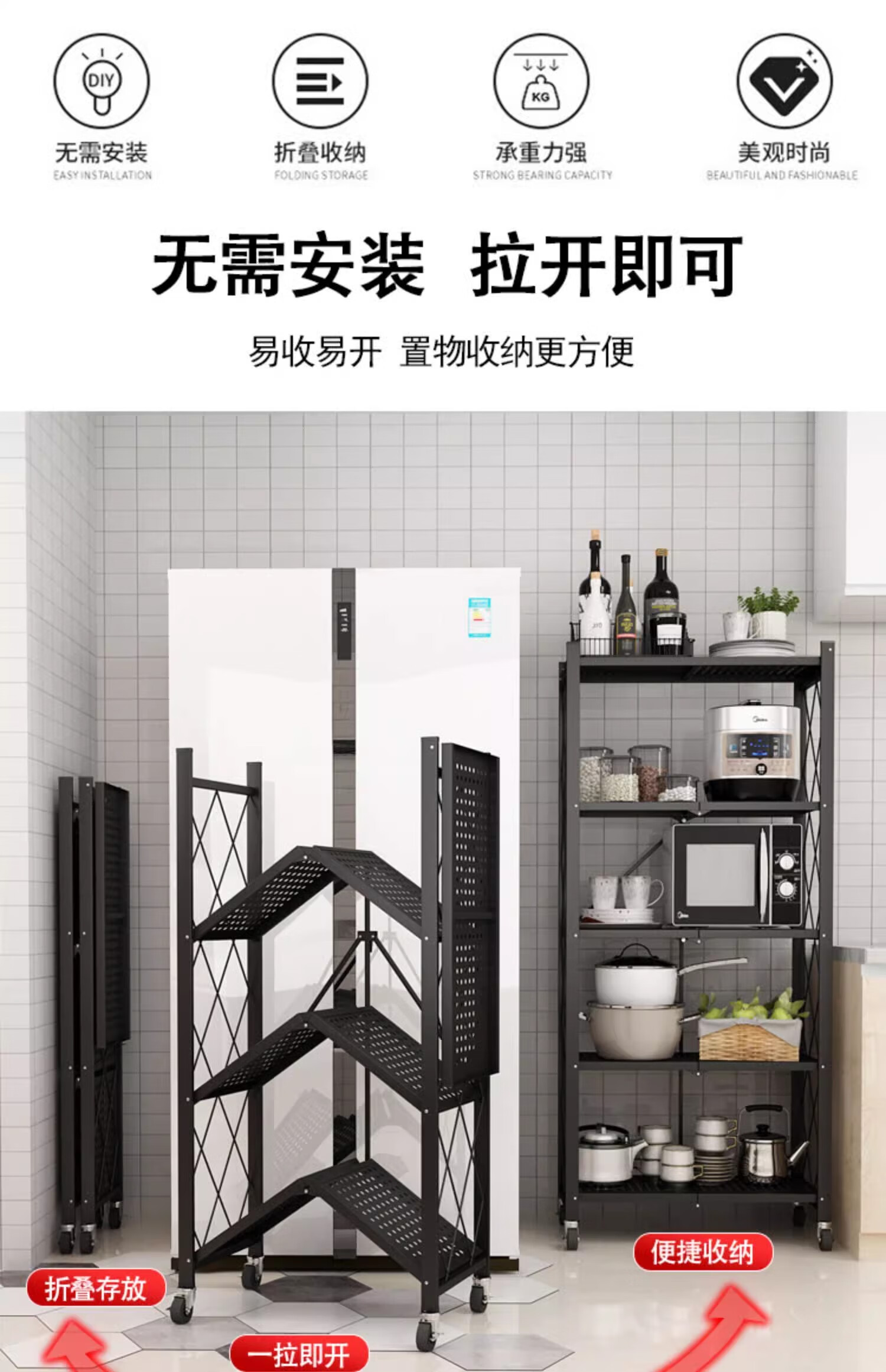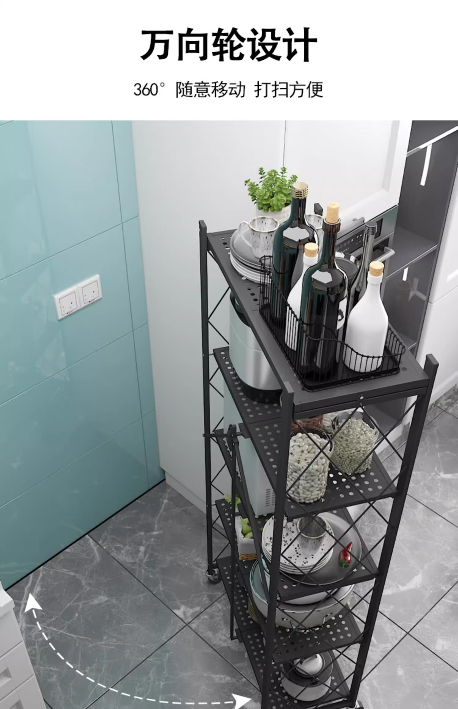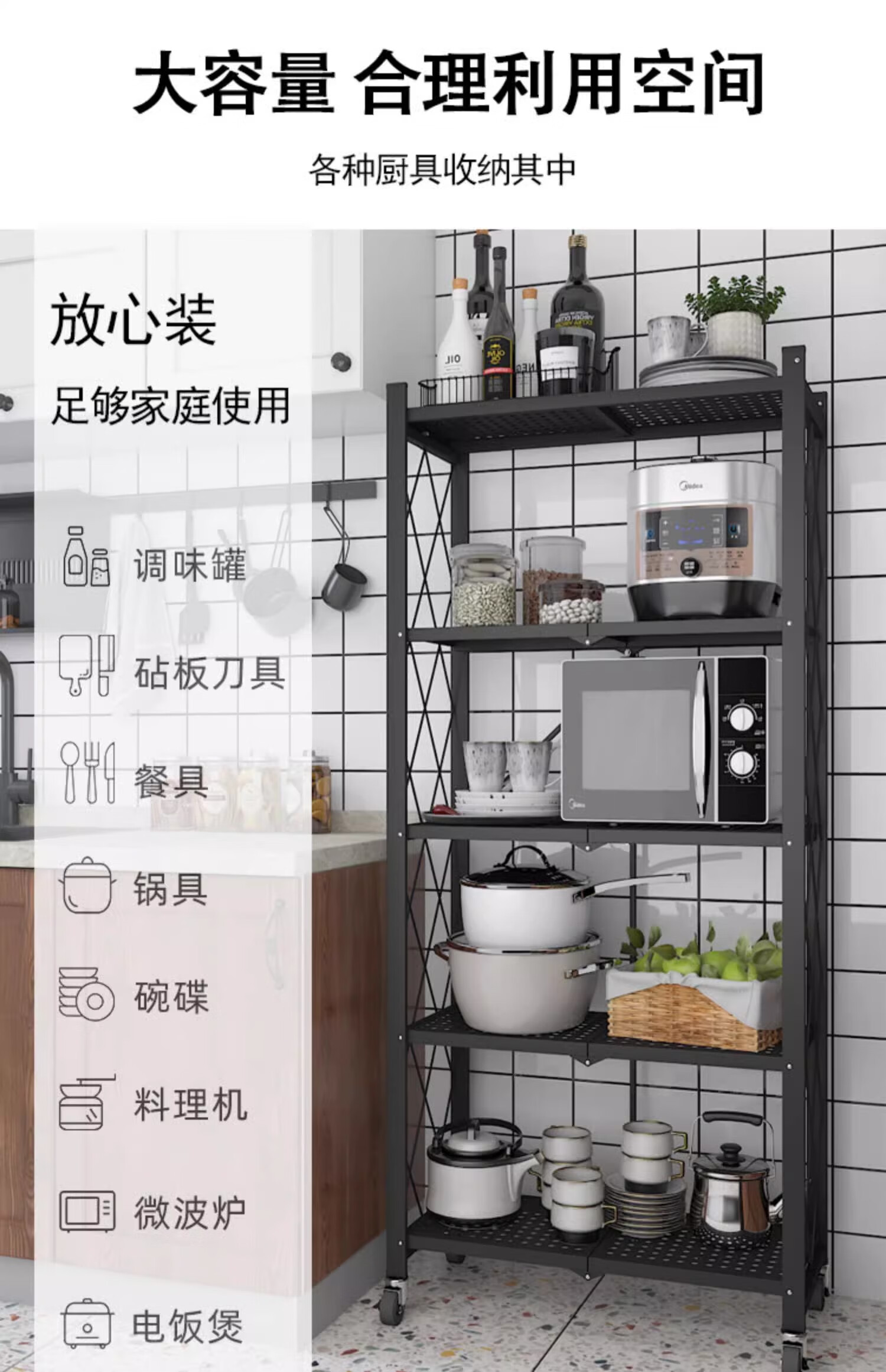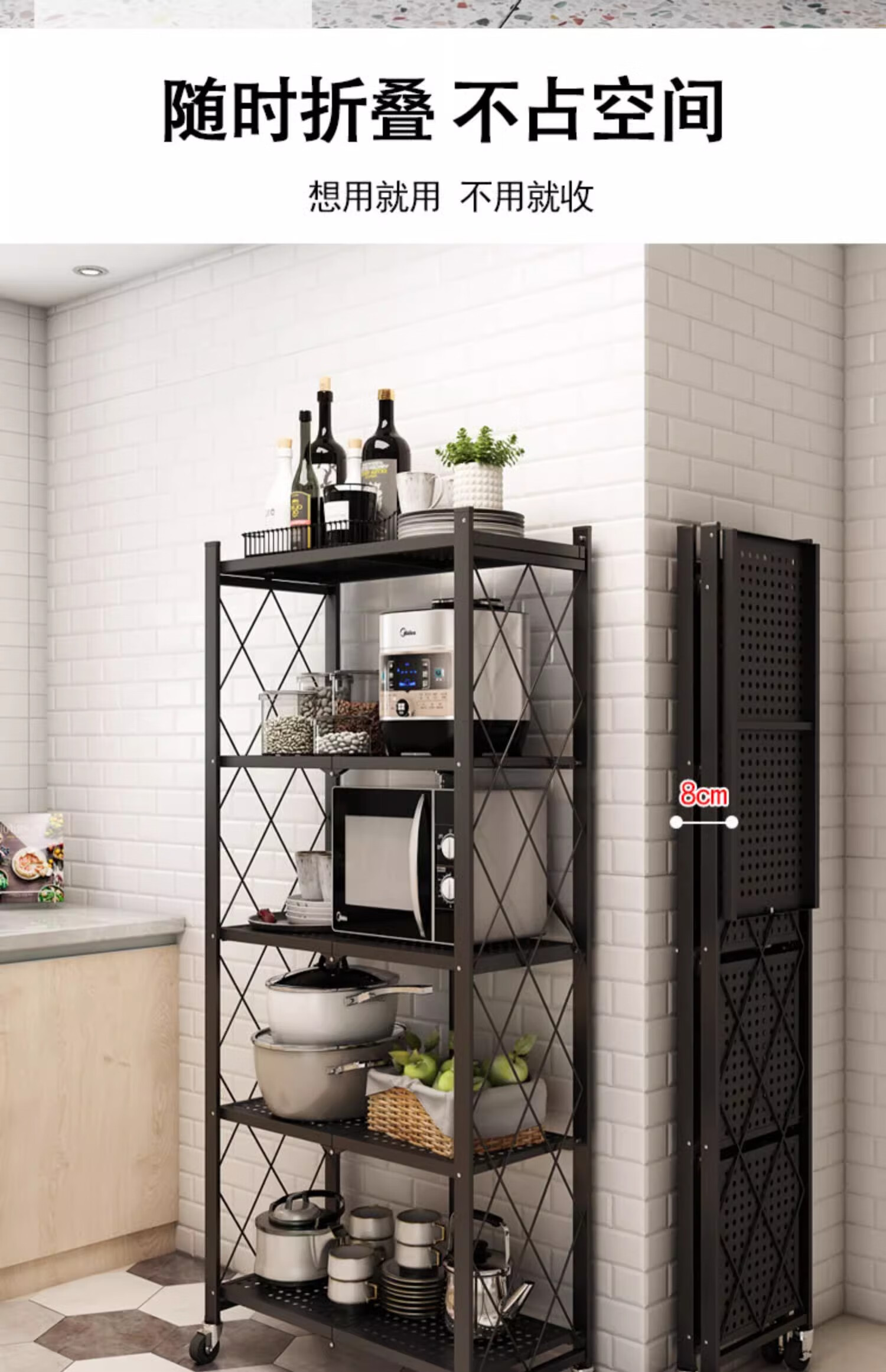 Installation-free floor-standing folding storage rack storage rack microwave oven rack living room kitchen multi-layer storage trolley pot rack thickened carbon steel black five layers - second folding + no installation required