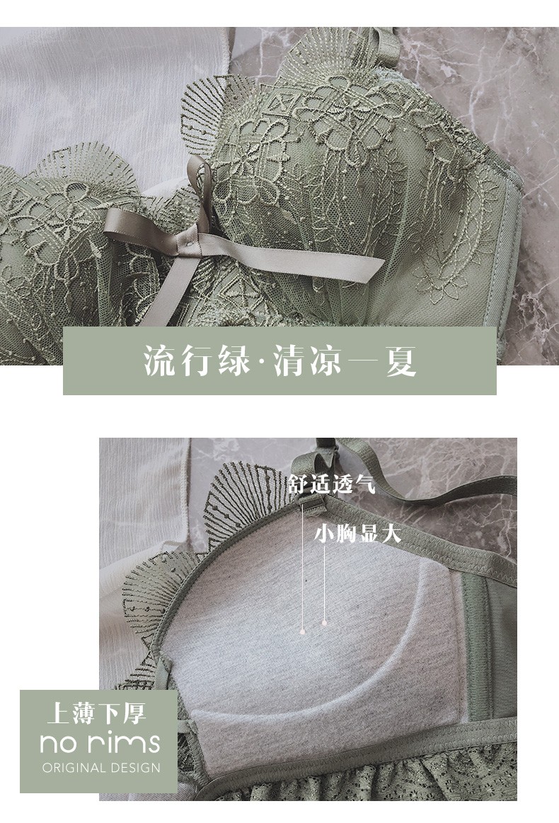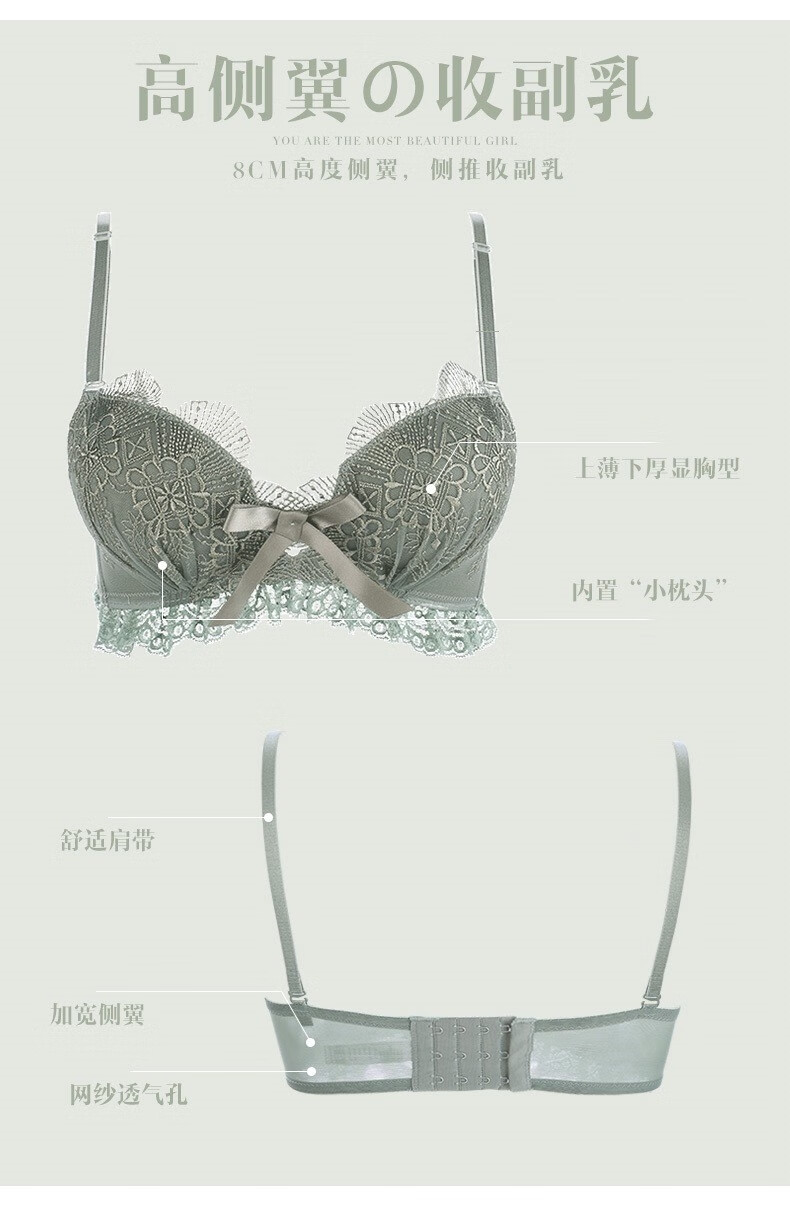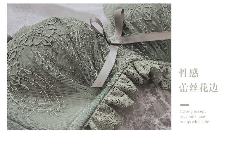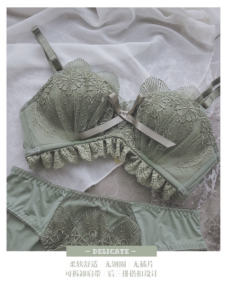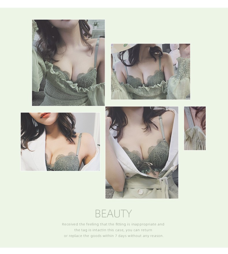 Daitianli push-up lace sexy underwear bra set, no wires, women's push-up adjustable anti-sagging small breast bra, green (single bra) 34A=75A