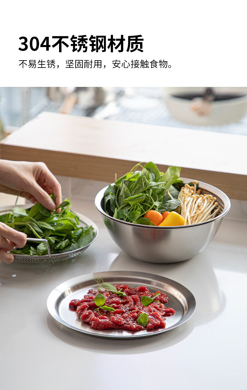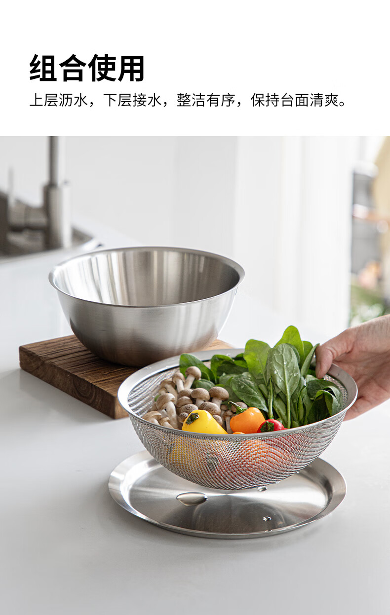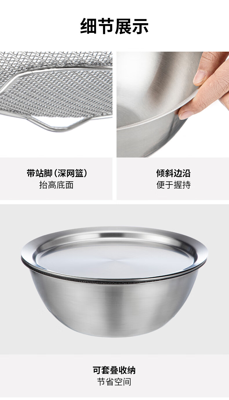Shuangshan 304 stainless steel cooking basin, rice washing and vegetable basket, baking, deepening and kneading basin, salad bowl, vegetable preparation, drain basin set (lid + drain basket + deep basin)