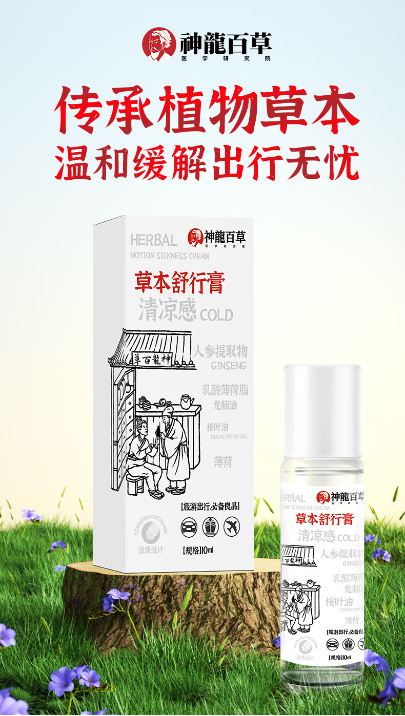 Produced by SHENLONGBAICAO Research Institute, Shenlong Baicao Shuxing Ointment is a must-have herbal mint motion sickness ointment for traveling, 10ml*2 (the second one is half price)