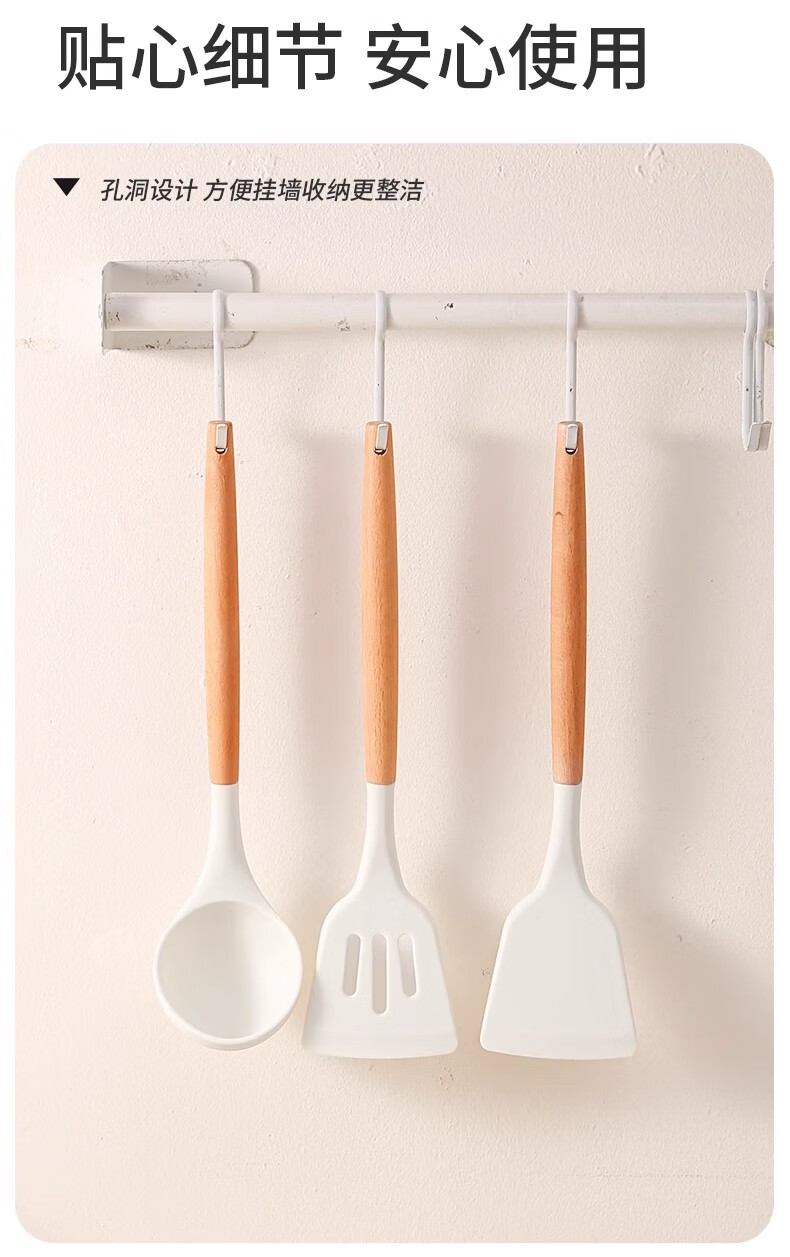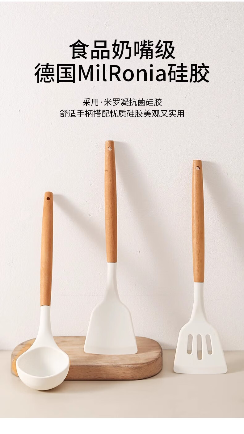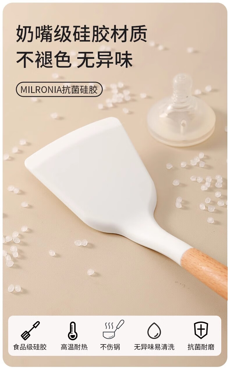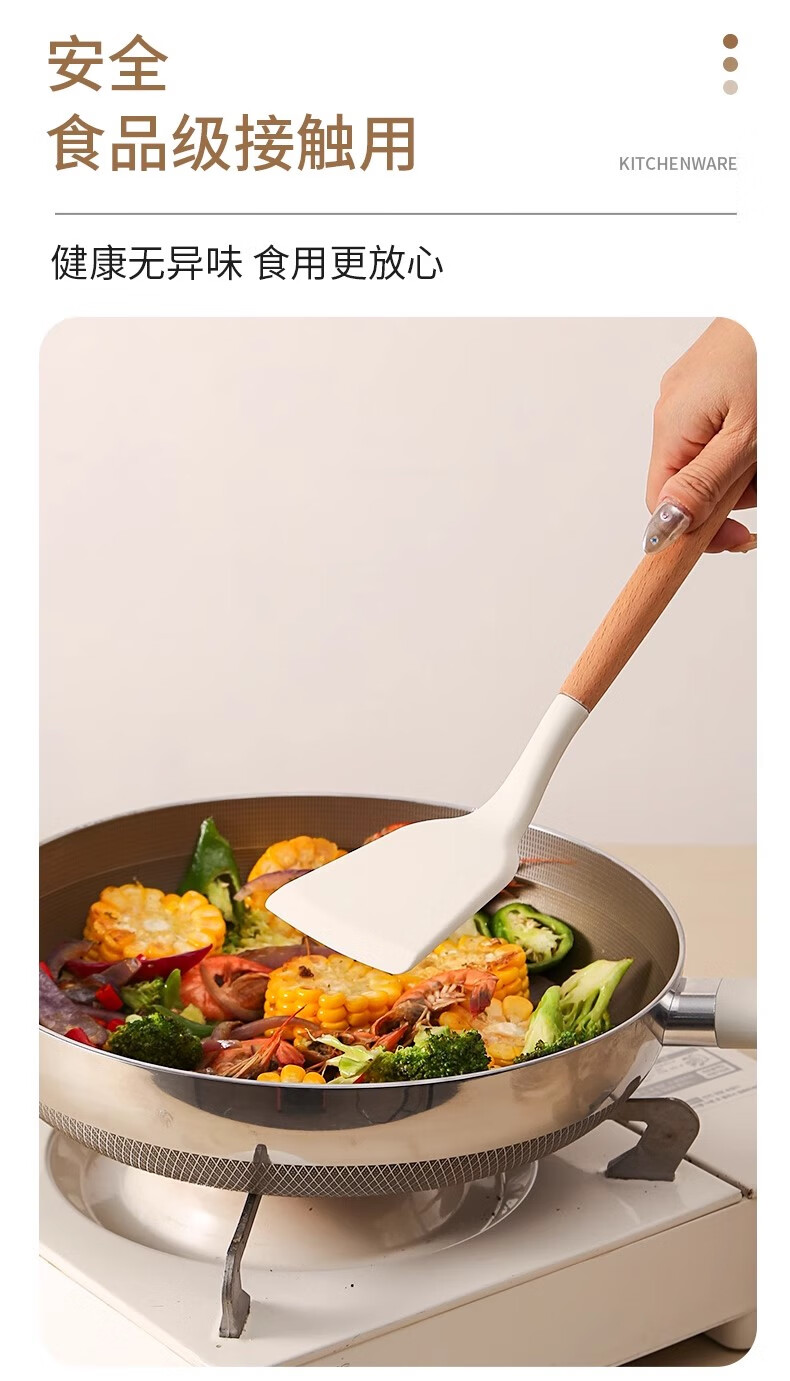 Hanxiao Food Grade Silicone Spoon Large Household Kitchenware High Temperature Stir-Frying Non-Stick Spatula Special Long-Handed Spoon Set Silicone Spoon (Wooden Handle) Off-White