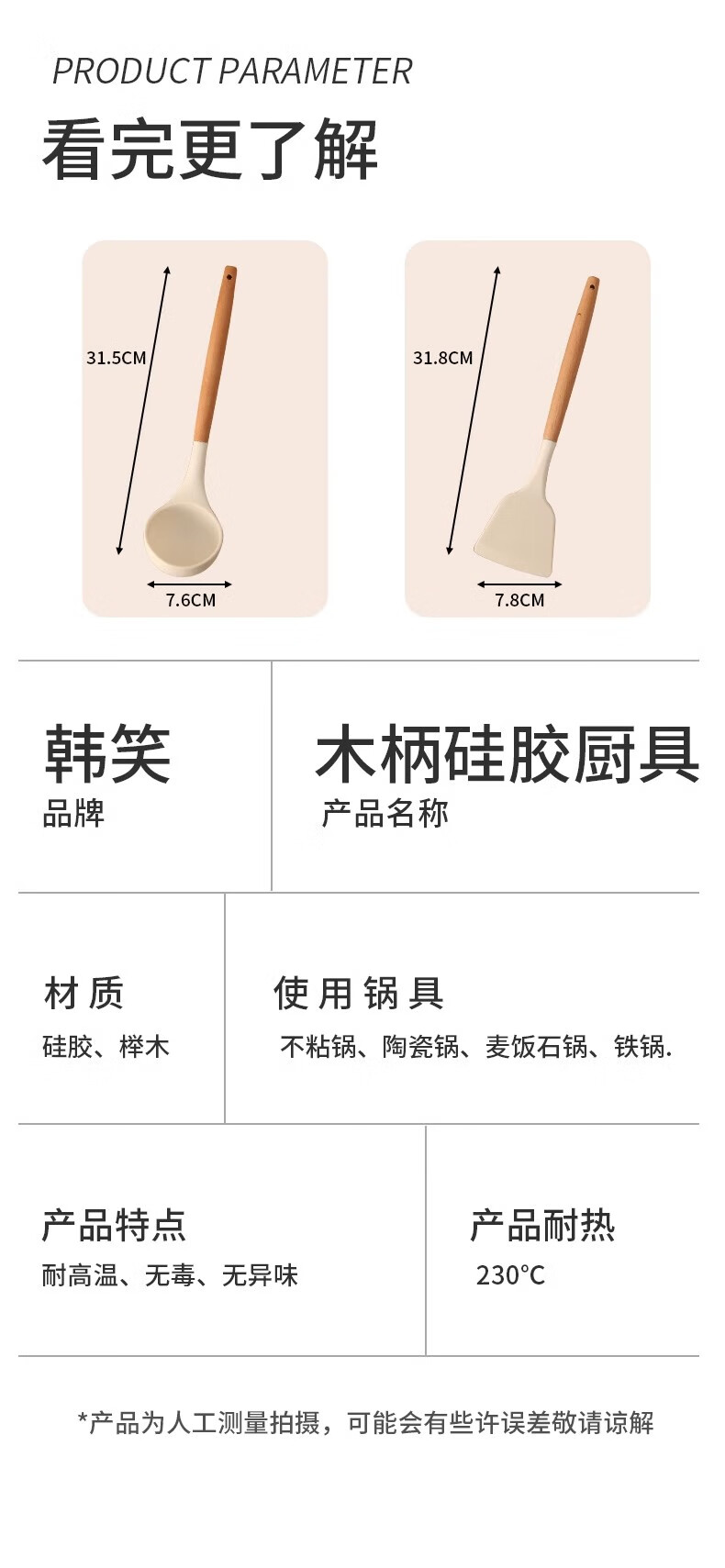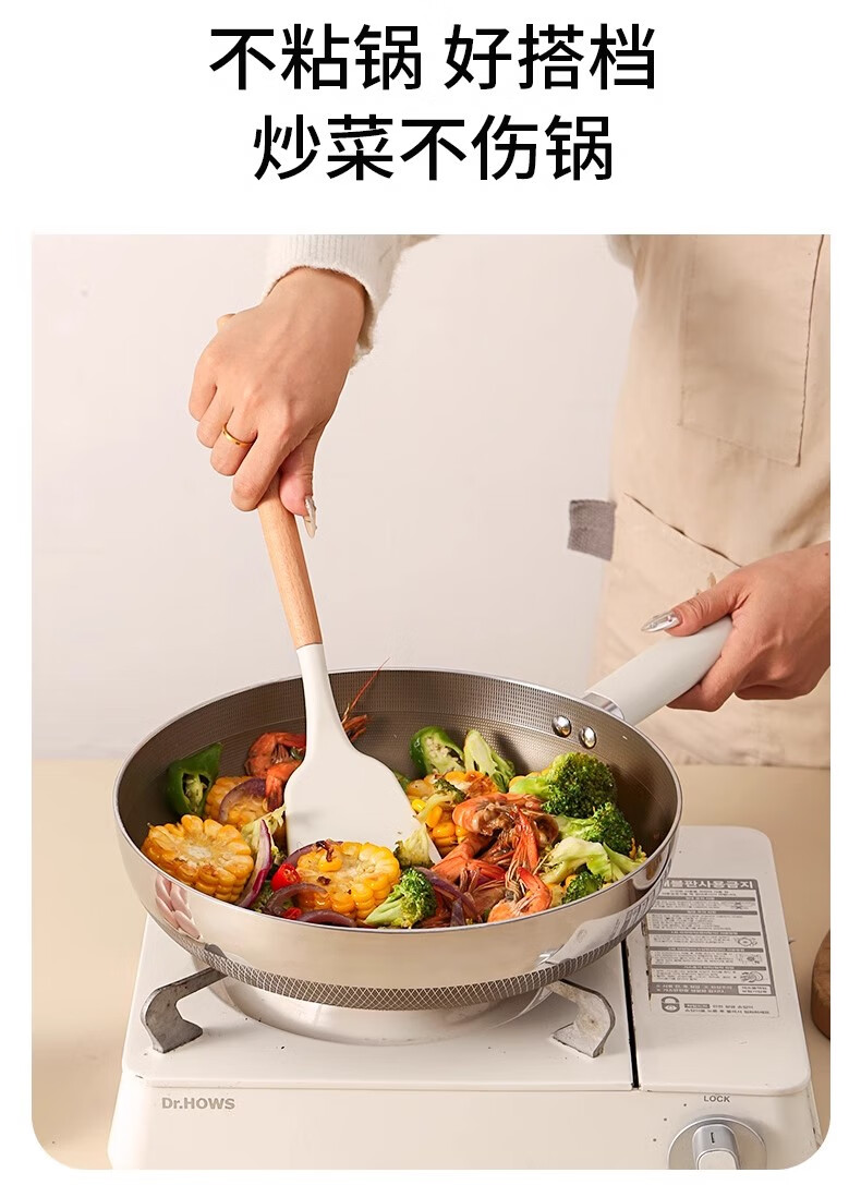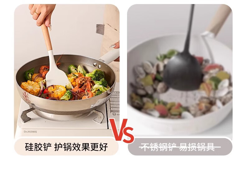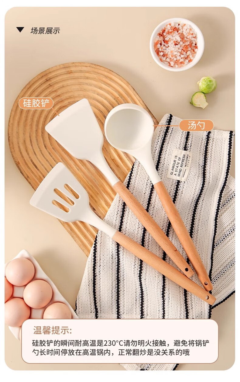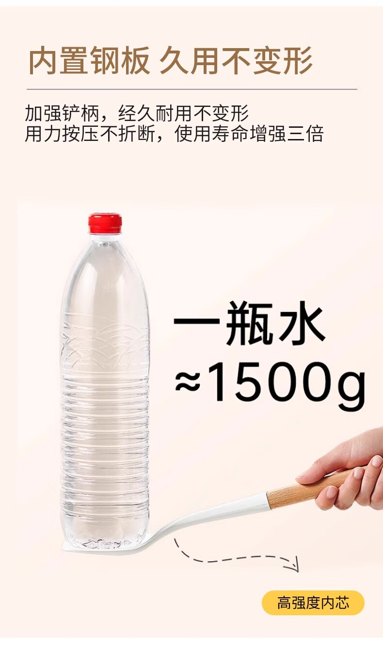 Hanxiao Food Grade Silicone Spoon Large Household Kitchenware High Temperature Stir-Frying Non-Stick Spatula Special Long-Handed Spoon Set Silicone Spoon (Wooden Handle) Off-White