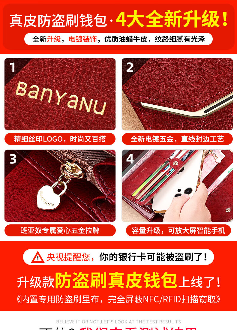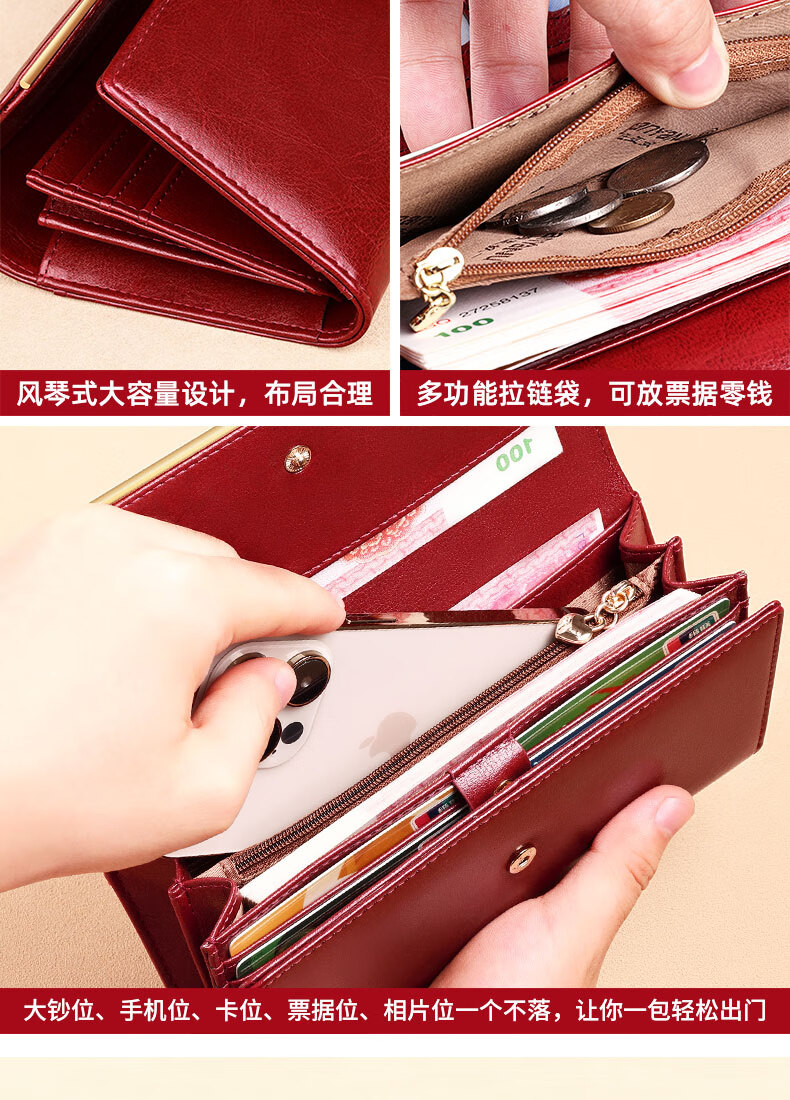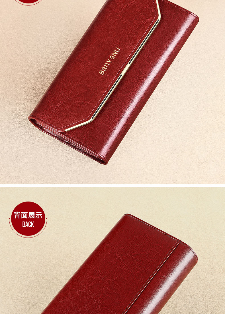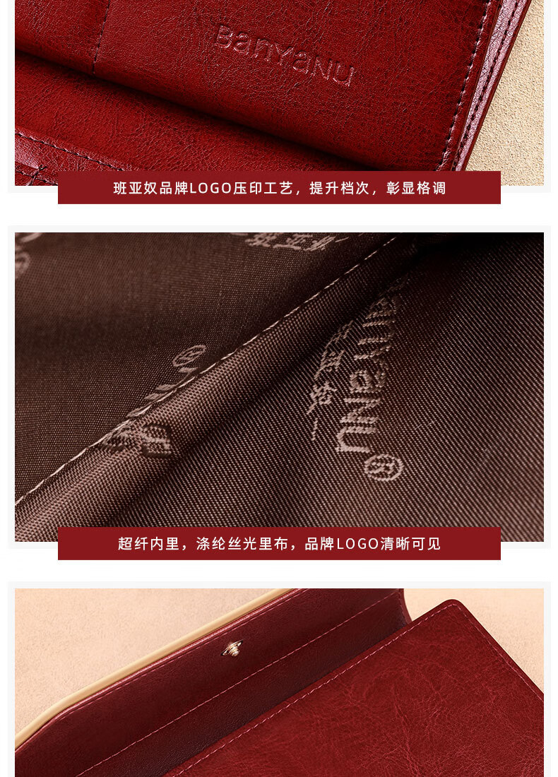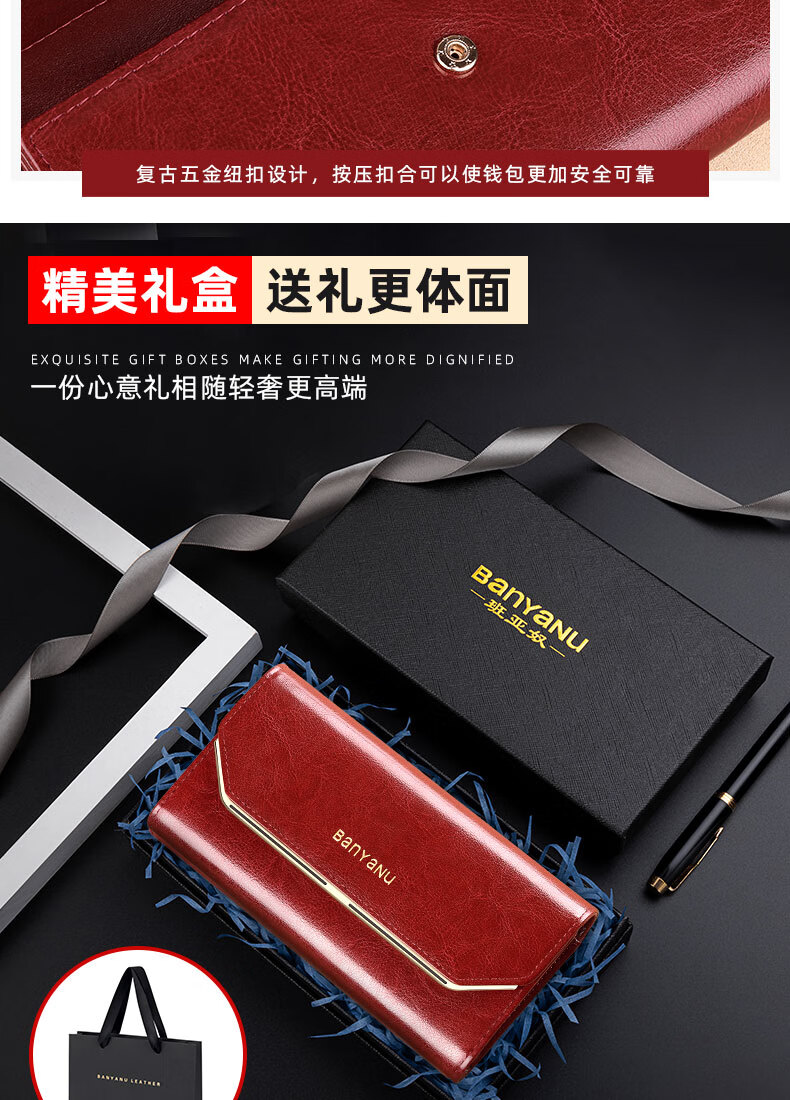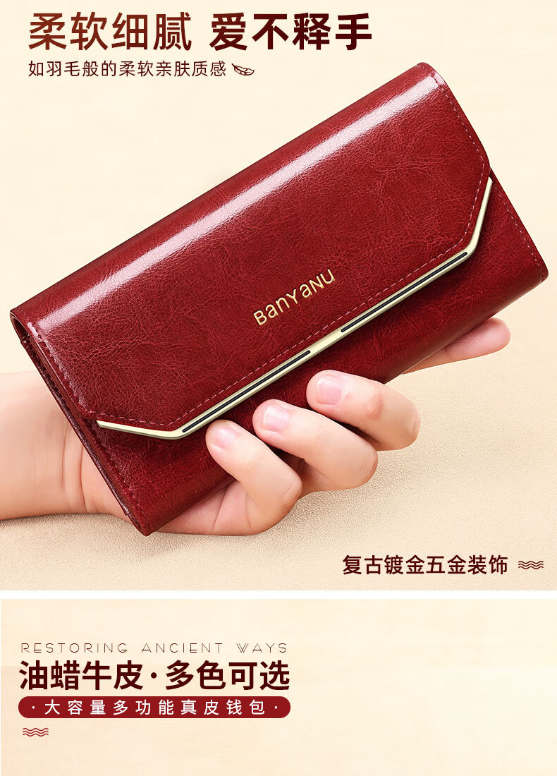 Banyanu Wallet Women's Long Genuine Leather 2024 New Large Capacity High-end Money Pursing Red Coin Purse Counter Wallet Burgundy-Anti-Theft Brush