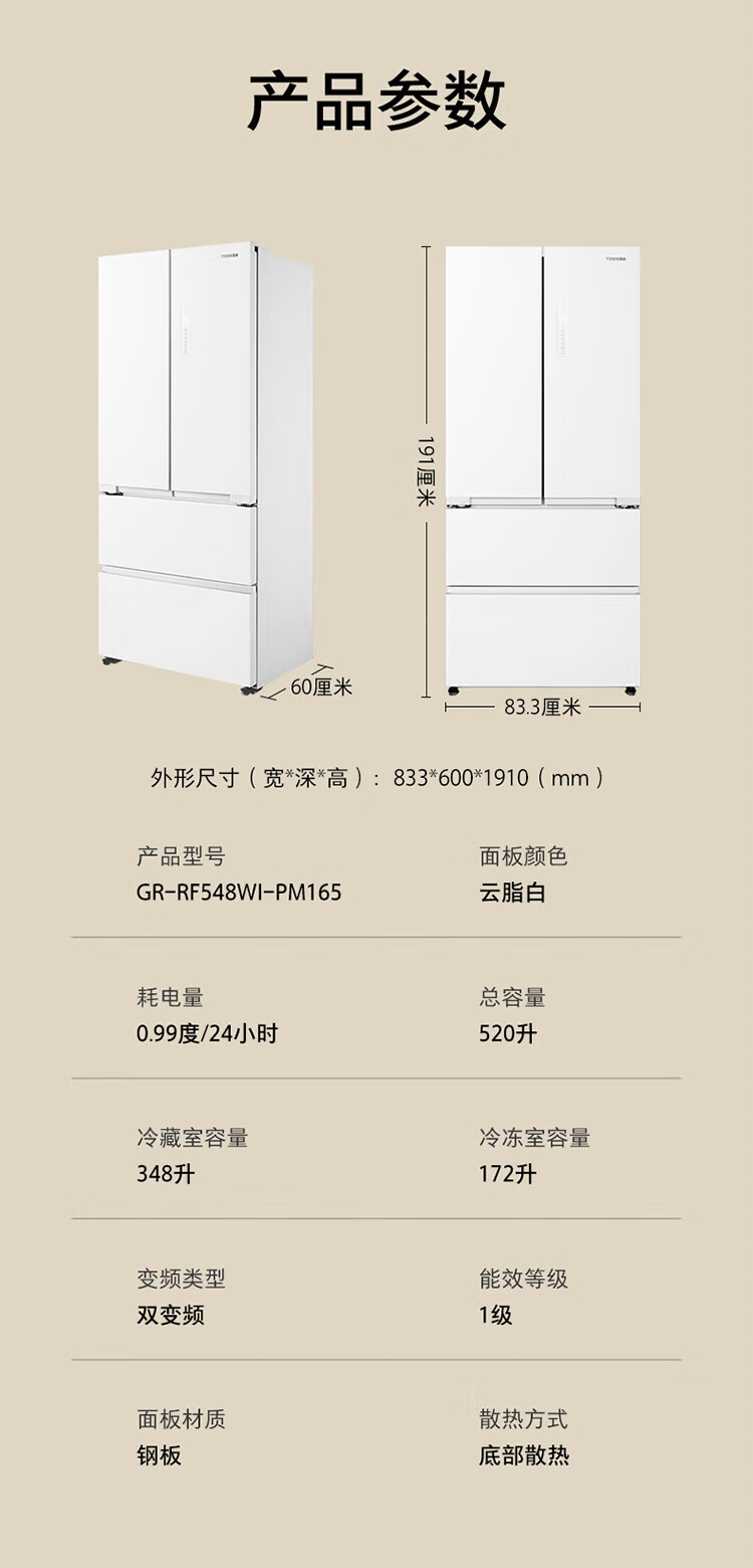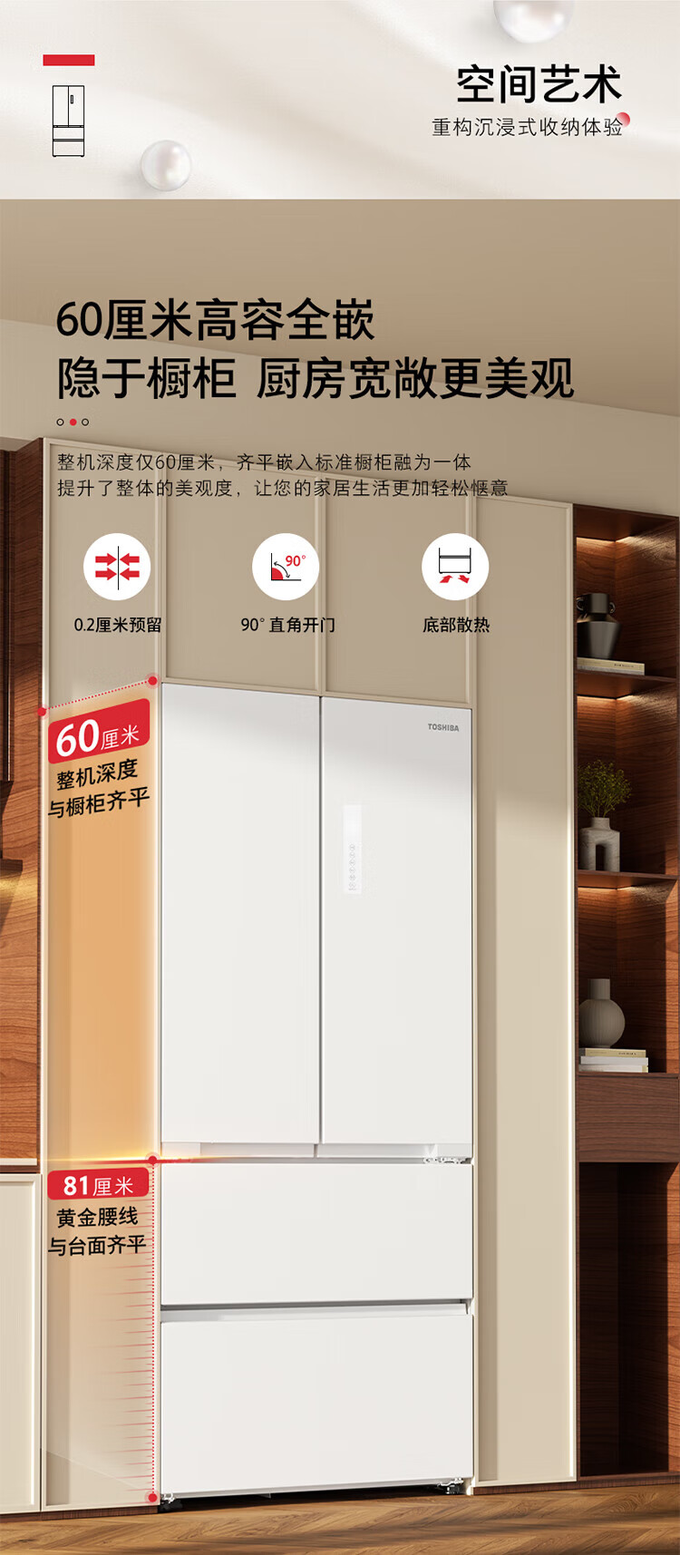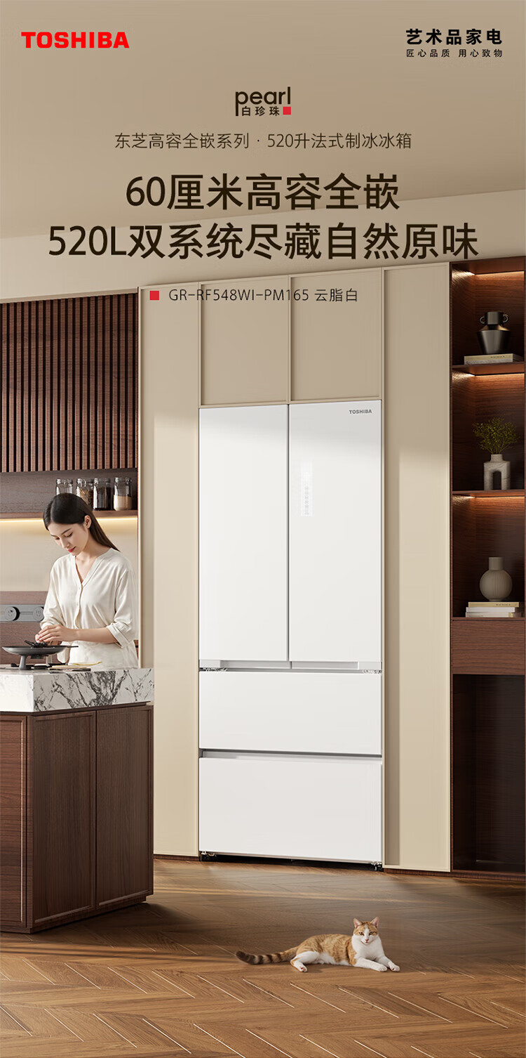 Toshiba 548 White Pearl household 520L French style multi-door refrigerator large capacity ultra-thin embedded dual system dual cycle air cooling frost-free automatic ice making freshness and sterilization GR-RF548WI-PM165 White Pearl