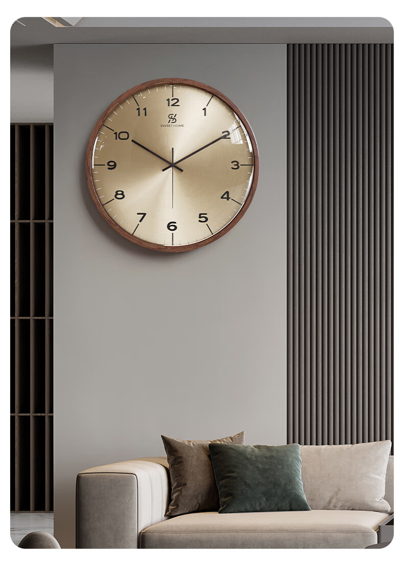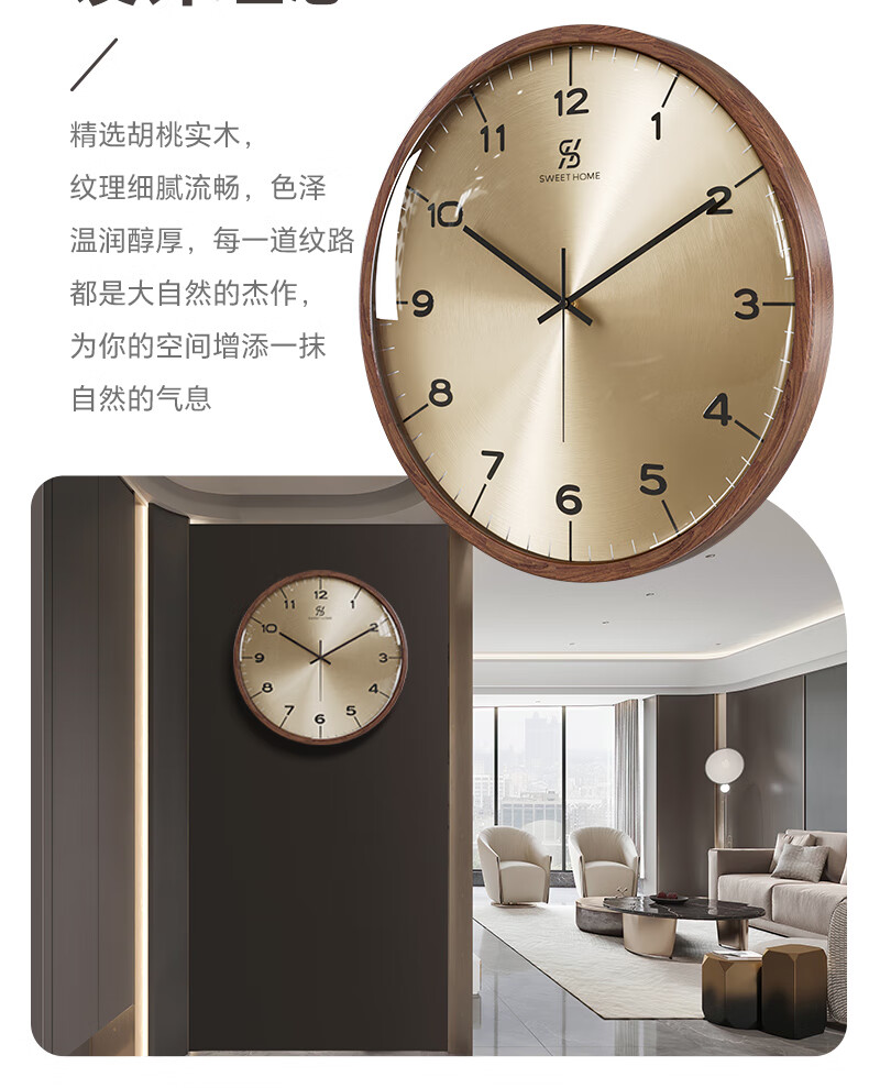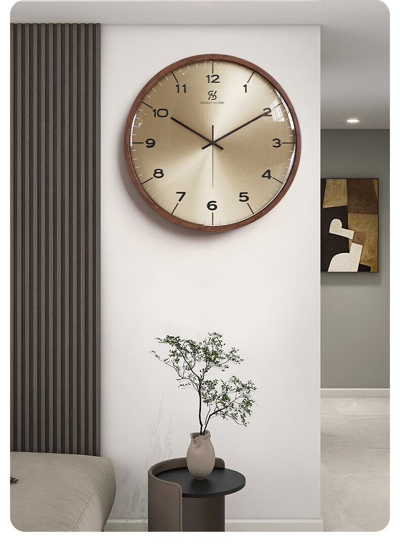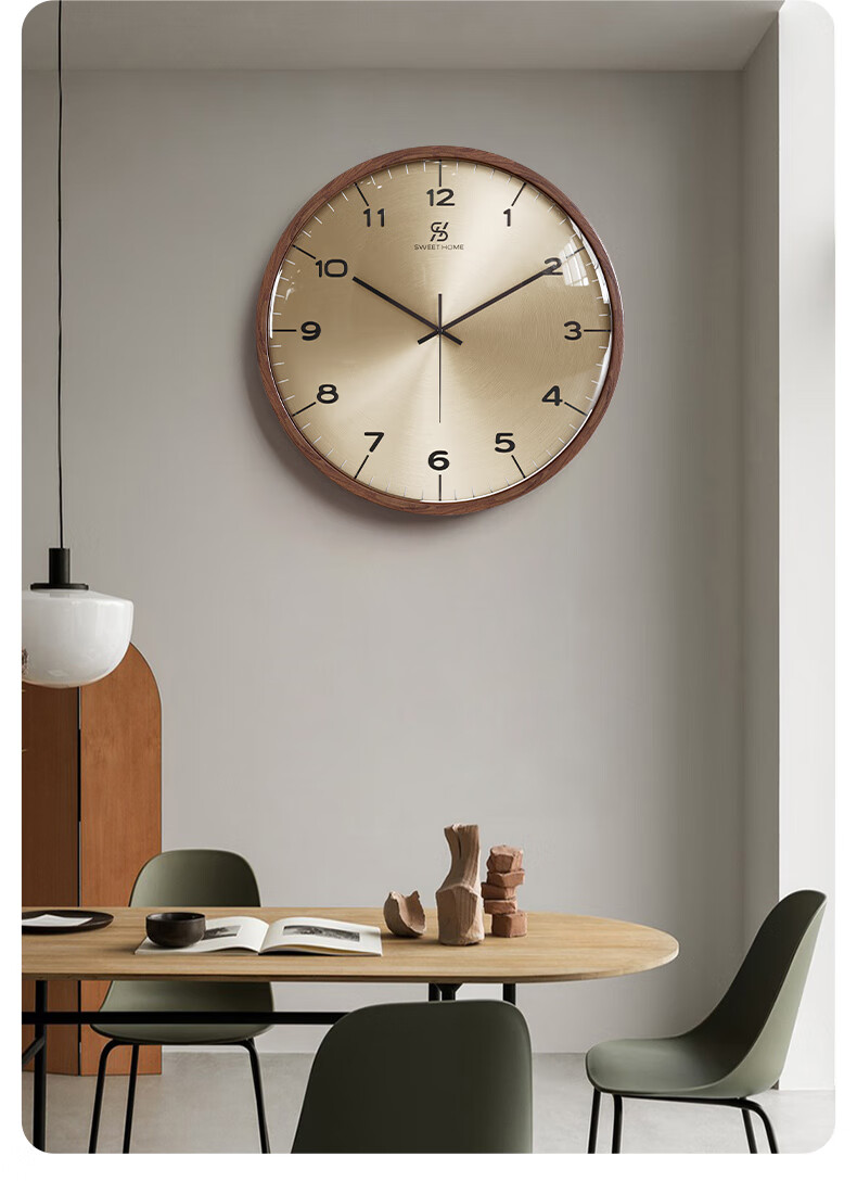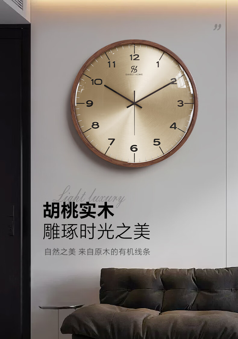 Copper Master 2025 new walnut solid wood wall clock light luxury high-end atmospheric wall clock living room restaurant home quartz clock 35CM-aluminum gold surface-silent movement