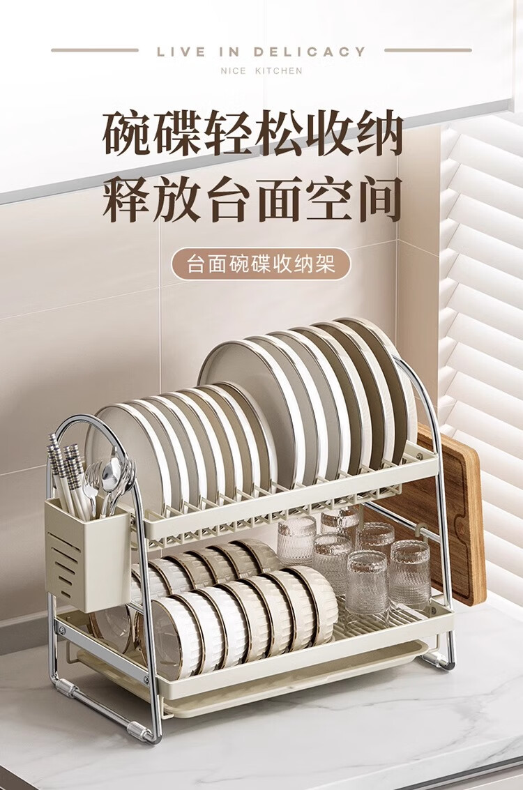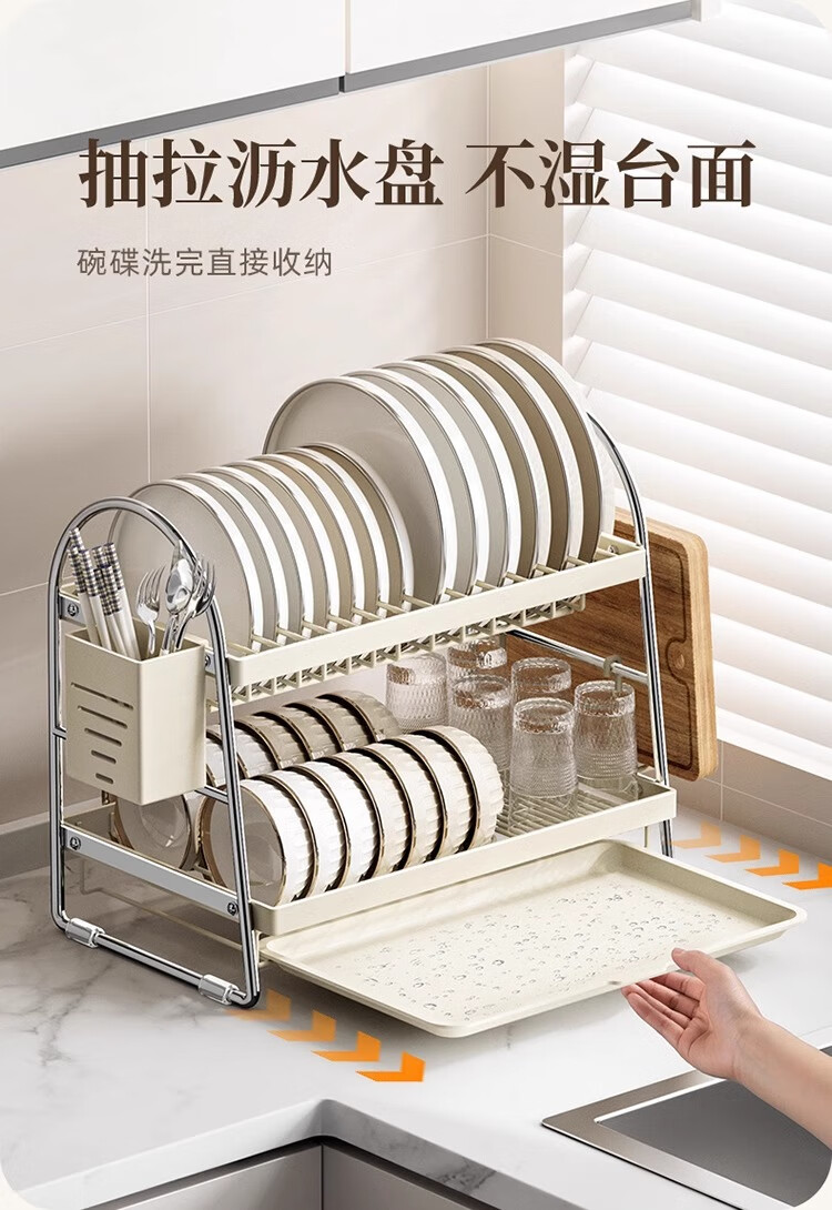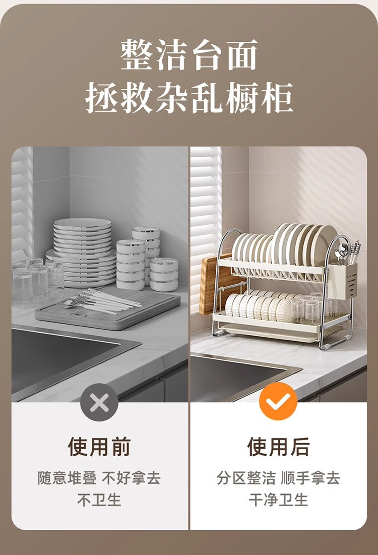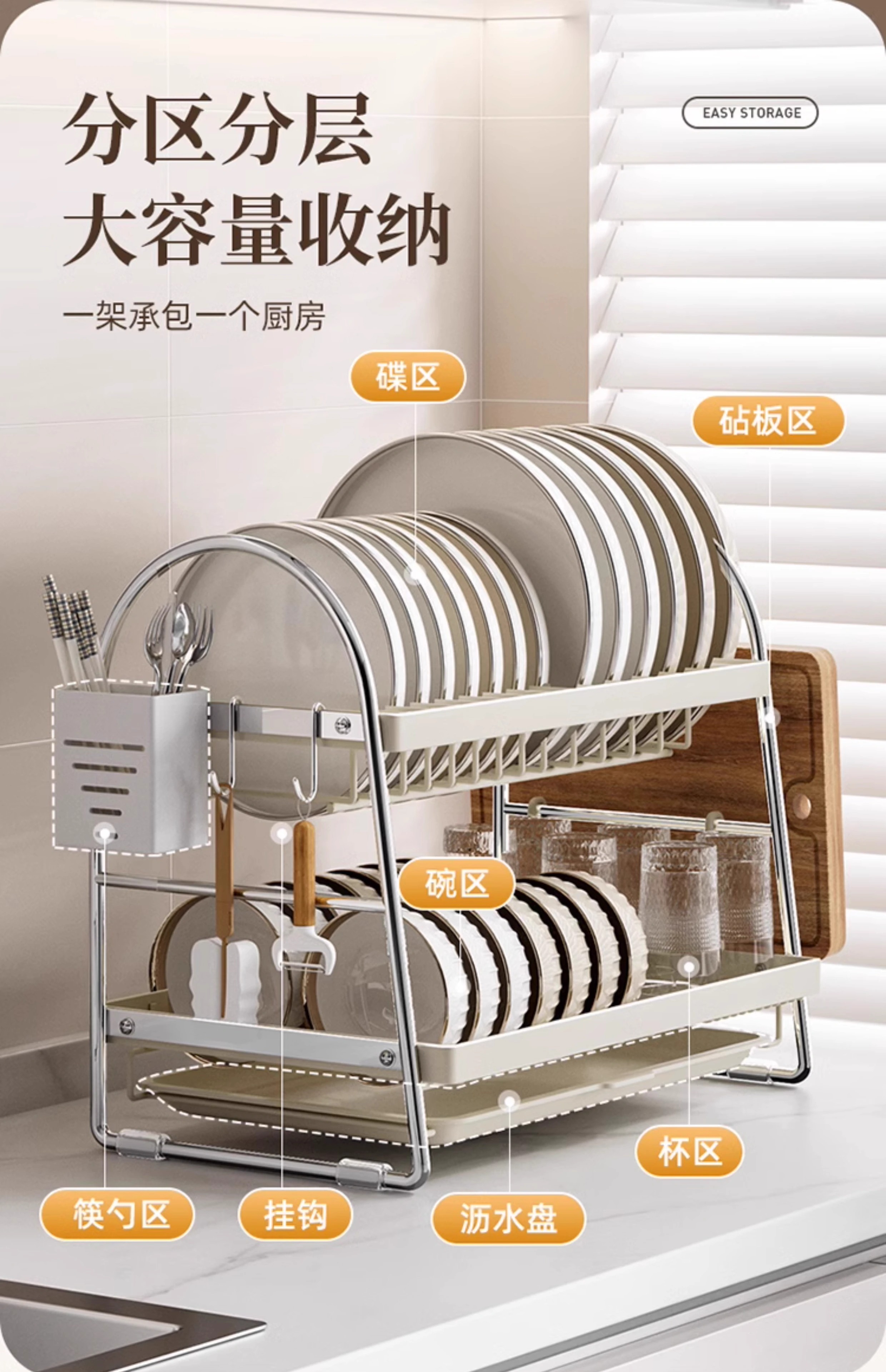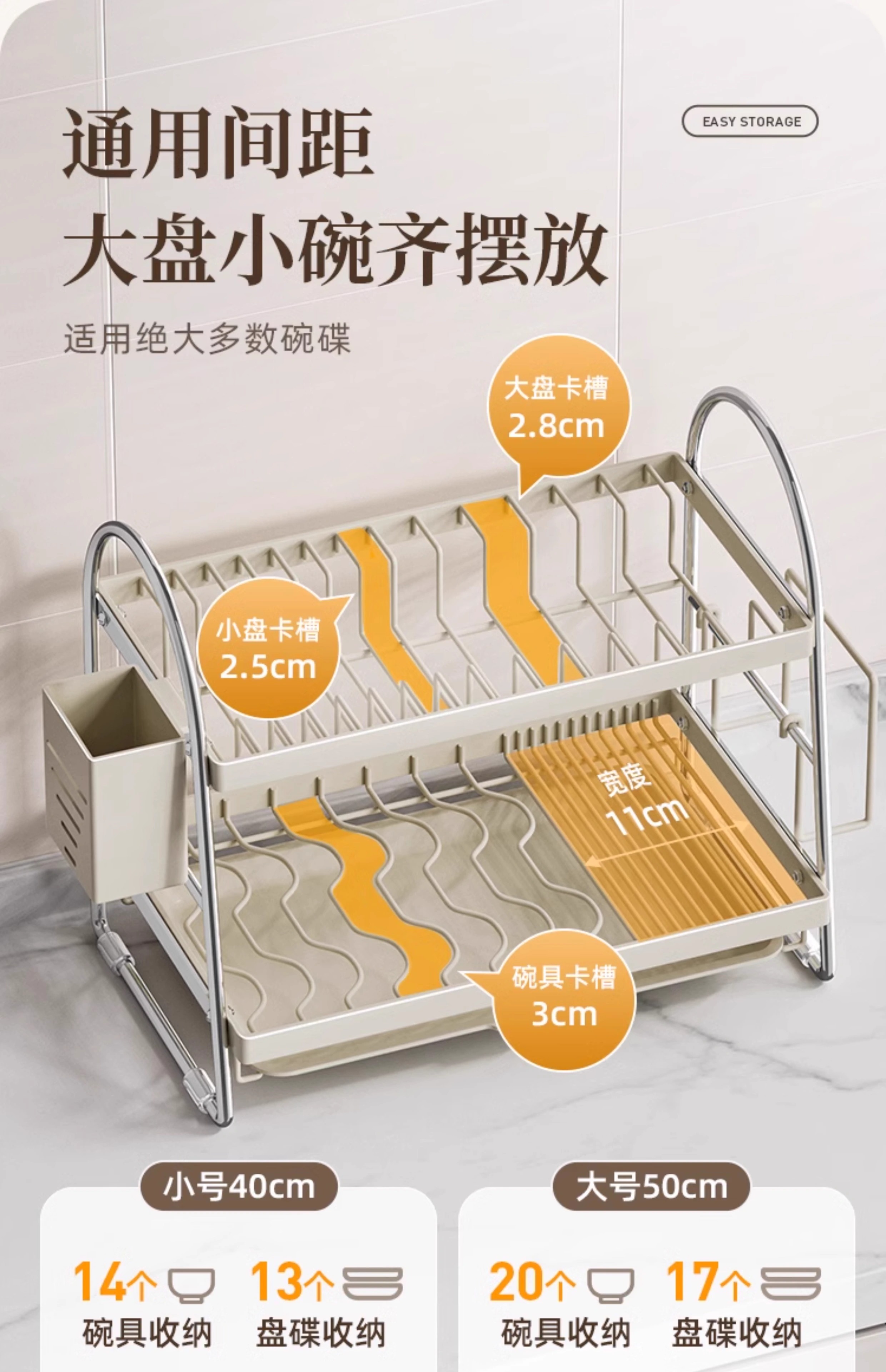 GNNDXX German bowl rack, dish storage rack, kitchen storage rack, multi-functional bowl counter top household dishes and chopsticks drain rack, milk white, double layer 40CM+chopstick tube+cutting board rack, solid carbon steel