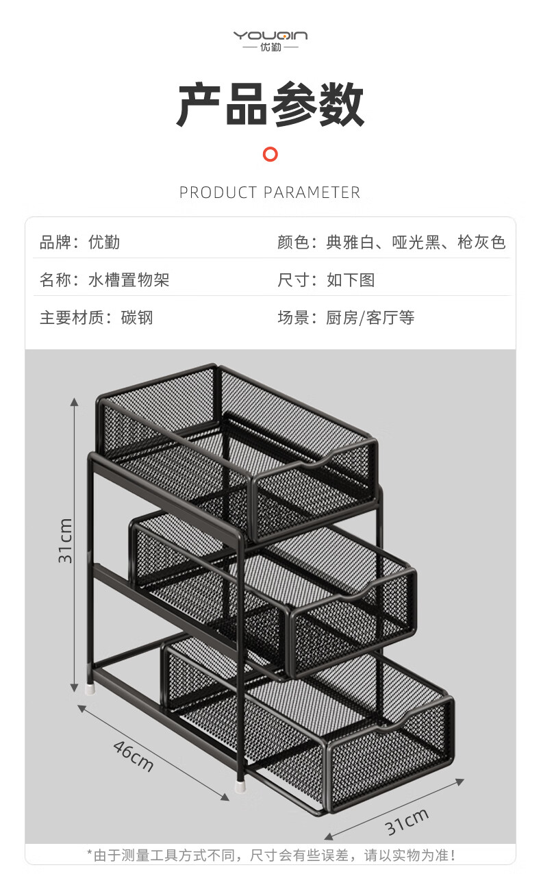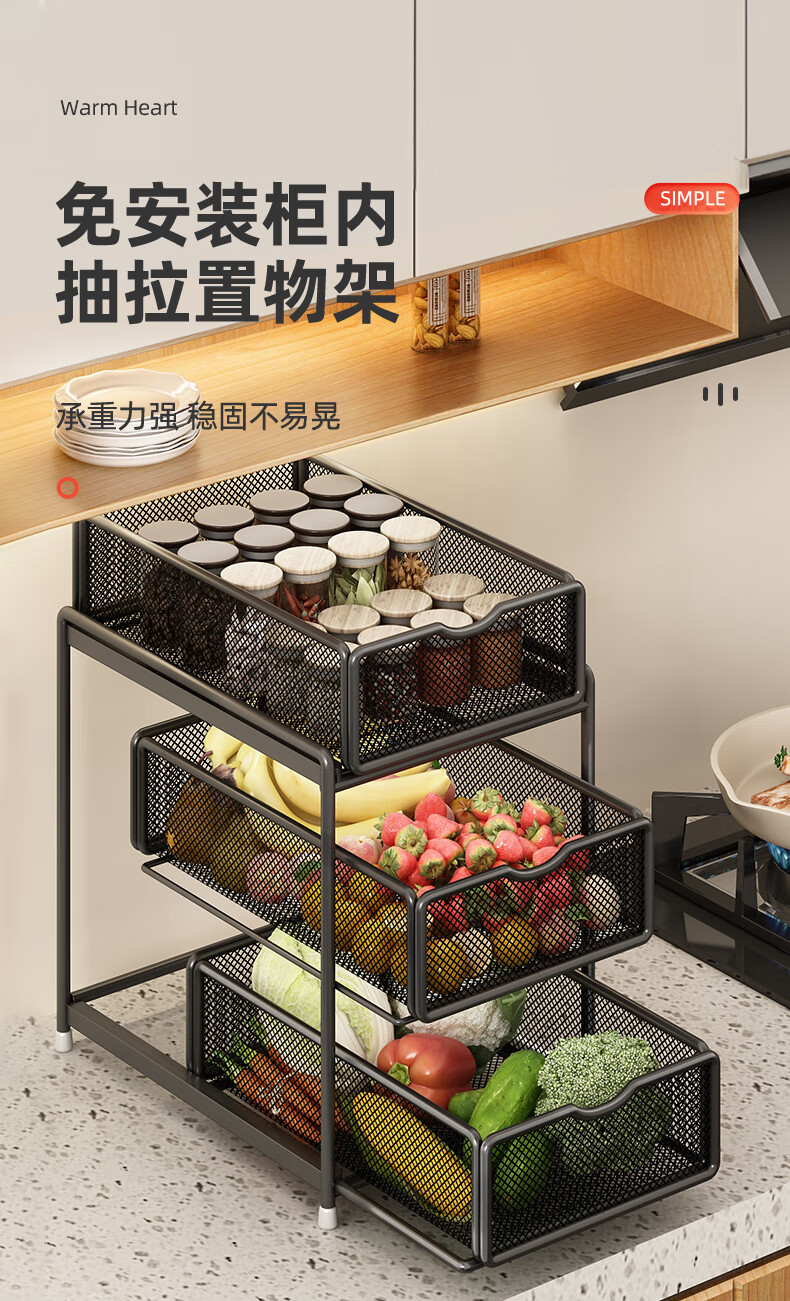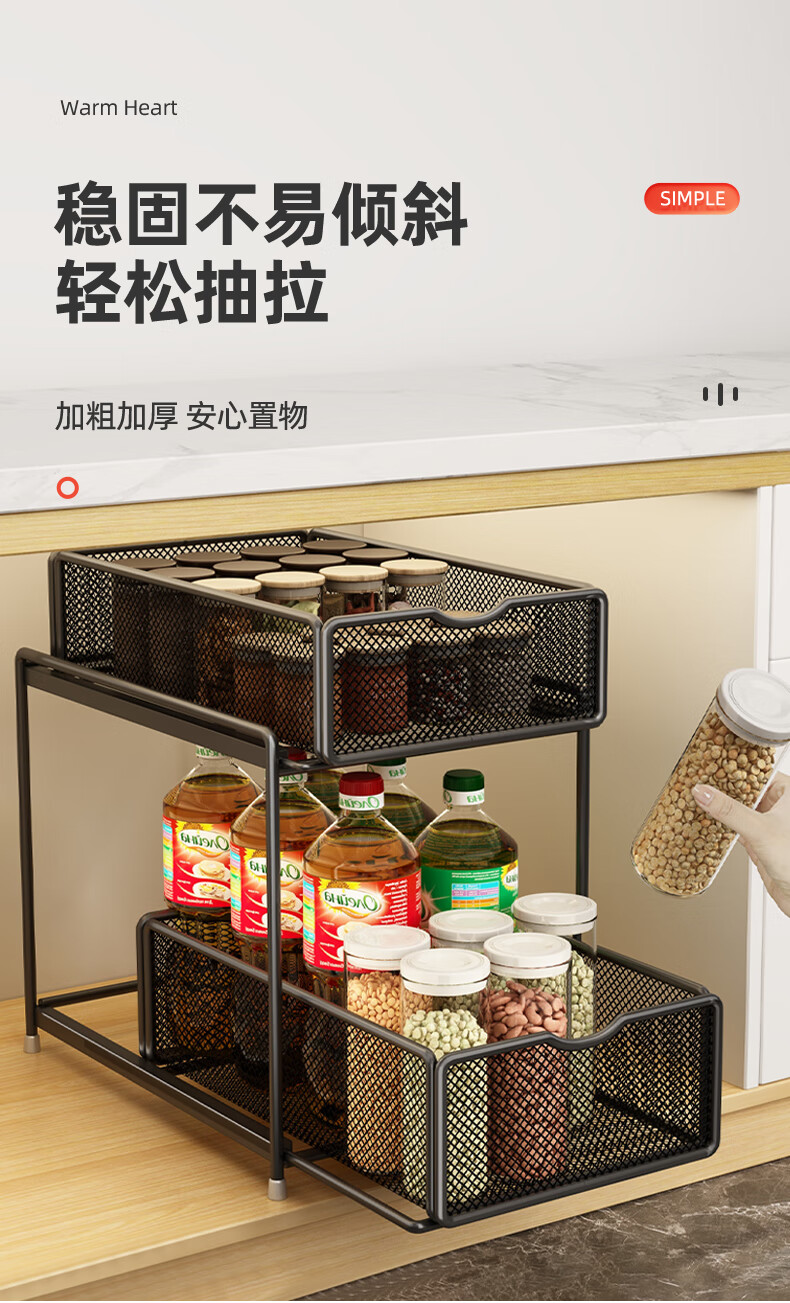 YOUQIN kitchen pull-out storage racks, layered shelves under the sink cabinet, various artifacts, double-layer storage basket, three-layer extra large, deepening the elegant black color.