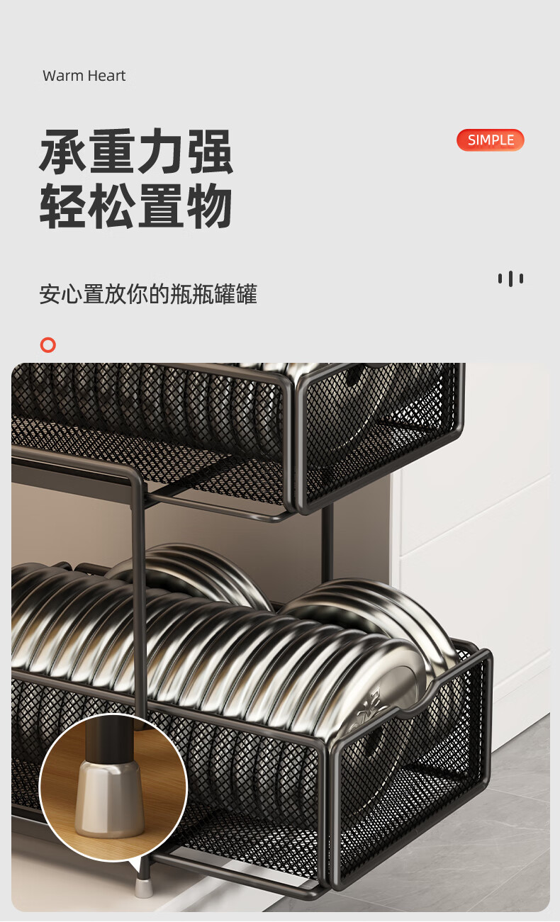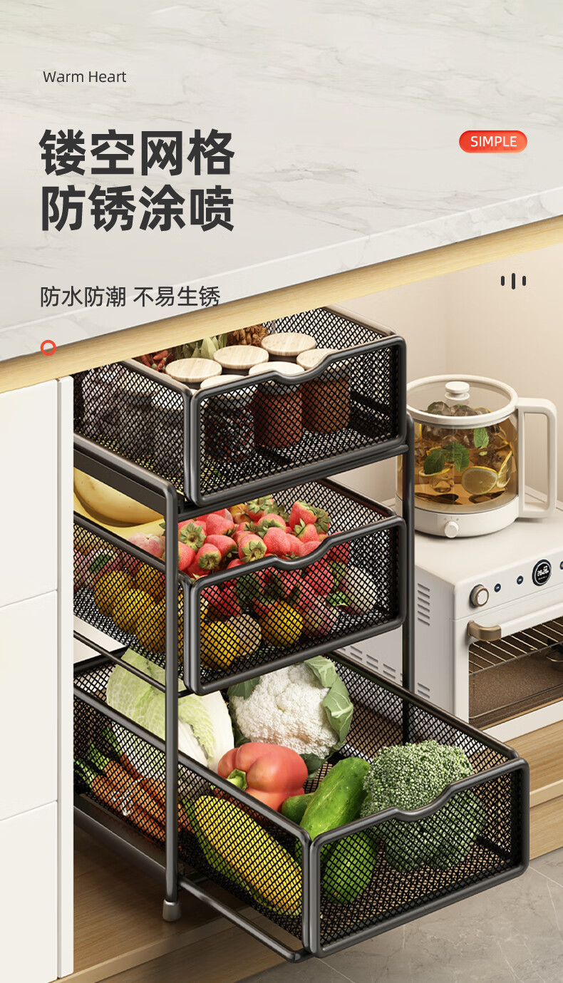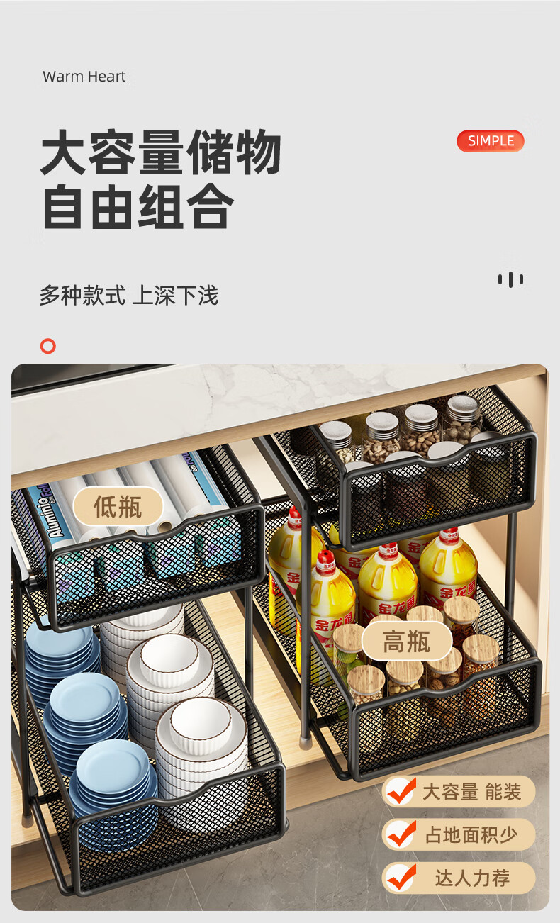 YOUQIN kitchen pull-out storage racks, layered shelves under the sink cabinet, various artifacts, double-layer storage basket, three-layer extra large, deepening the elegant black color.