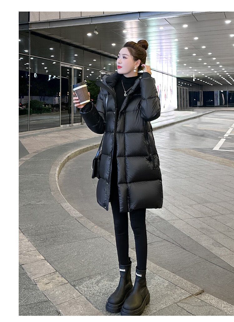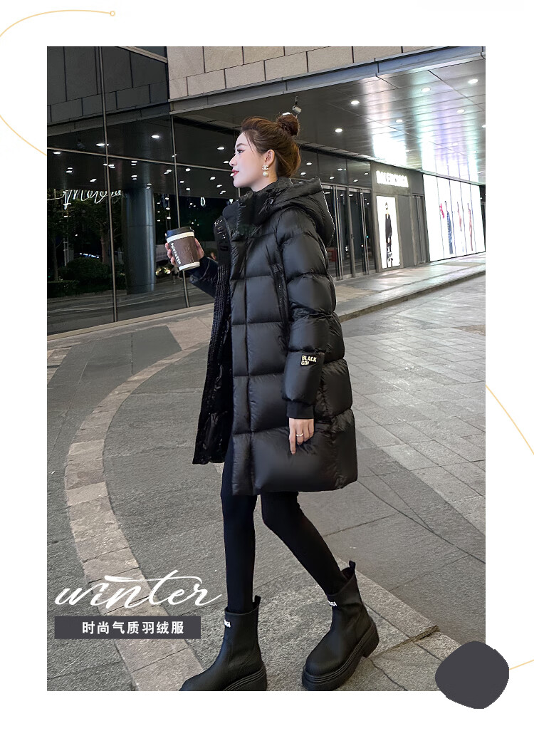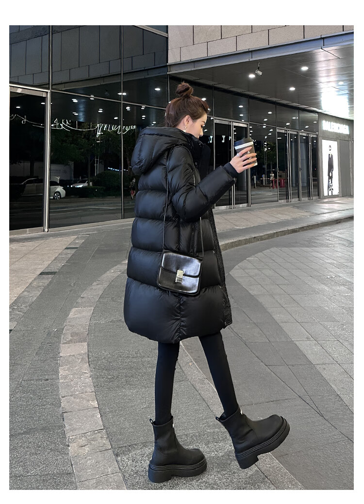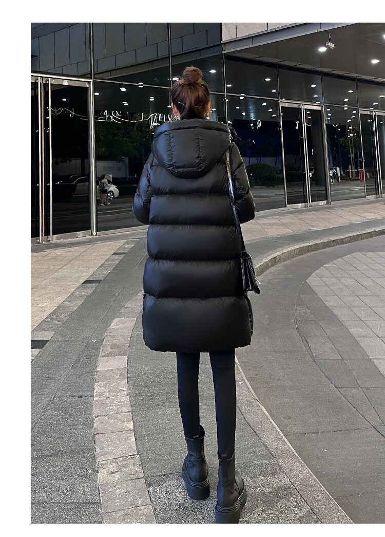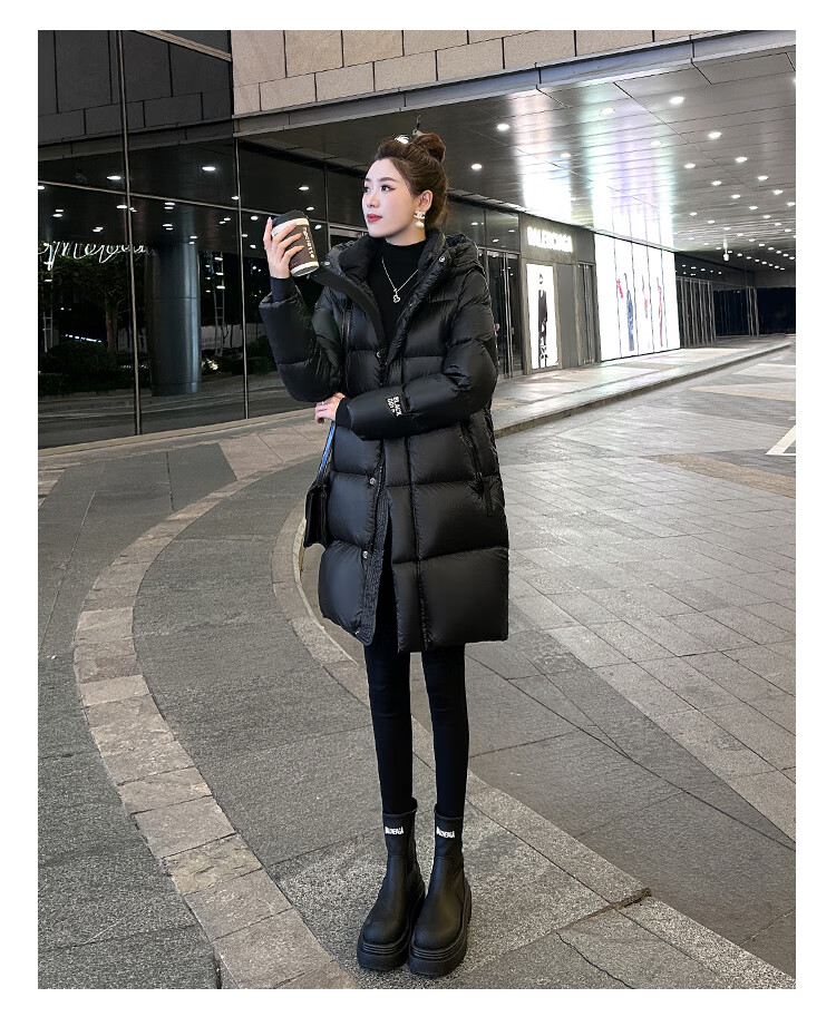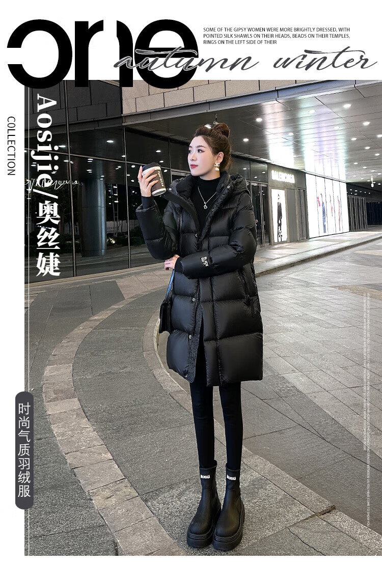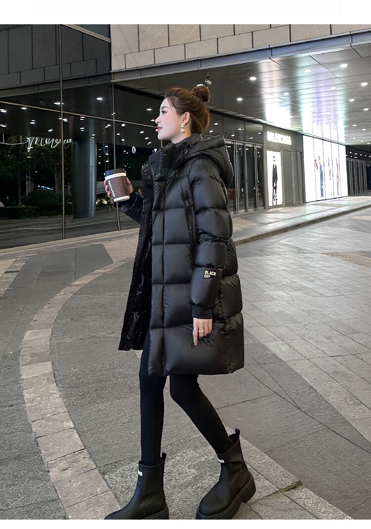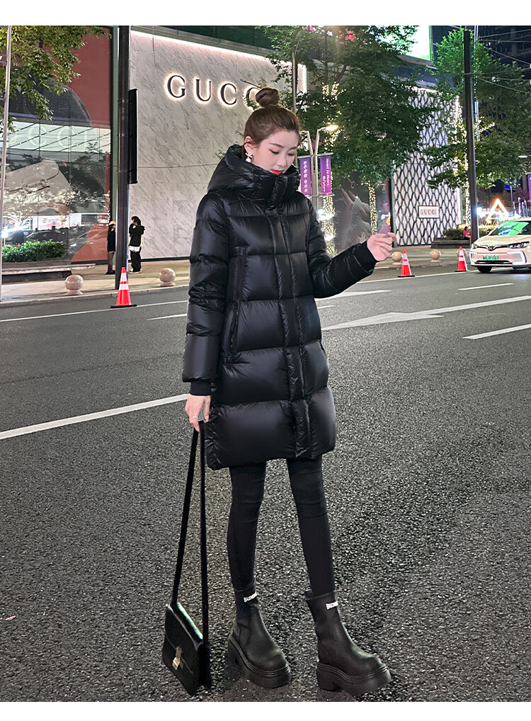 Aosijie high-end brand down jacket women's mid-length 2025 winter new loose temperament thickened white goose down hooded jacket black (black gold 90 white goose down series) M 105-120 catties