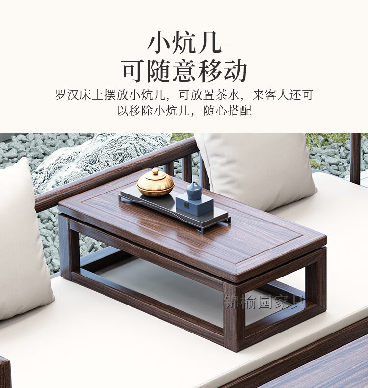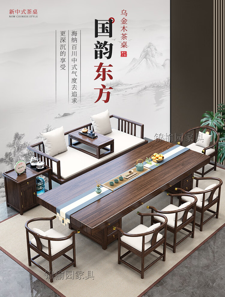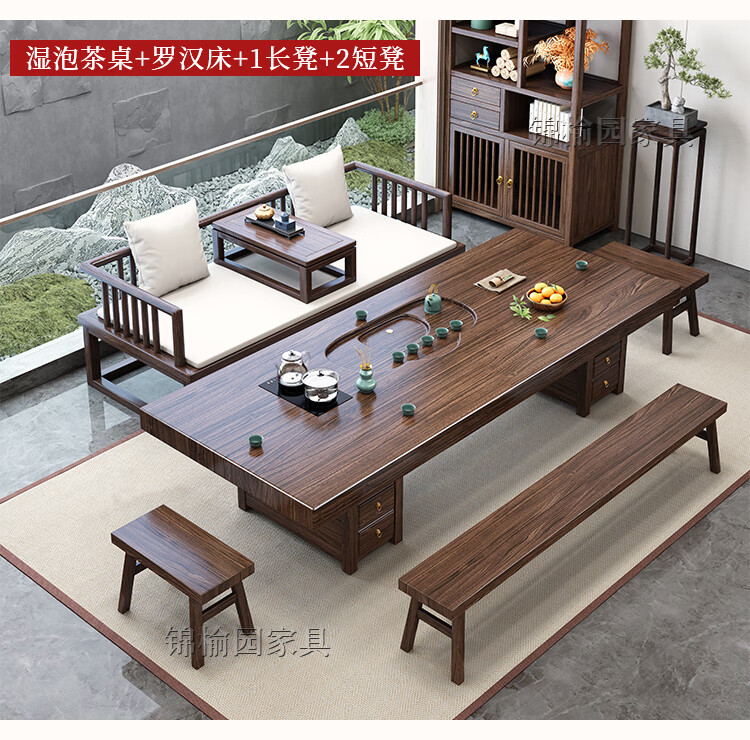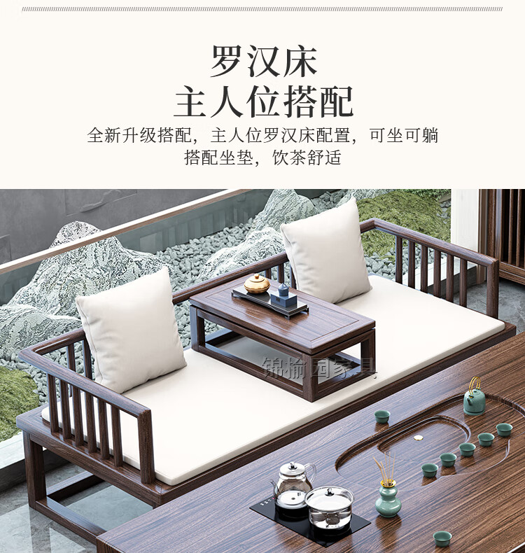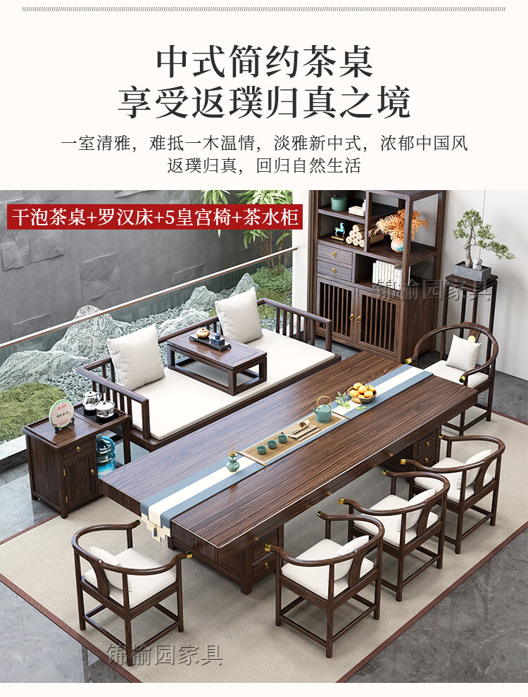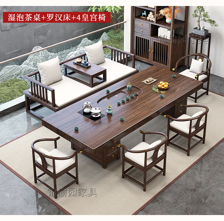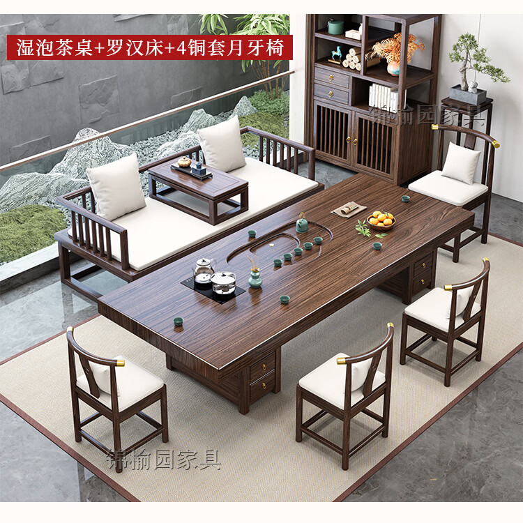 Jinyuyuan black gold large solid wood Arhat bed tea table and chair combination living room home coffee table office tea table tea table 2.2m flat model + Arhat bed + 5 palace chairs + side cabinet