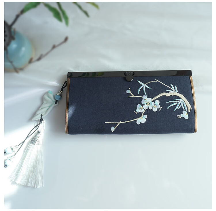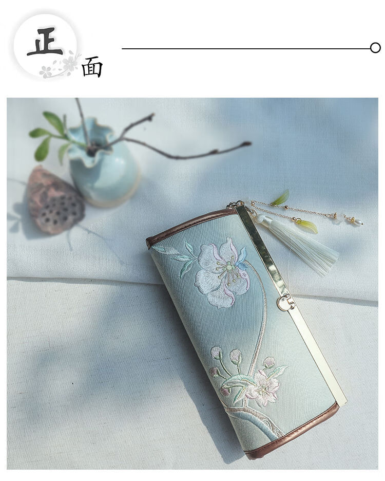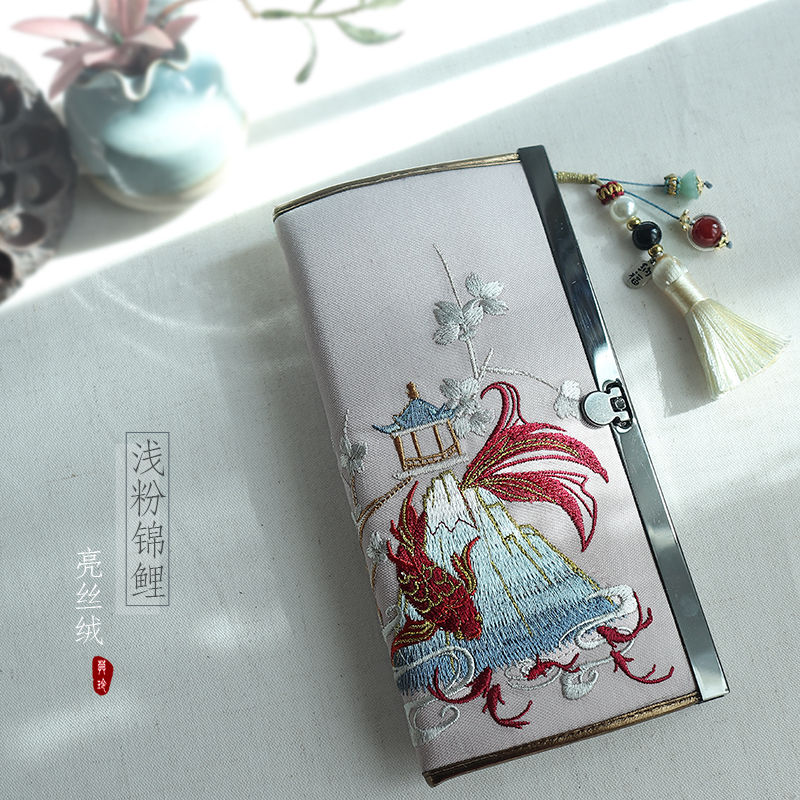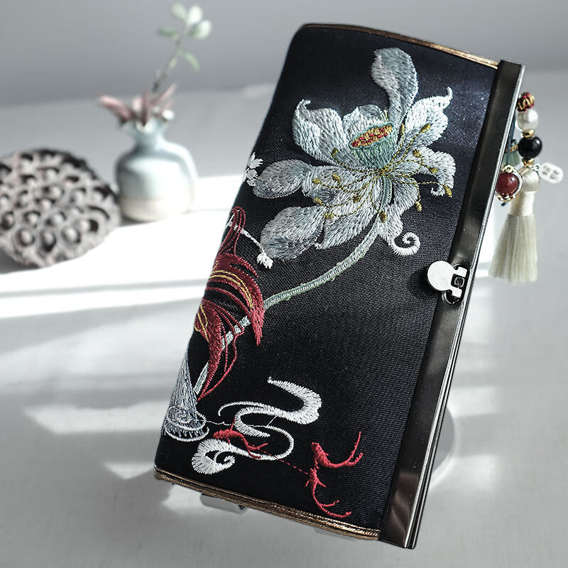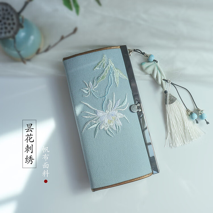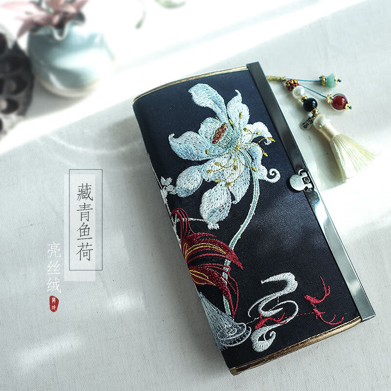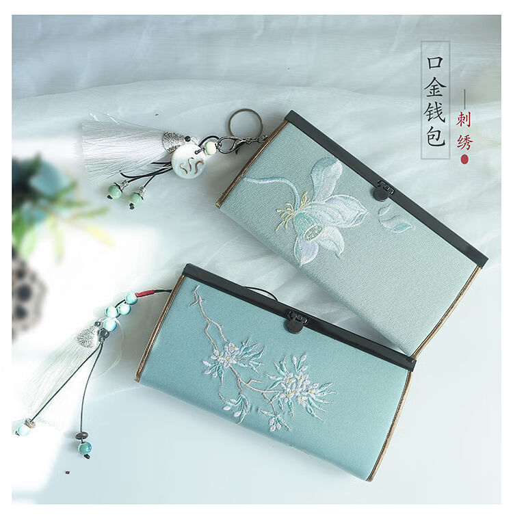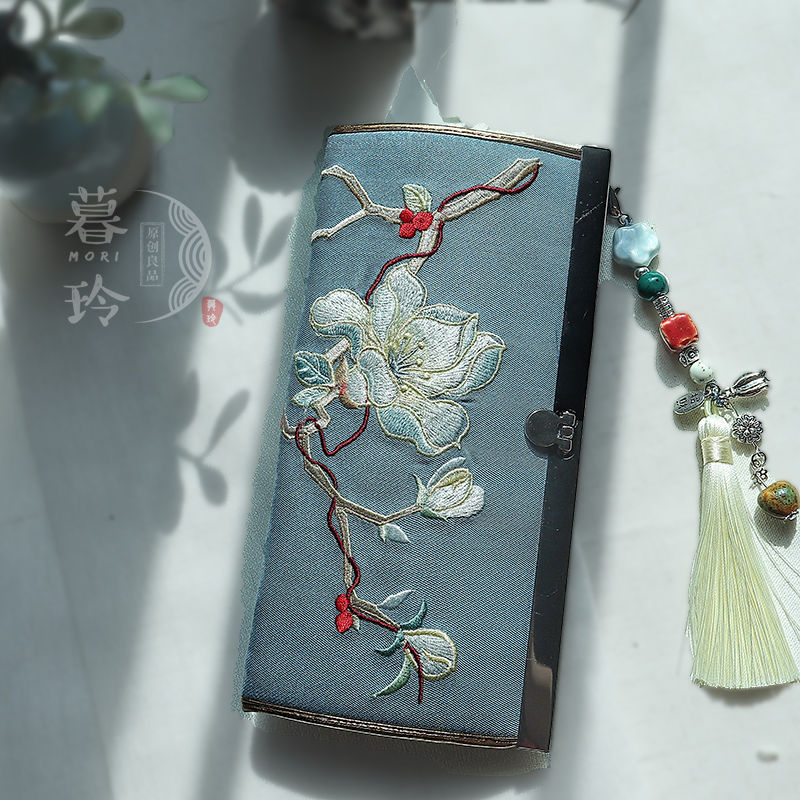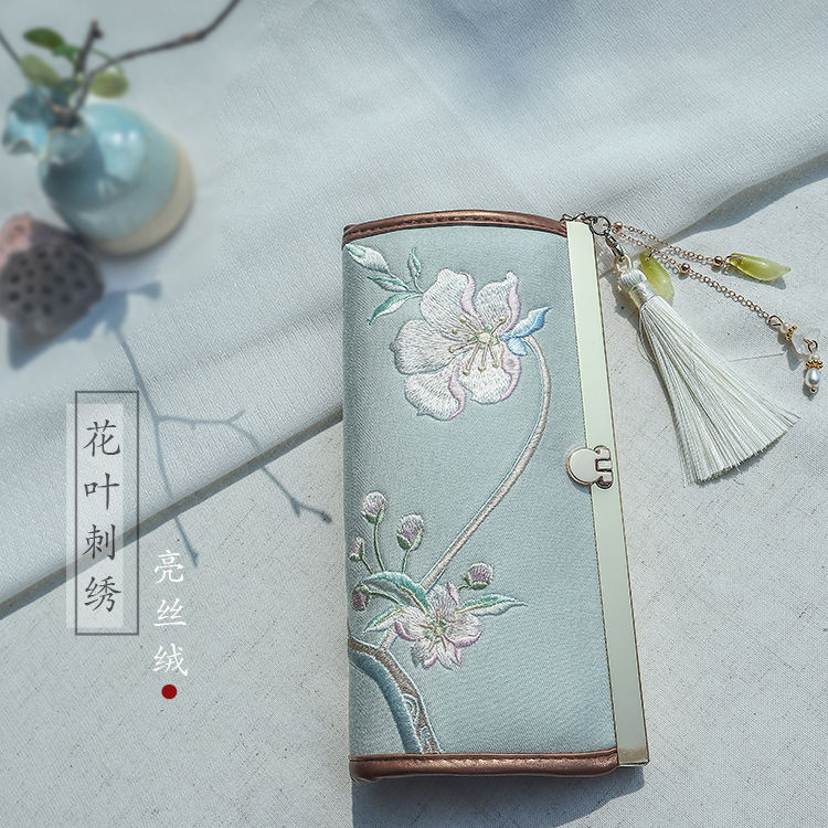 CLCEY hand-held long wallet 8 cards embroidered cloth bag handmade fabric forest style literary retro Chinese style antique ladies gift gift flower and leaf embroidery--bright velvet 19*10