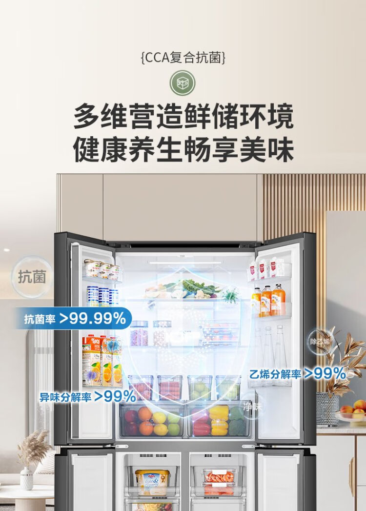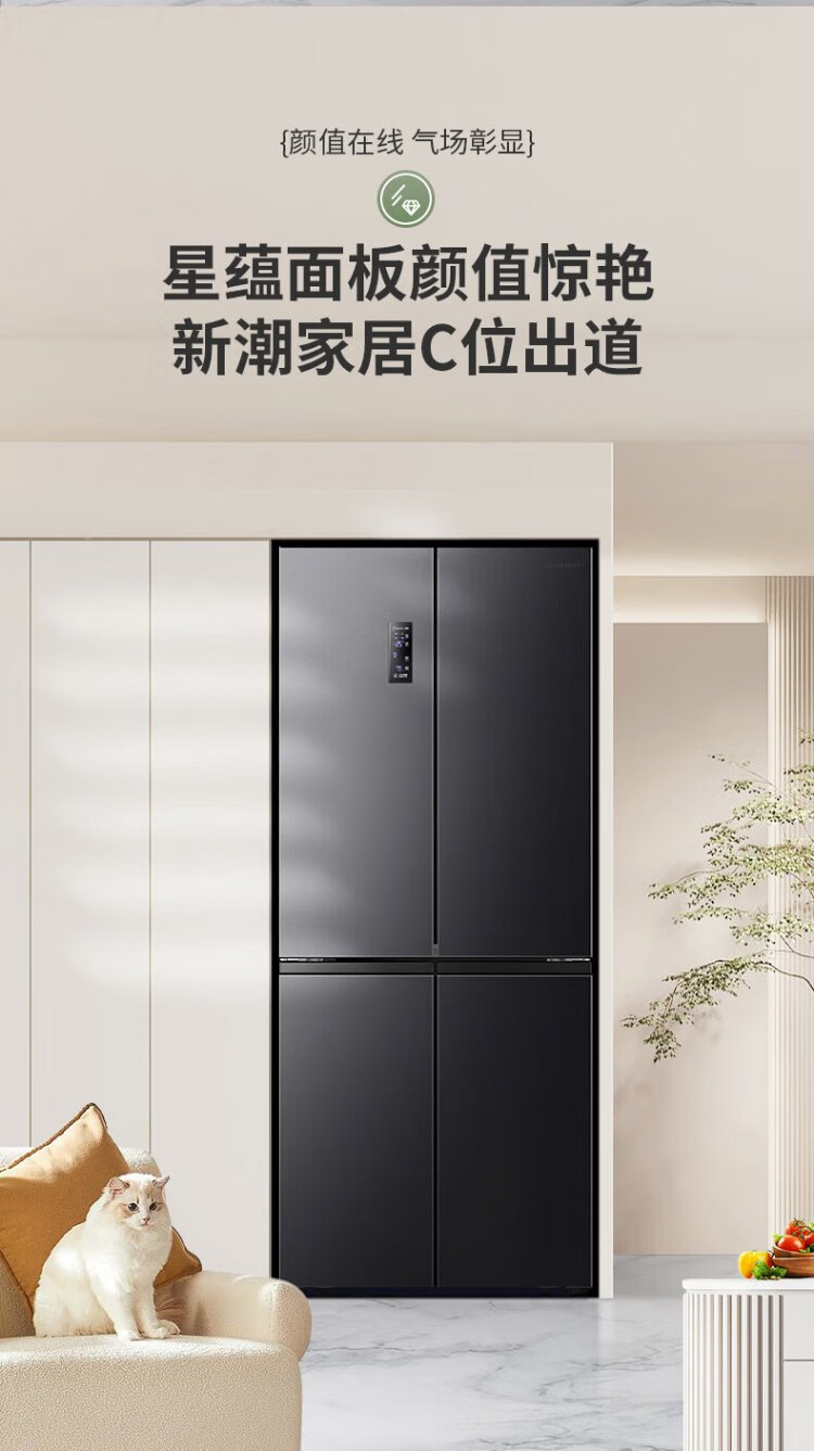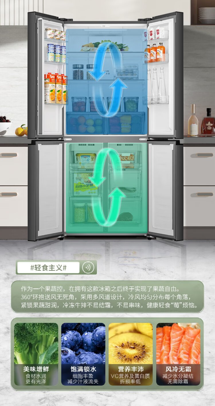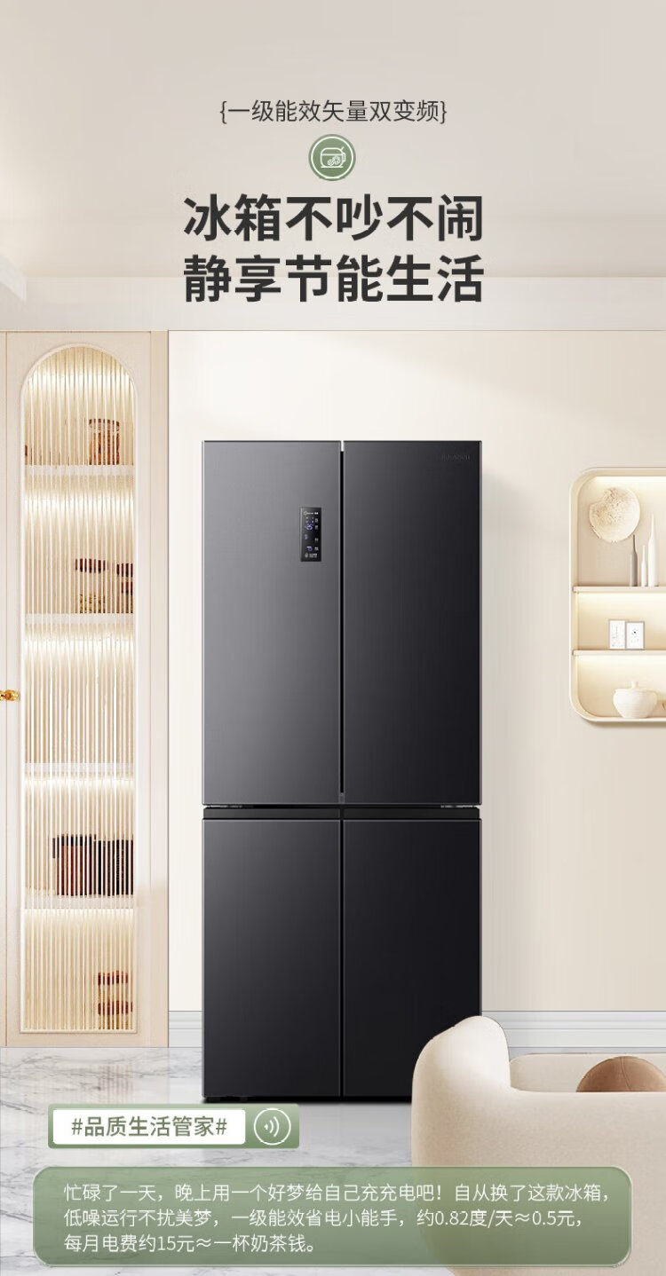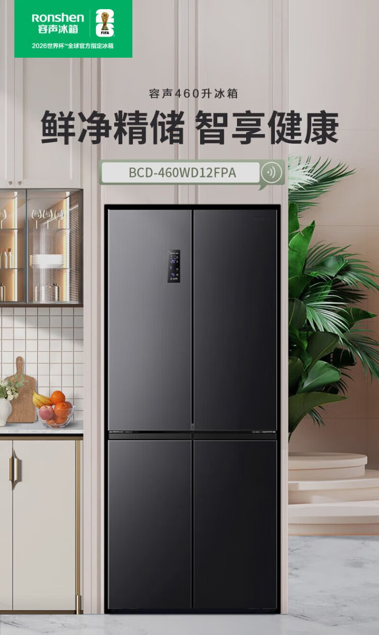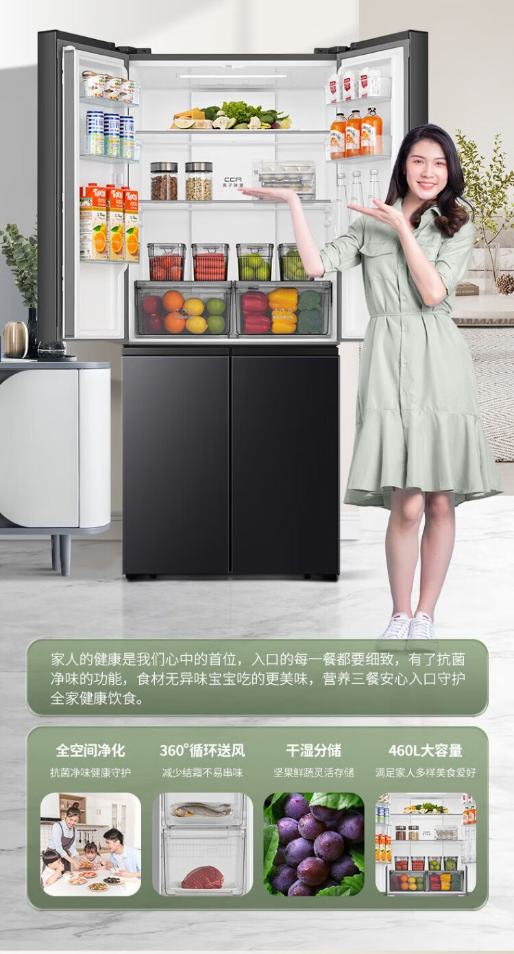 Rongsheng 460 liters cross-fold four-door refrigerator with separate dry and wet storage, air-cooled, frost-free, dual frequency conversion, dual cycle, first-level energy-saving, maternal and infant home, ultra-thin, large capacity, trade-in 460 liters, full space purification + separate wet and dry storage