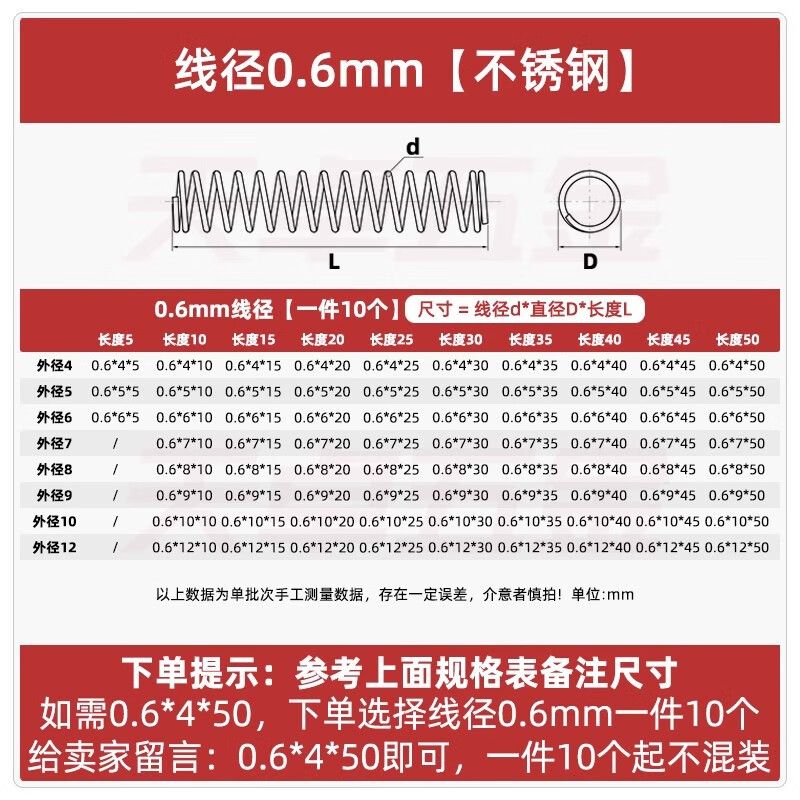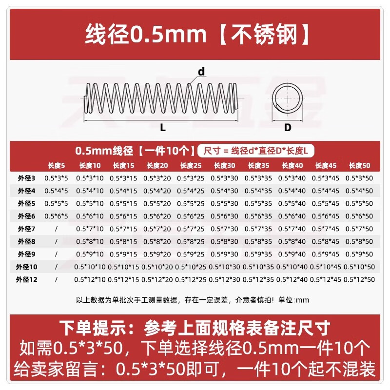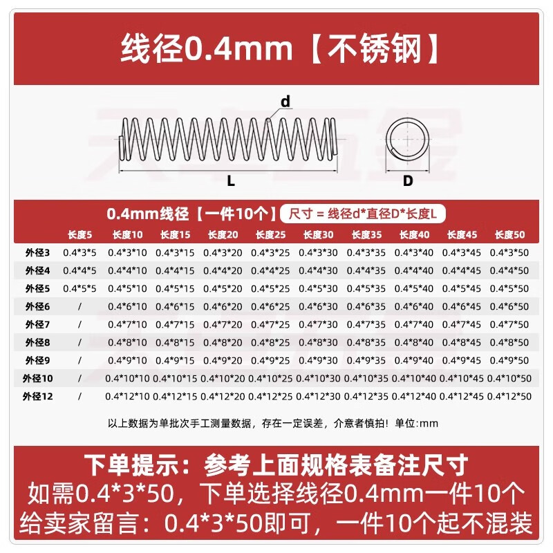 Tianzhuo hardware wire diameter 0.3 0.4 0.5 0.6mm 304 stainless steel compression spring compression spring pressure size shock absorbing spring 0.3*3*5 10 pieces