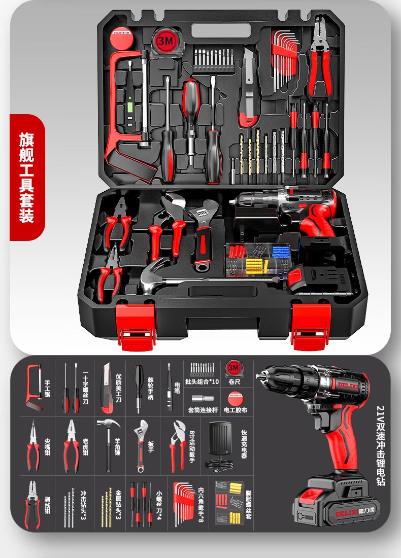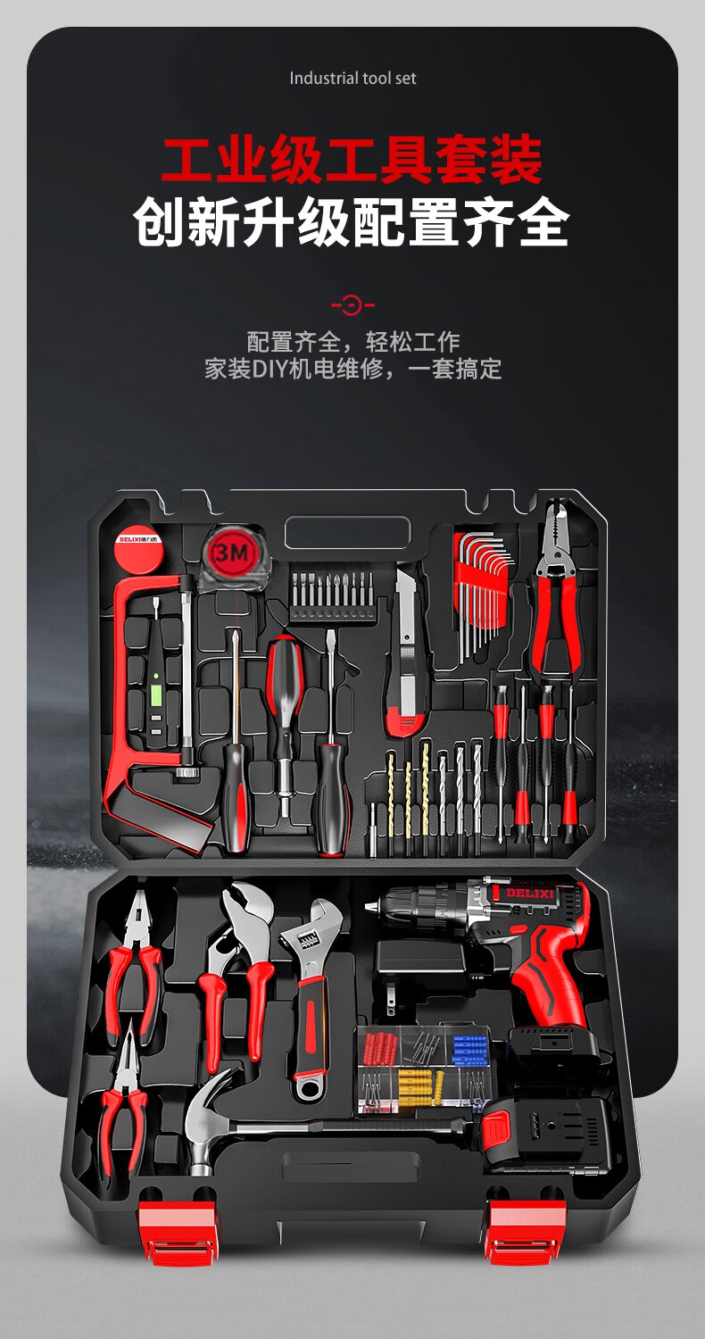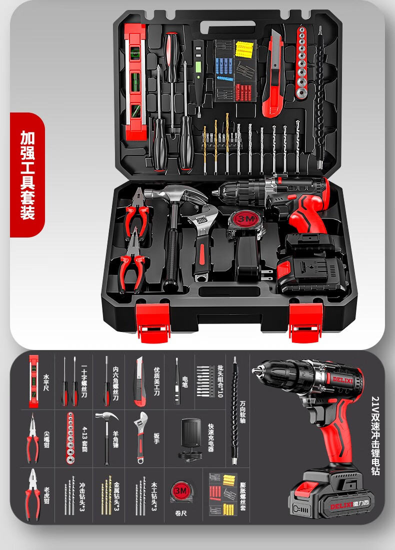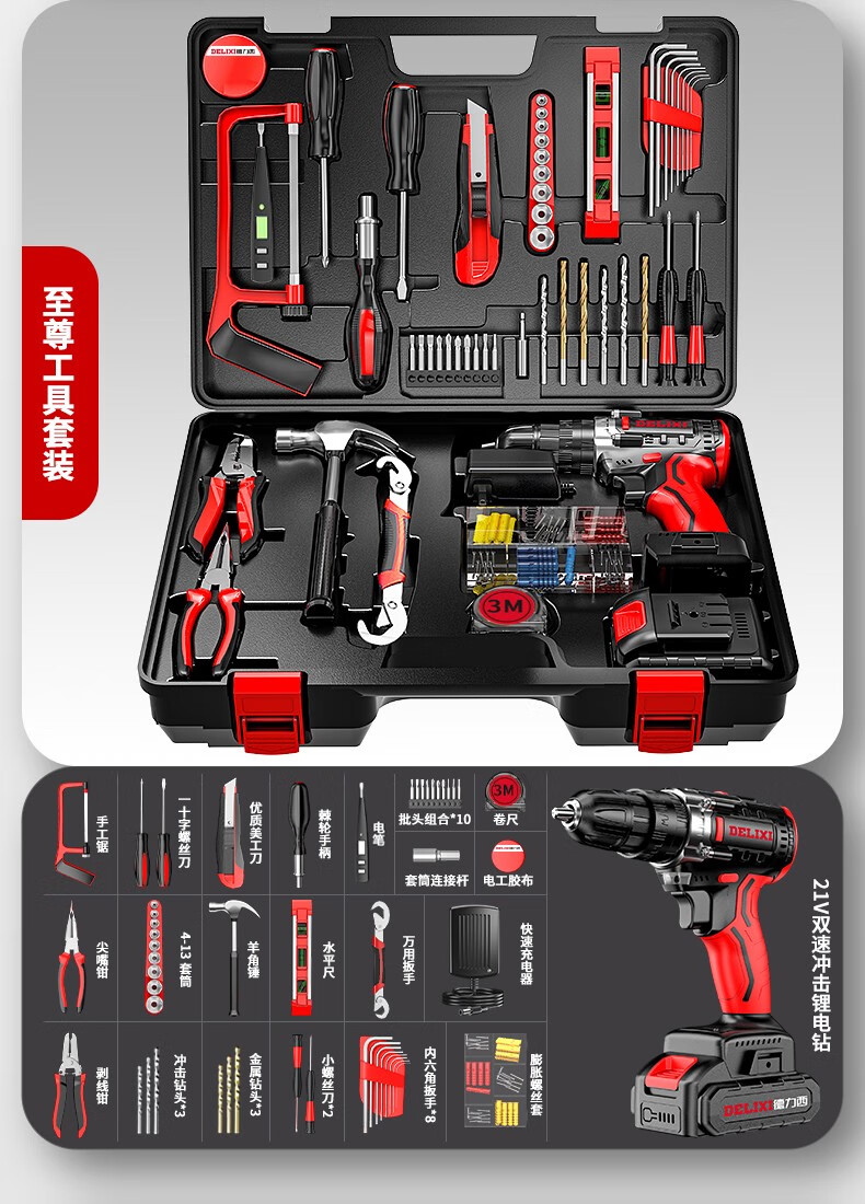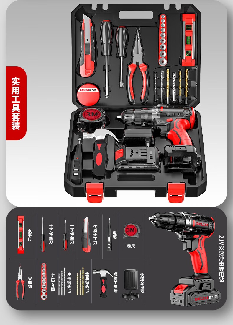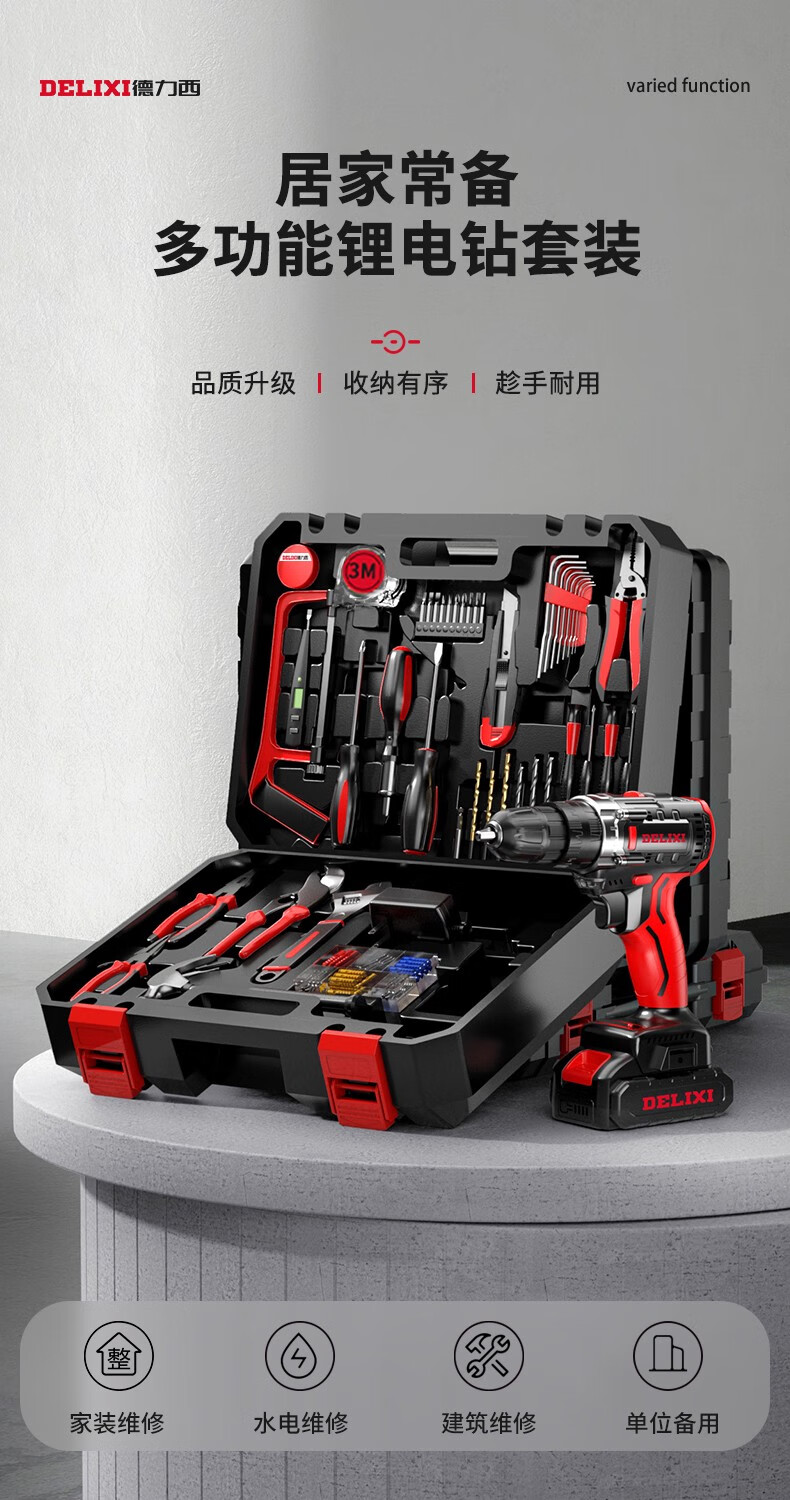 Delixi household lithium electric drill tool set hardware electrician woodworking special repair multi-functional tool box collection practical tool set + 21V double-speed impact electric drill