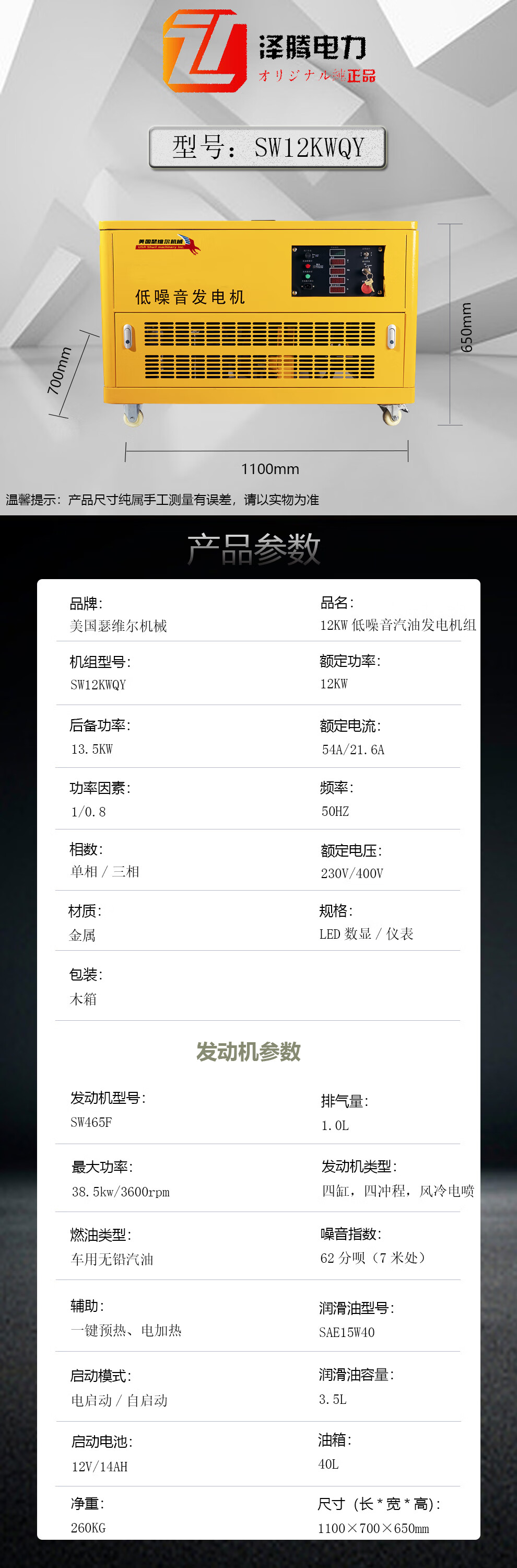 Sewell 12KW low-noise gasoline generator SW12KWQY three-phase electric start, full power and stable operation, vehicle-mounted