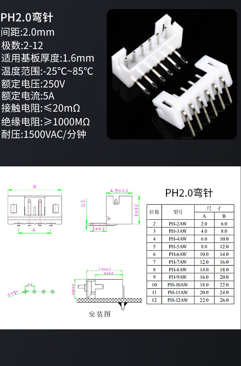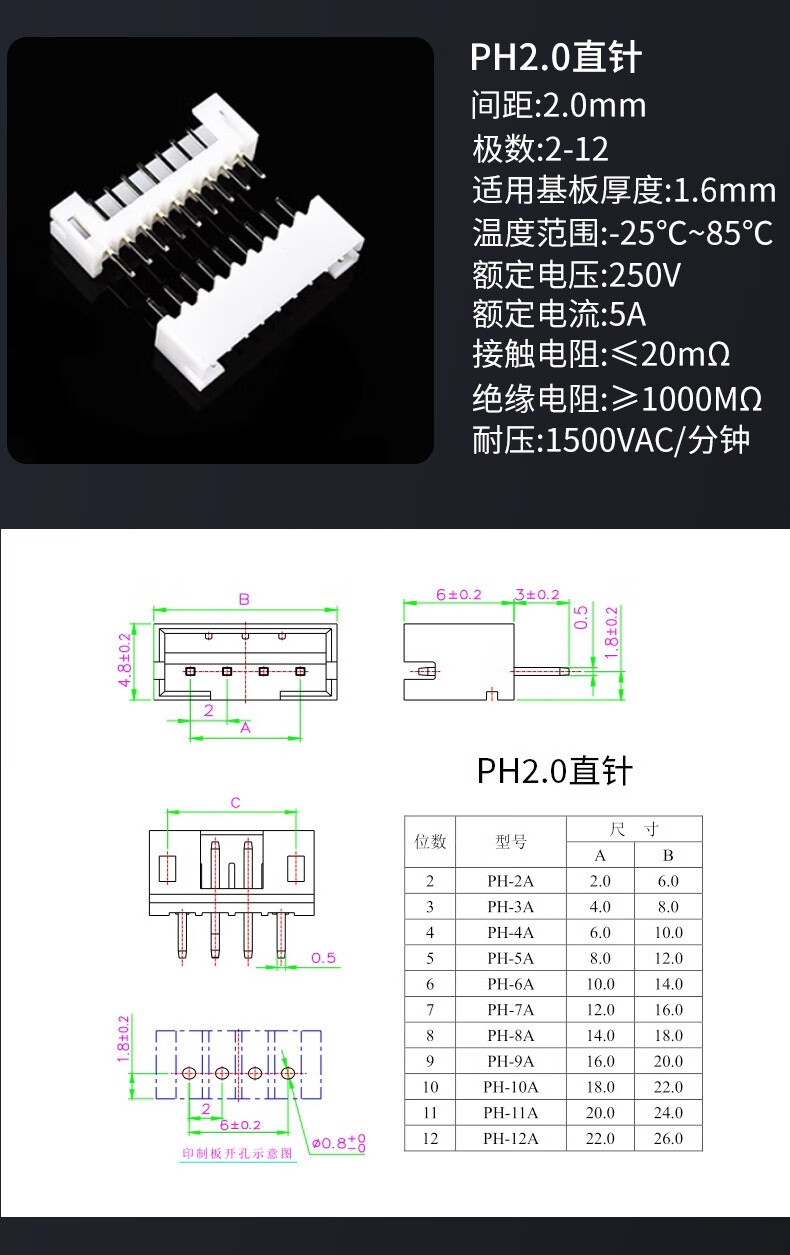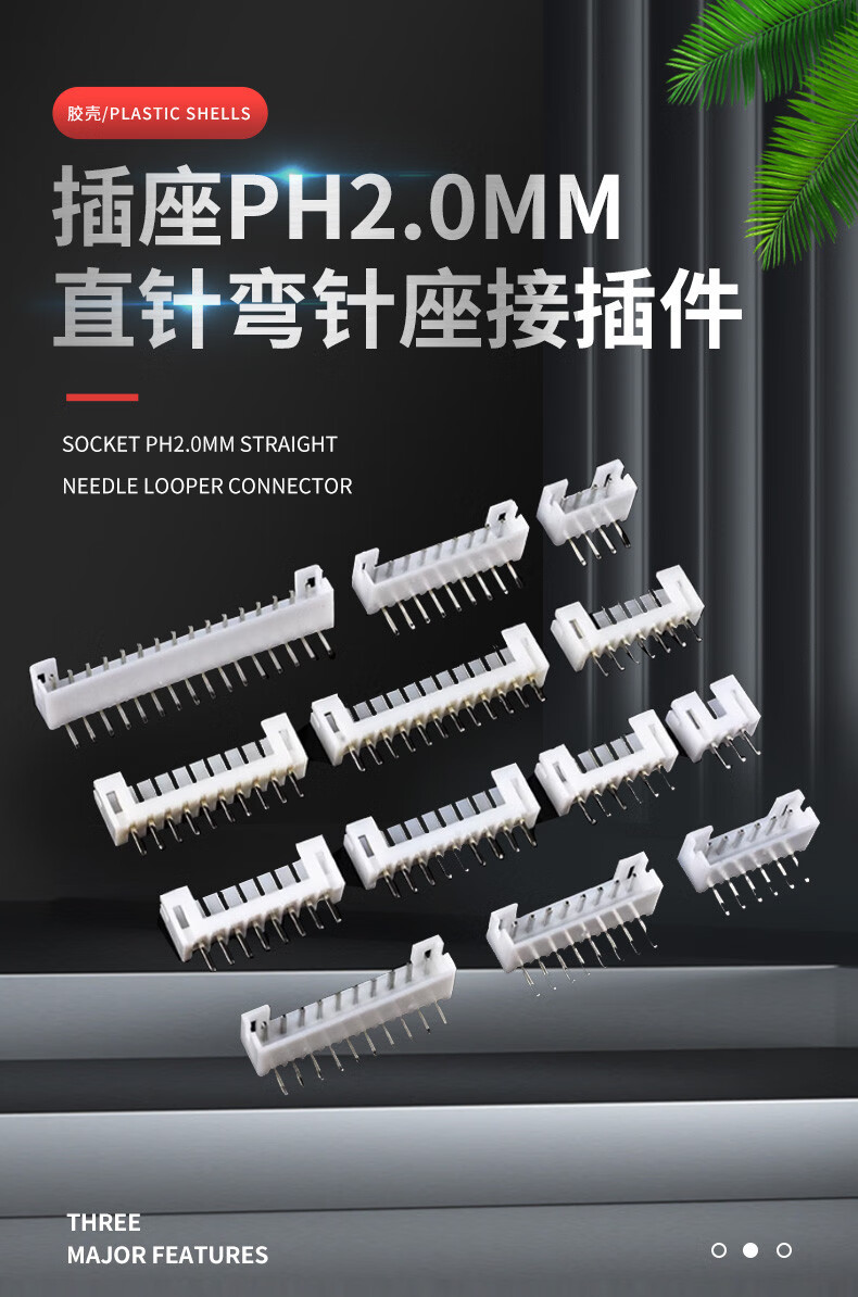 Socket PH2.0mm pitch straight pin curved pin base connector 2/3/4/5/6/7/8/9/10/12/16P plastic shell straight pin 2P (50 pieces)