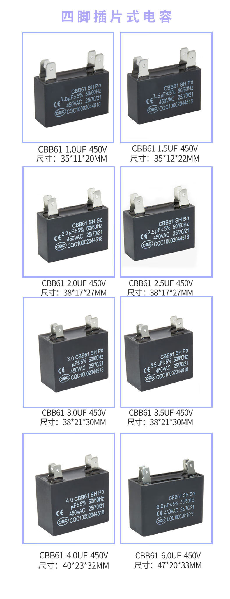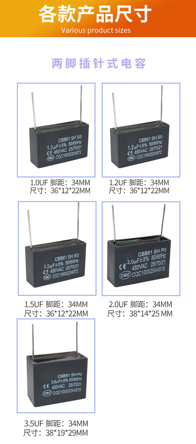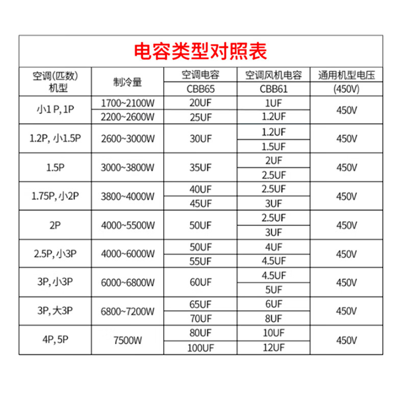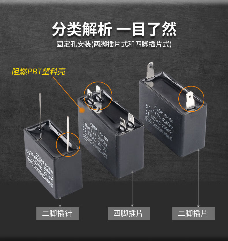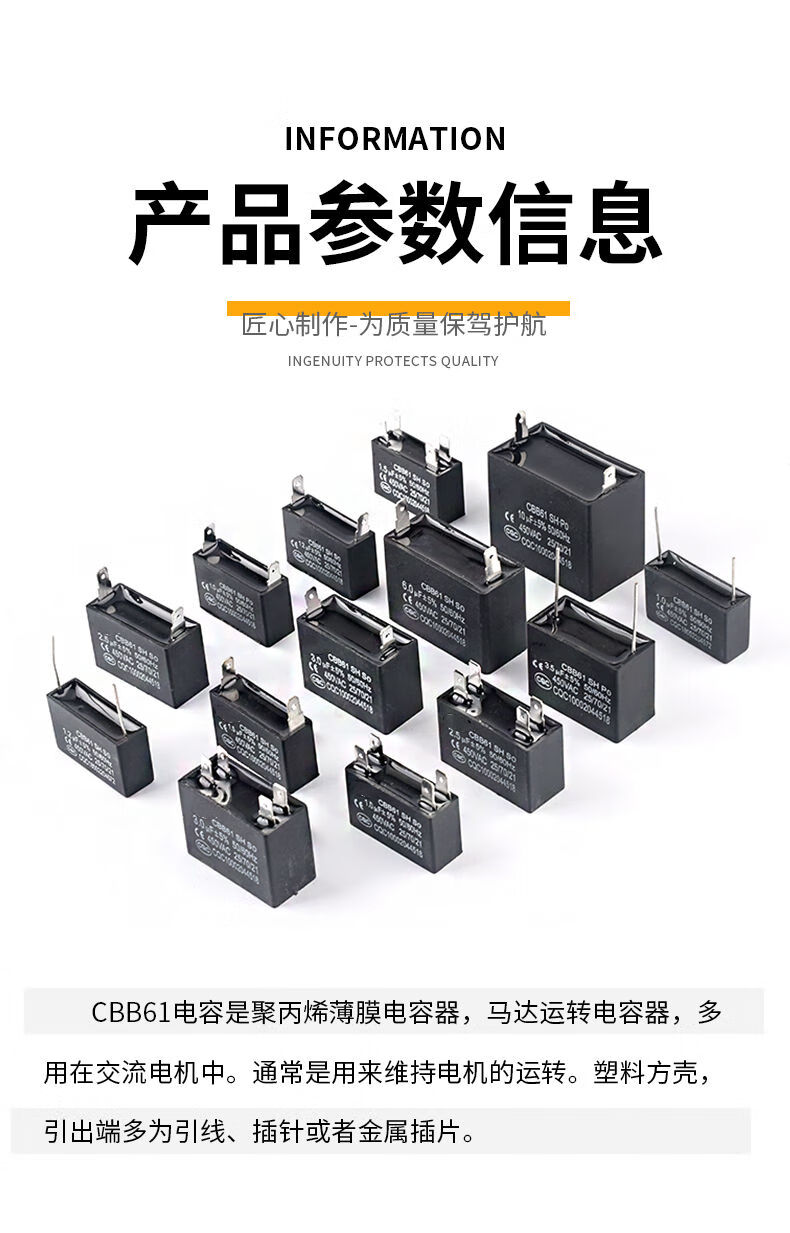 CBB61 air conditioning fan capacitor 1/1.5/2/2.5/3/3.5/4/4.5/5/6/8UF starting capacitor 450V CBB61 two-pin insert 5.0UF