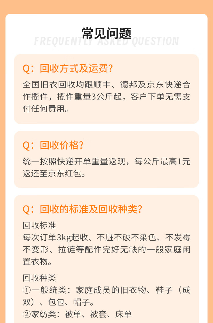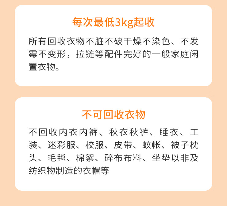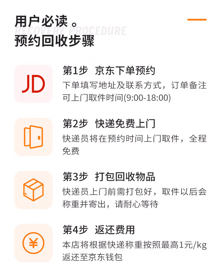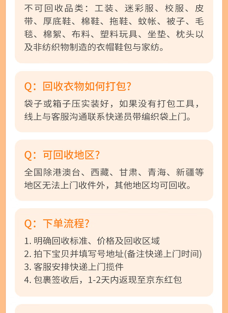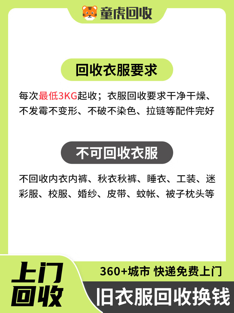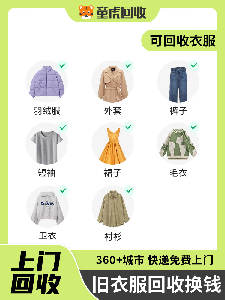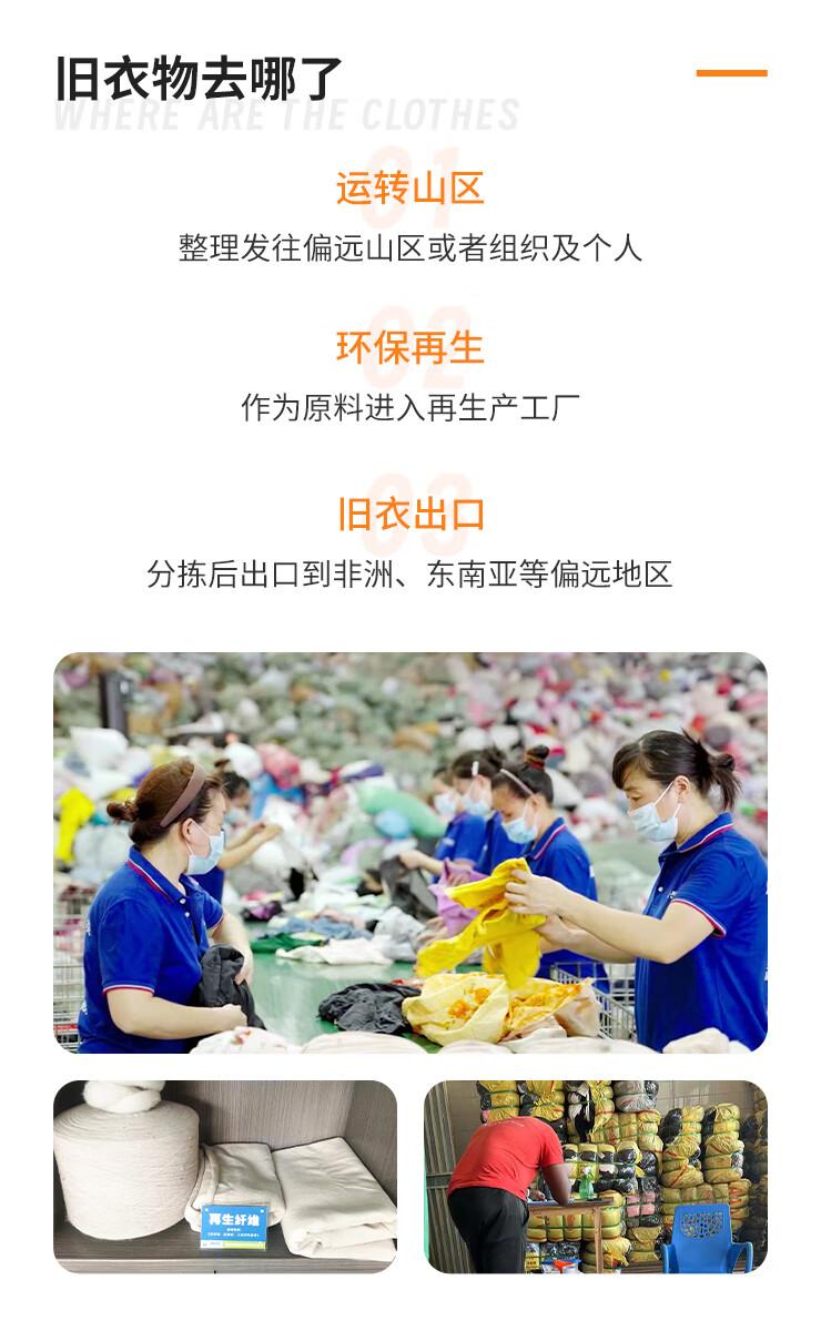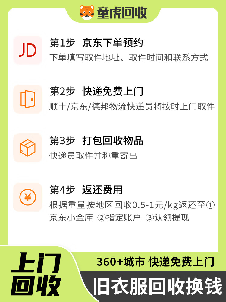 Door-to-door recycling of old clothes. Door-to-door recycling of clothes, shoes and bags is convenient, fast and environmentally friendly. After placing an order, contact customer service to make an appointment.