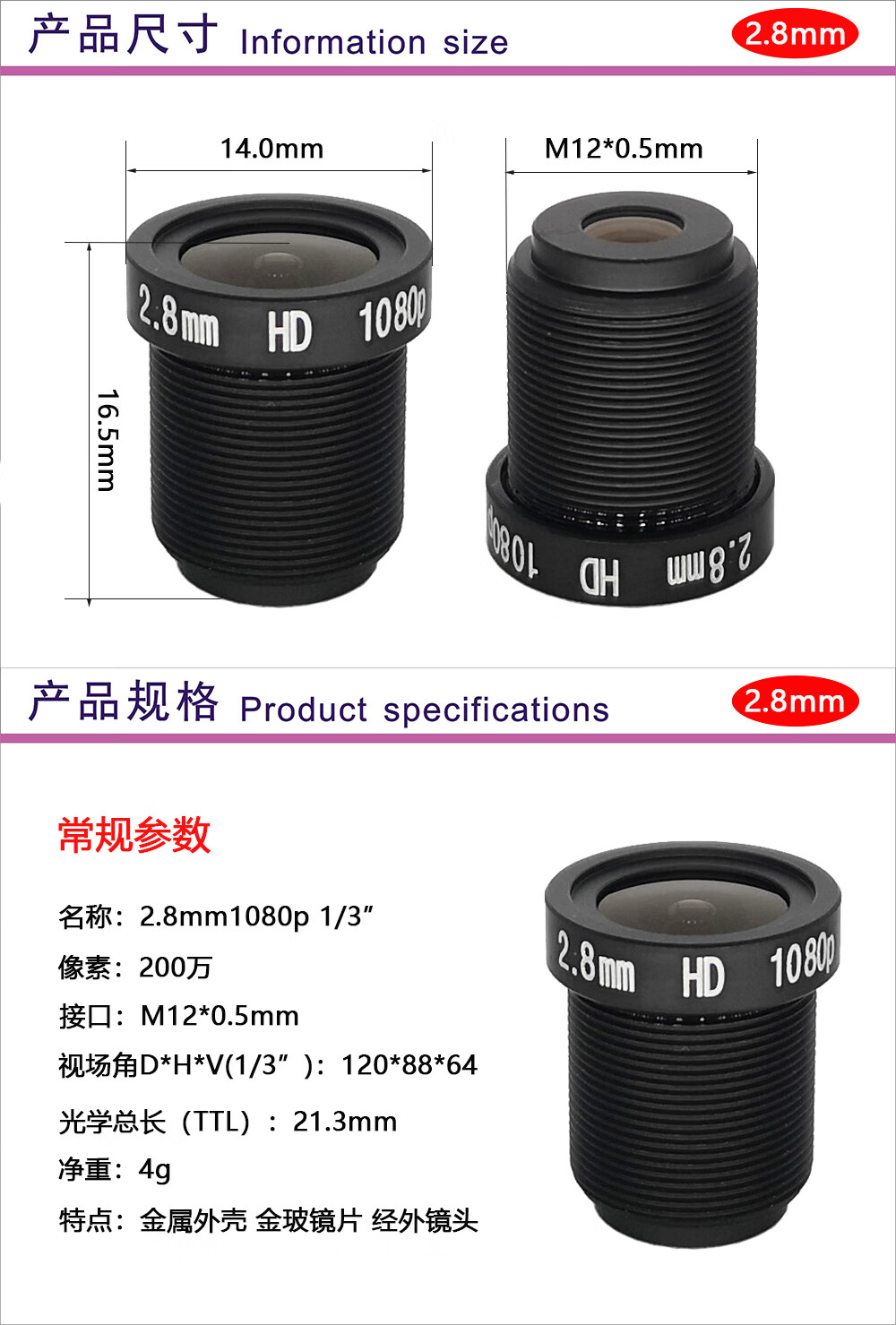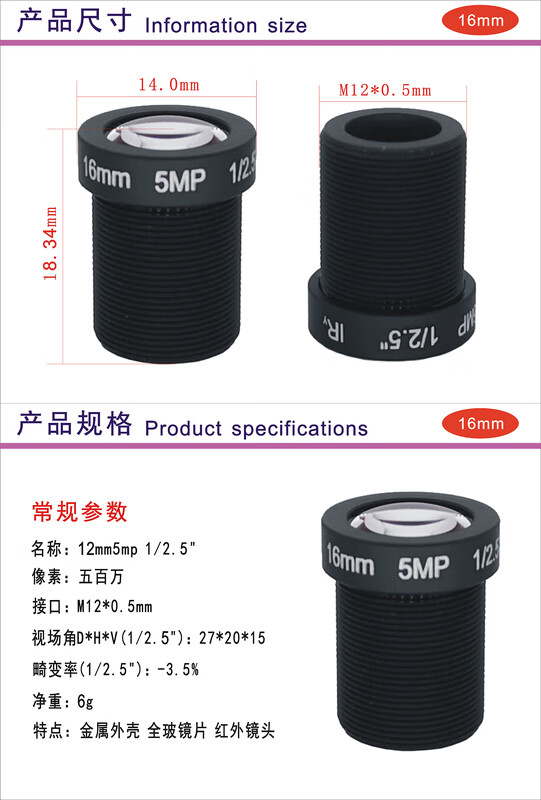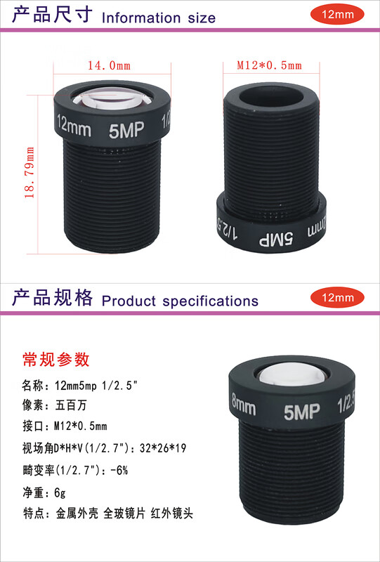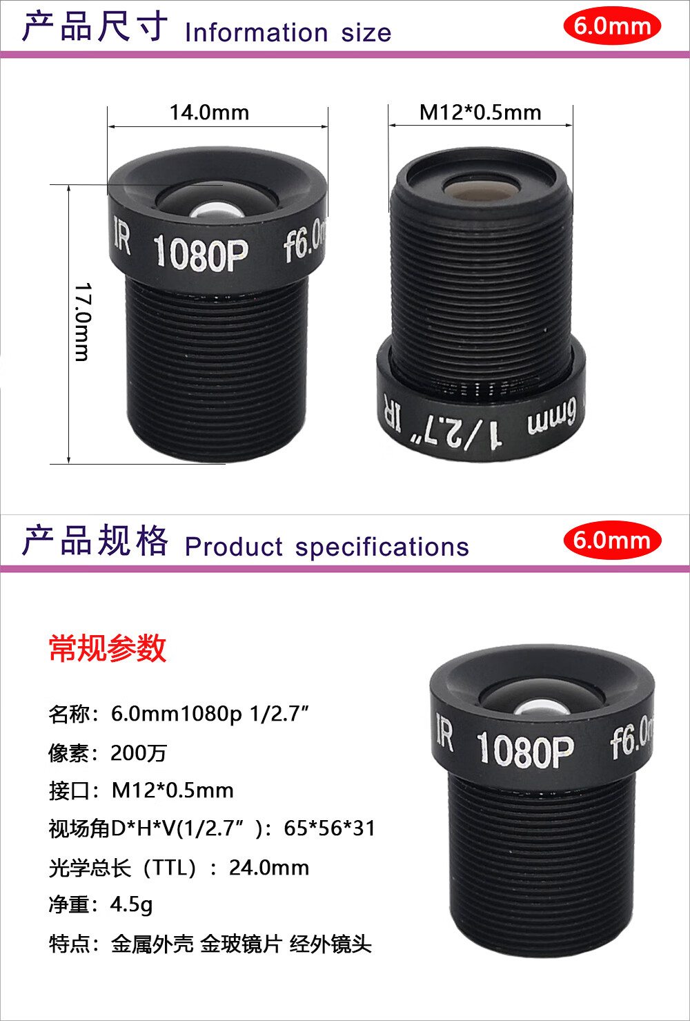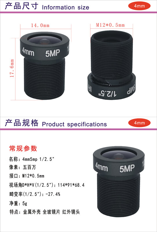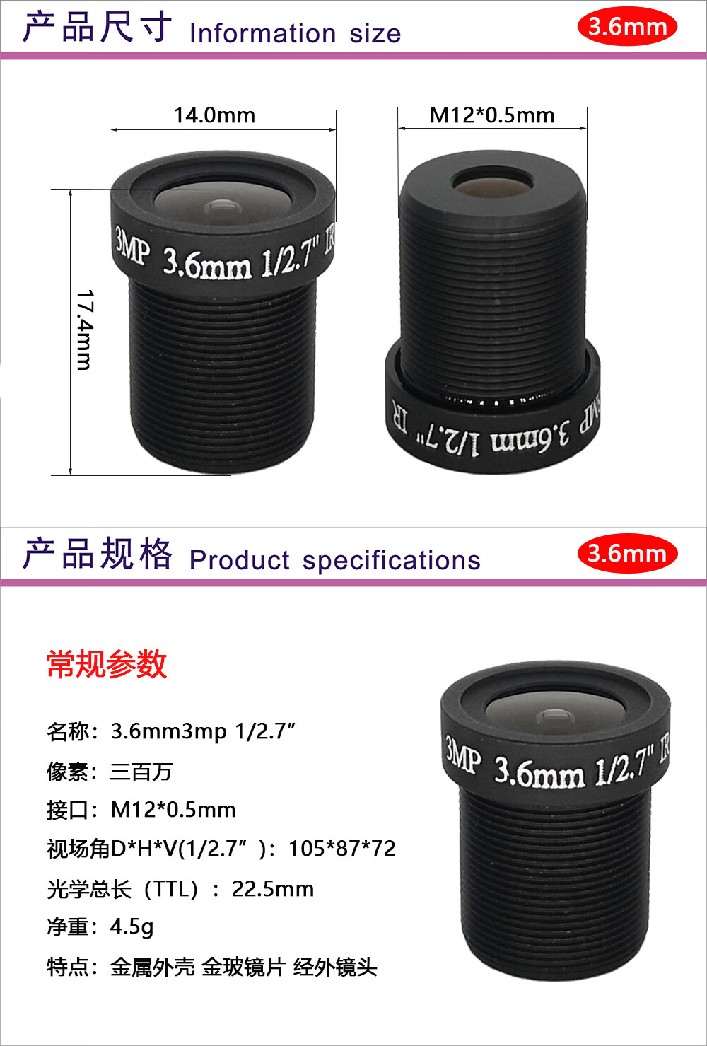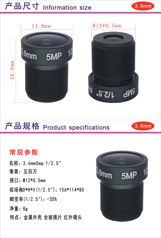 5 million HD surveillance camera infrared M12 lens 2.84681216mm 1080p 4mm