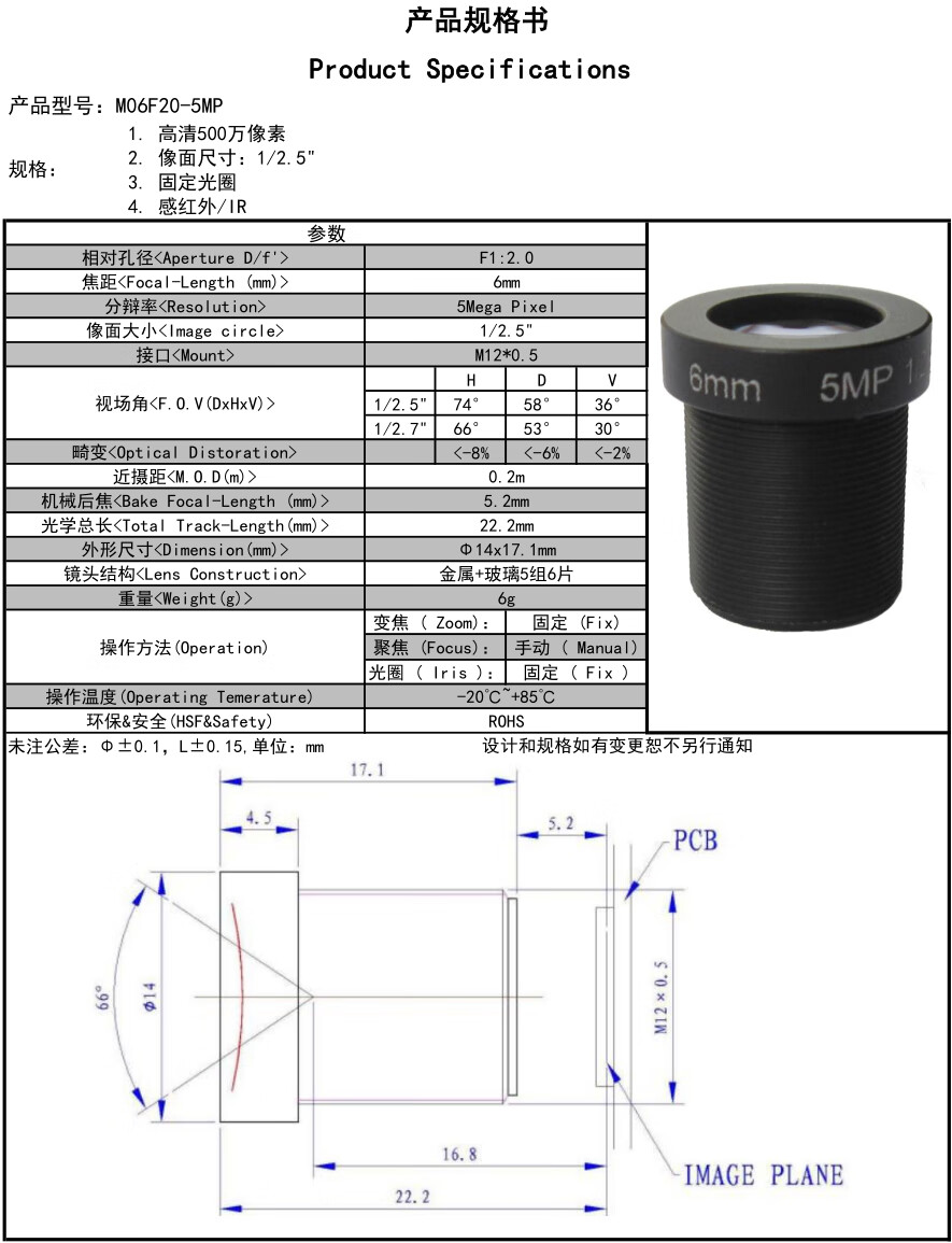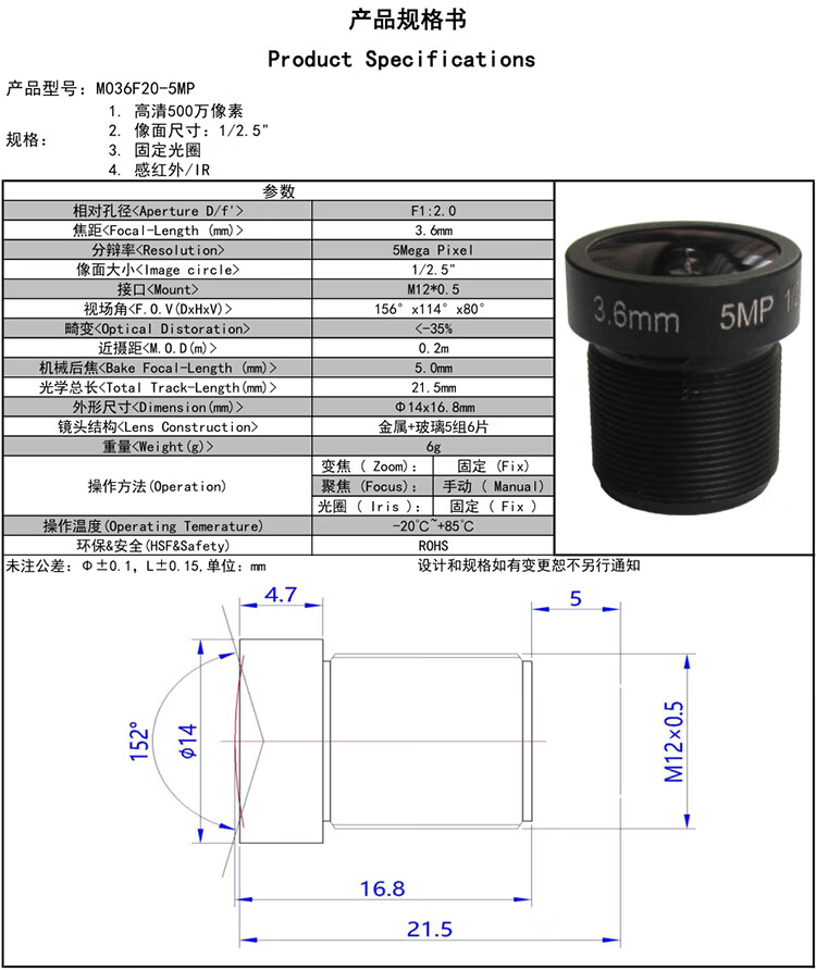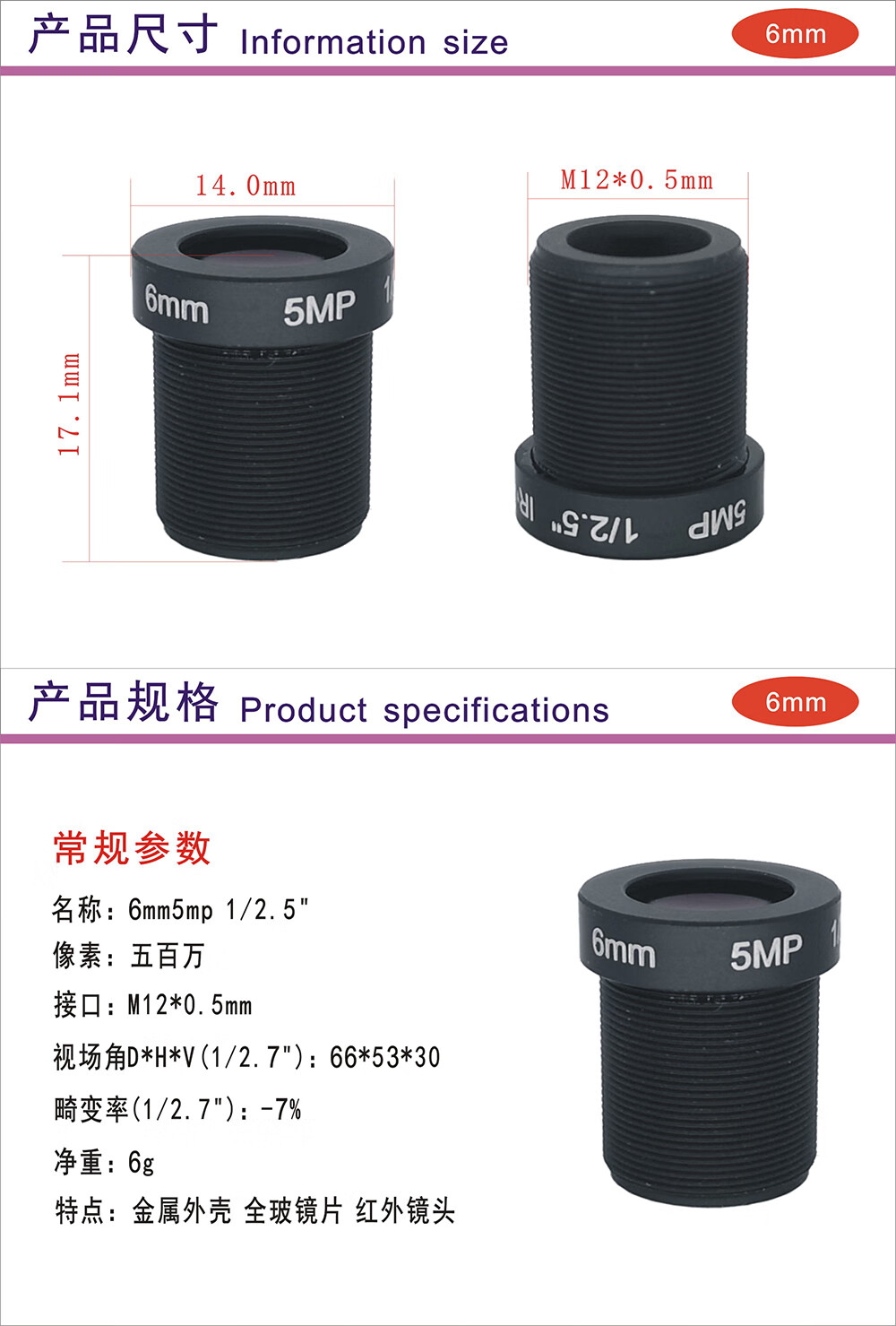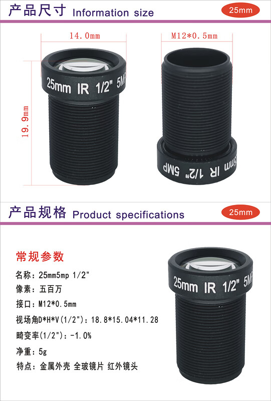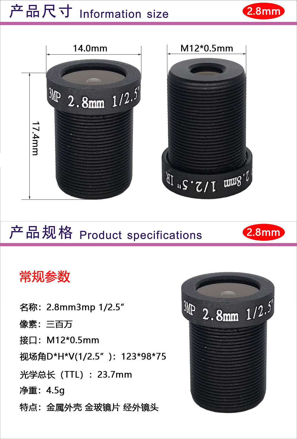 5 million HD surveillance camera infrared M12 lens 2.84681216mm 1080p 4mm