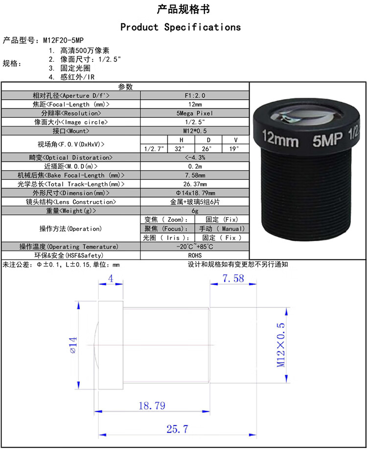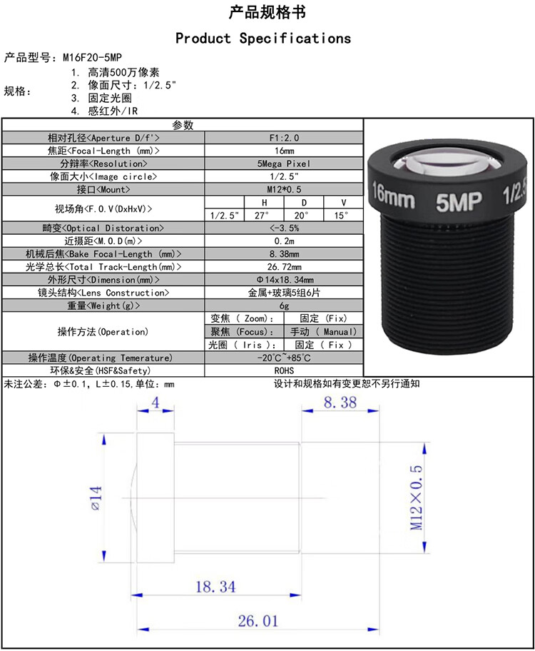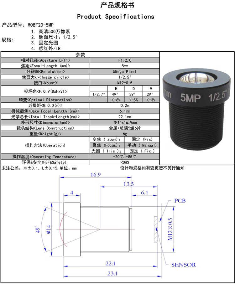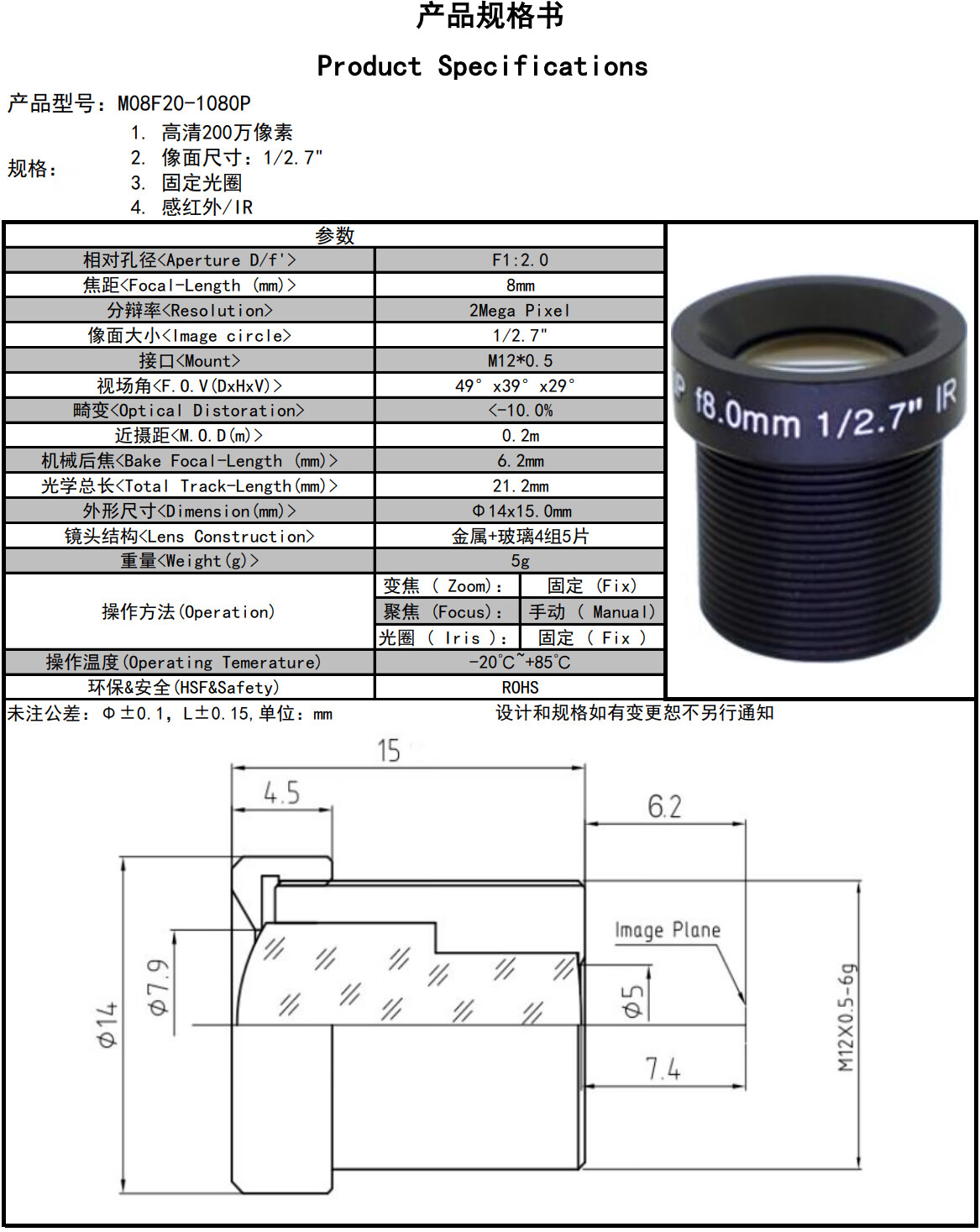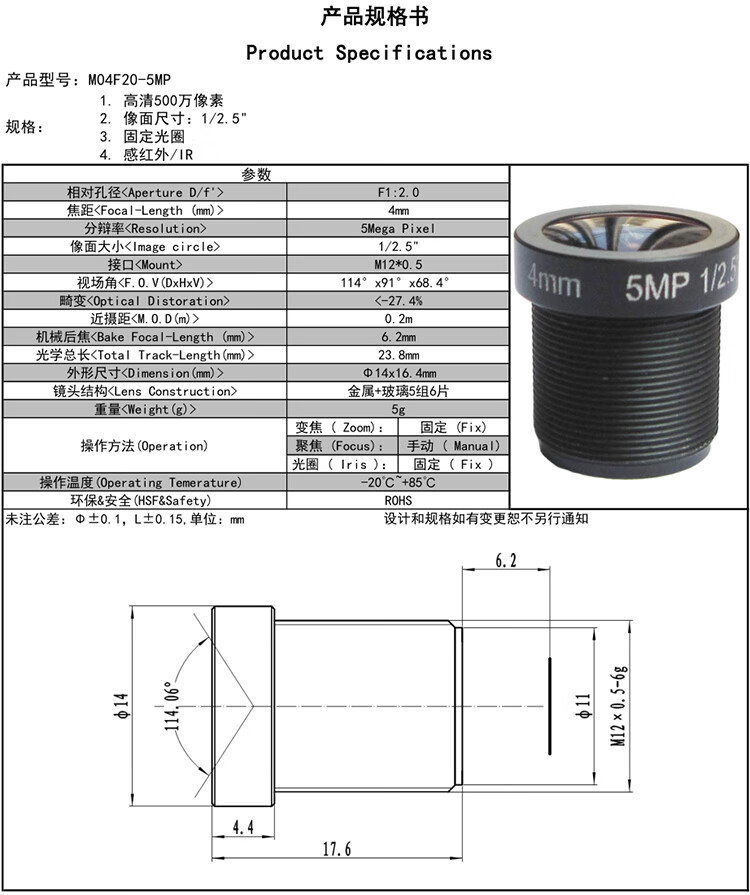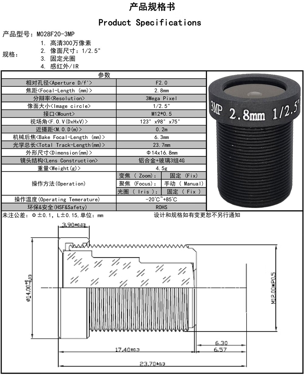5 million HD surveillance camera infrared M12 lens 2.84681216mm 1080p 4mm