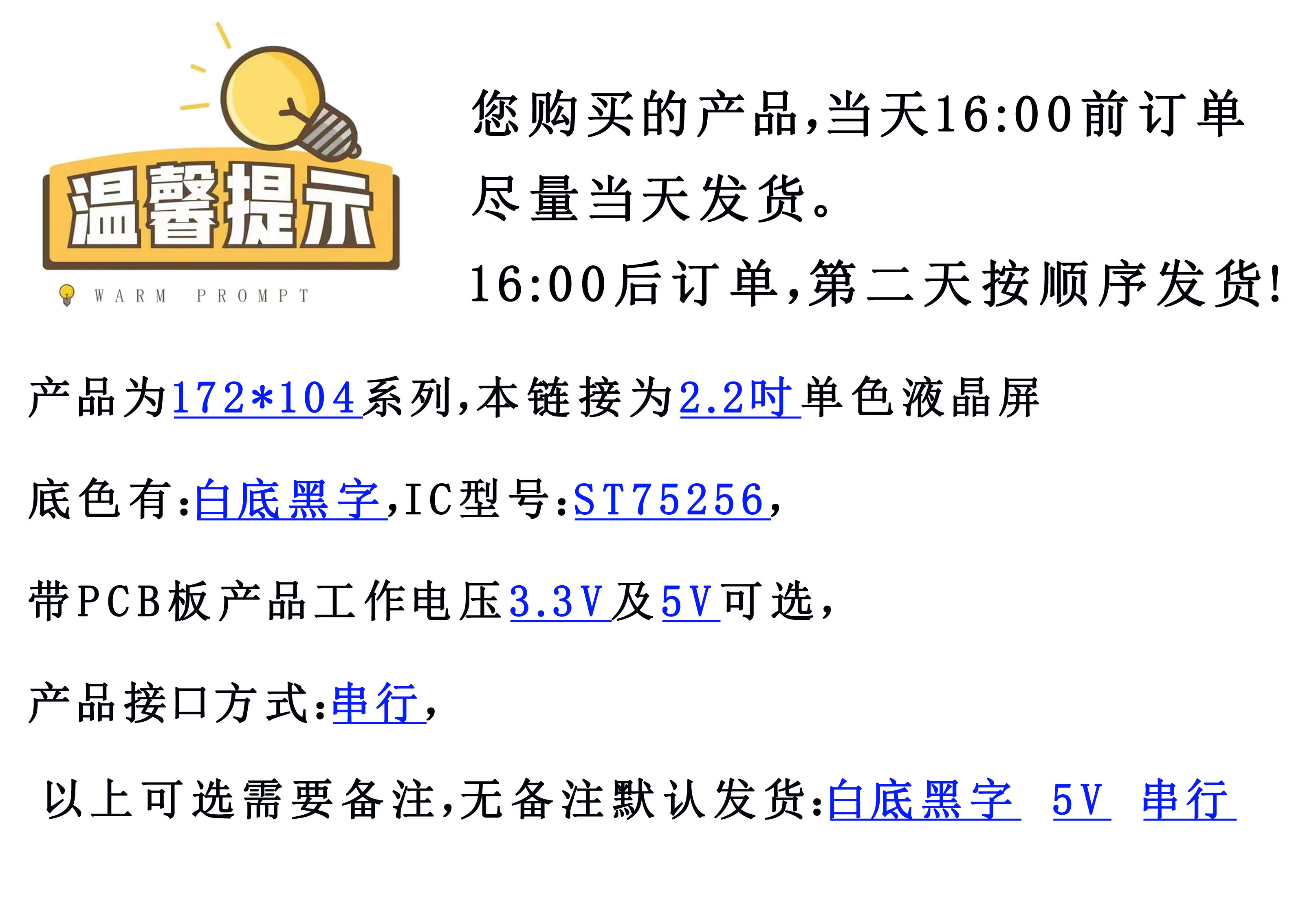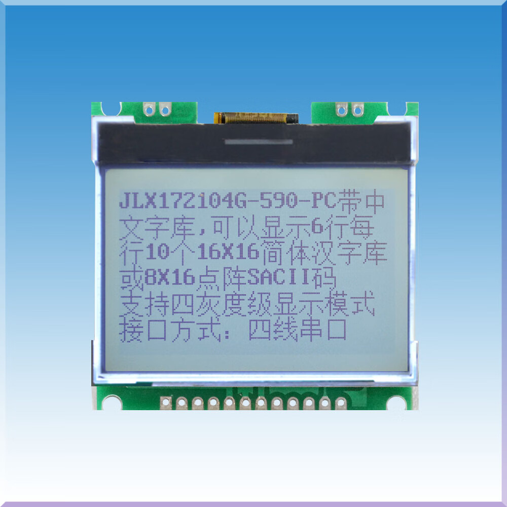 172104G-590 LCD module 172104 dot matrix LCD screen SPI interface G-590-BN welded FPC (bare screen) Background color Black text on white Operating voltage 3.3V/5V optional (remarks required) Interface type Serial port