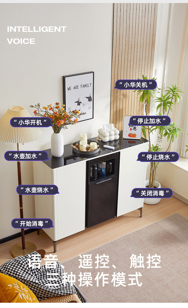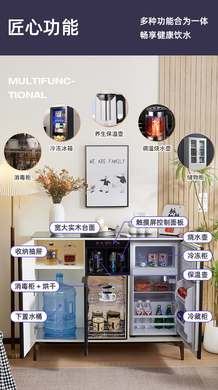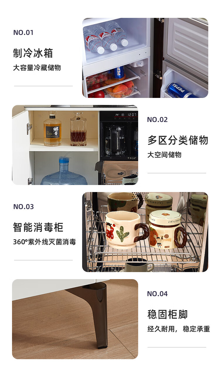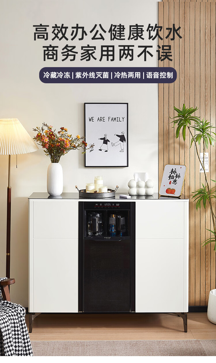 Smart tea bar machine with refrigerator integrated storage cabinet fully automatic sideboard water dispenser for living room and office with voice milk white hot and cold type three doors with refrigerator for disinfection 1170*400*970