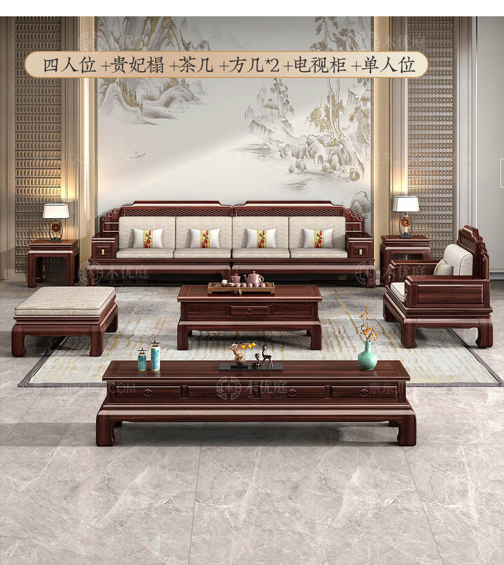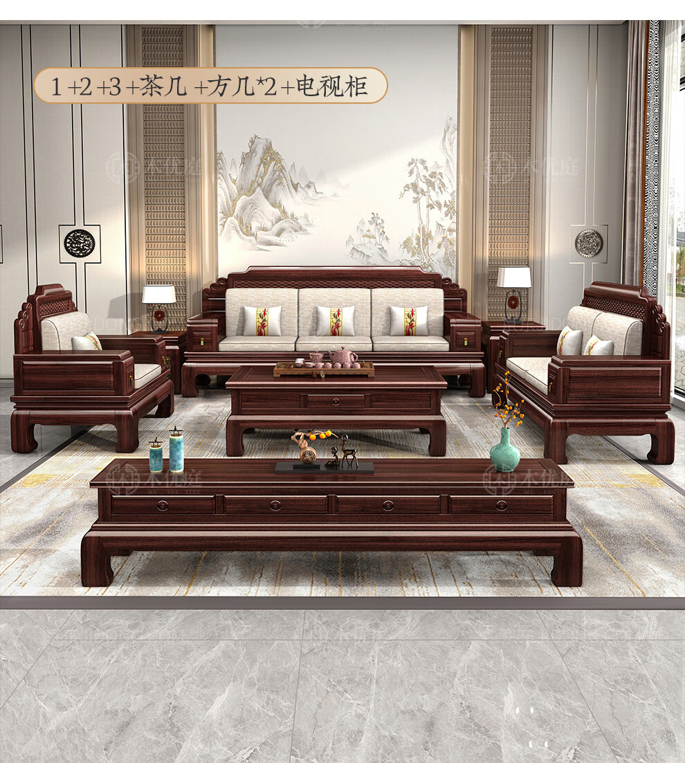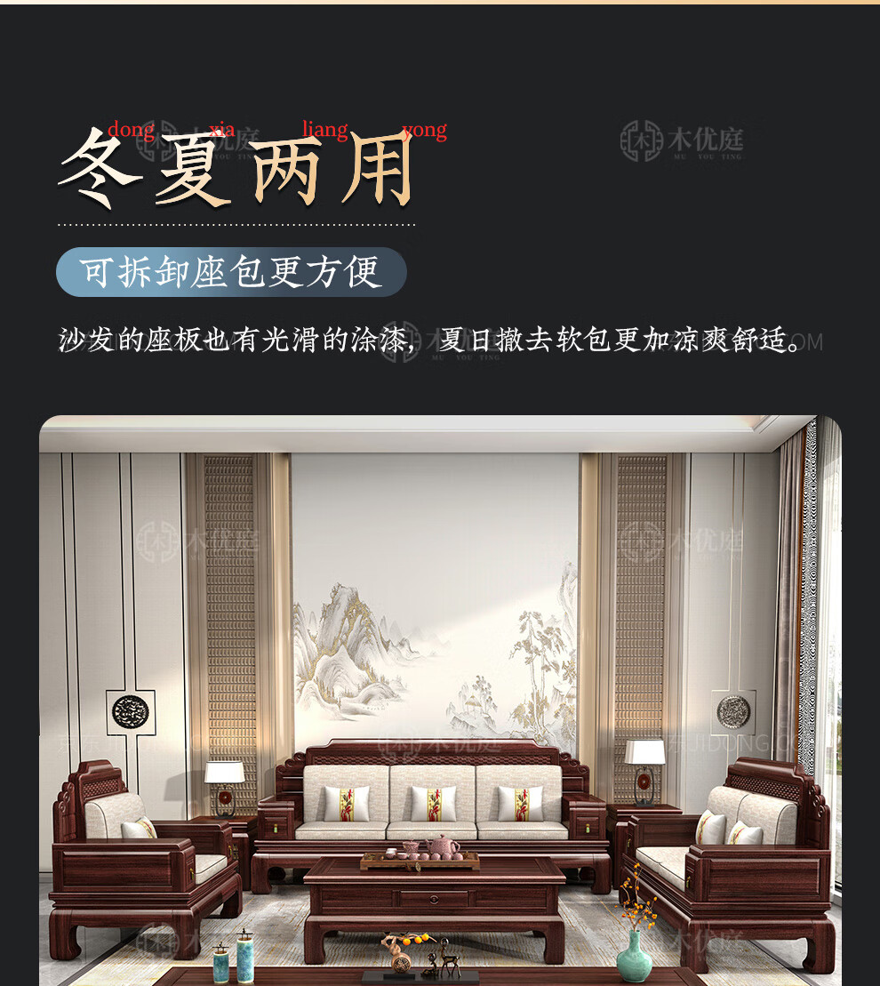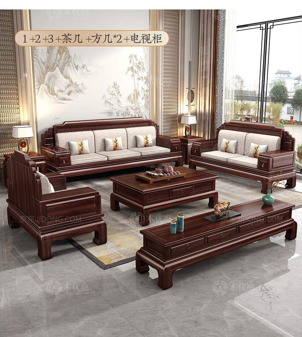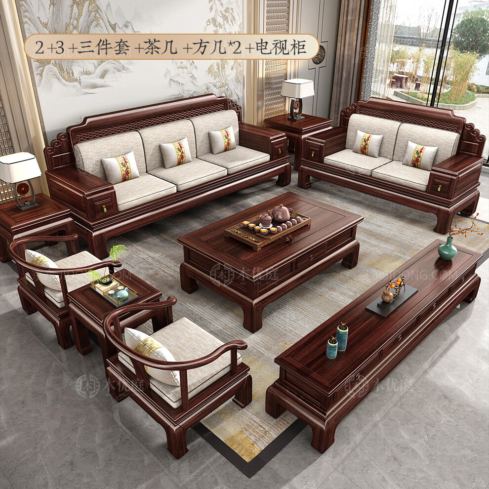 Muyouting Wujin wood new Chinese style all solid wood sofa living room winter and summer dual use simple log sofa small apartment combination set 1+2+3+ coffee table
