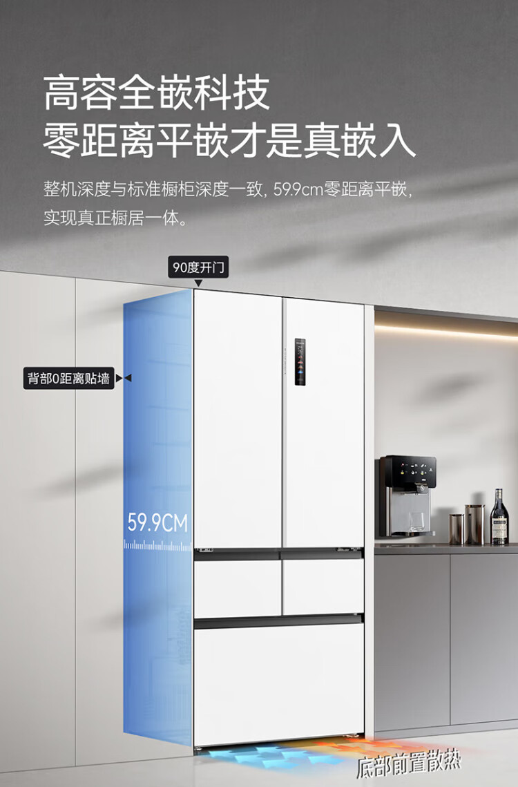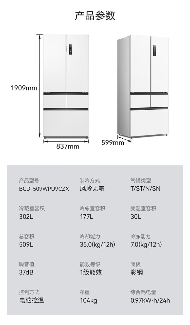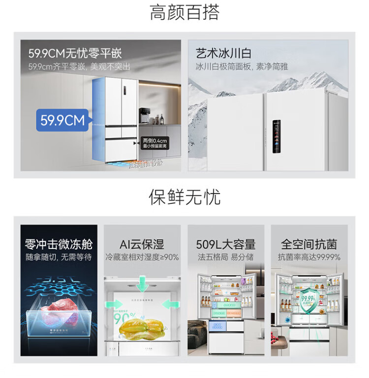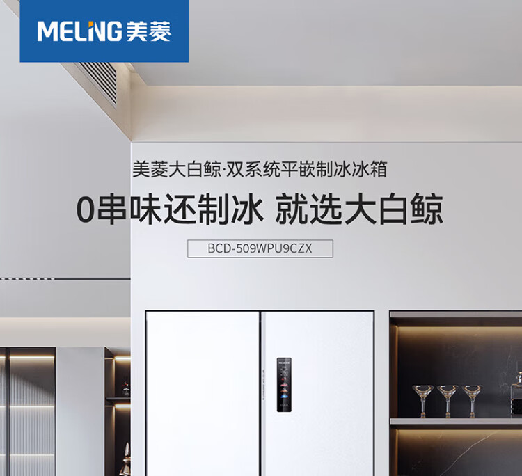 Meiling (MeiLing) Beluga 509 French five-door double-door large capacity 59.9cm ultra-thin zero-flat embedded dual system micro-freezing fully clean automatic ice making first-class air-cooled energy-saving refrigerator subsidy BCD-509WPU9CZX-Glacier White