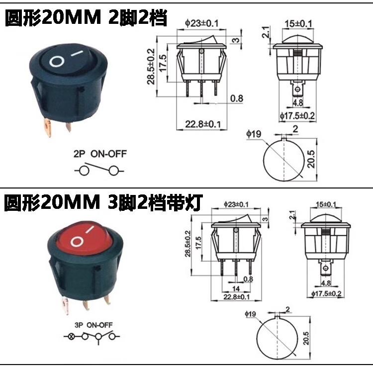 Round KCD1-105 boat-shaped opening 15/20mm button key power supply desk lamp stroller switch 12 24V 220V 3 feet 2 gears red 220V with light 20MM 1 piece